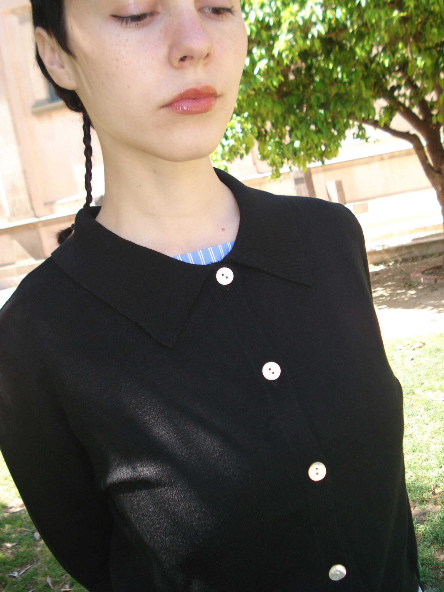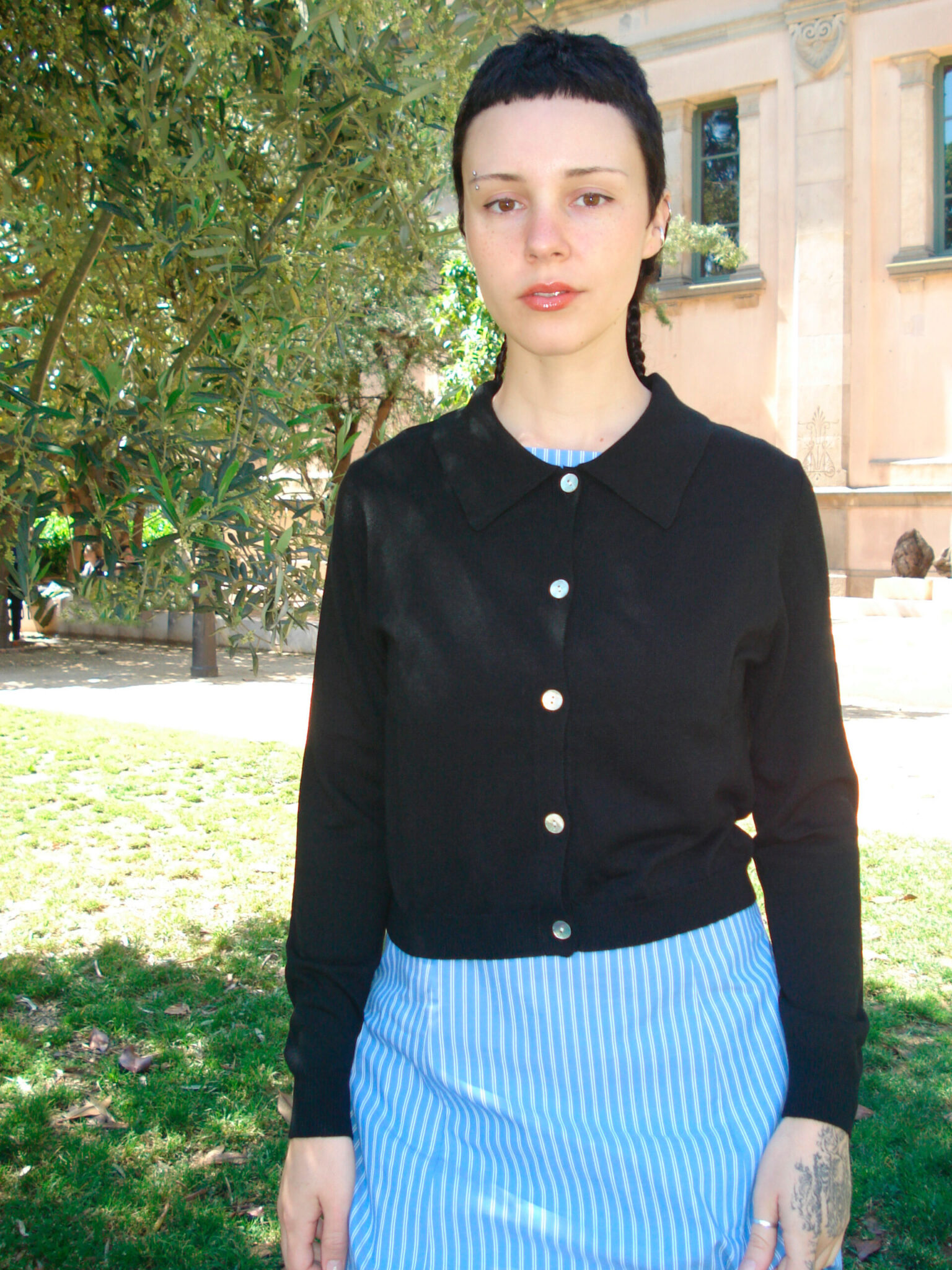 The Anselma cardigan in black is made from a silk and cashmere blend. Designed for a slim fit, it features a cropped length and a shirt collar neckline, complete with mother-of-pearl buttons. The cardigan is also available in ivory.