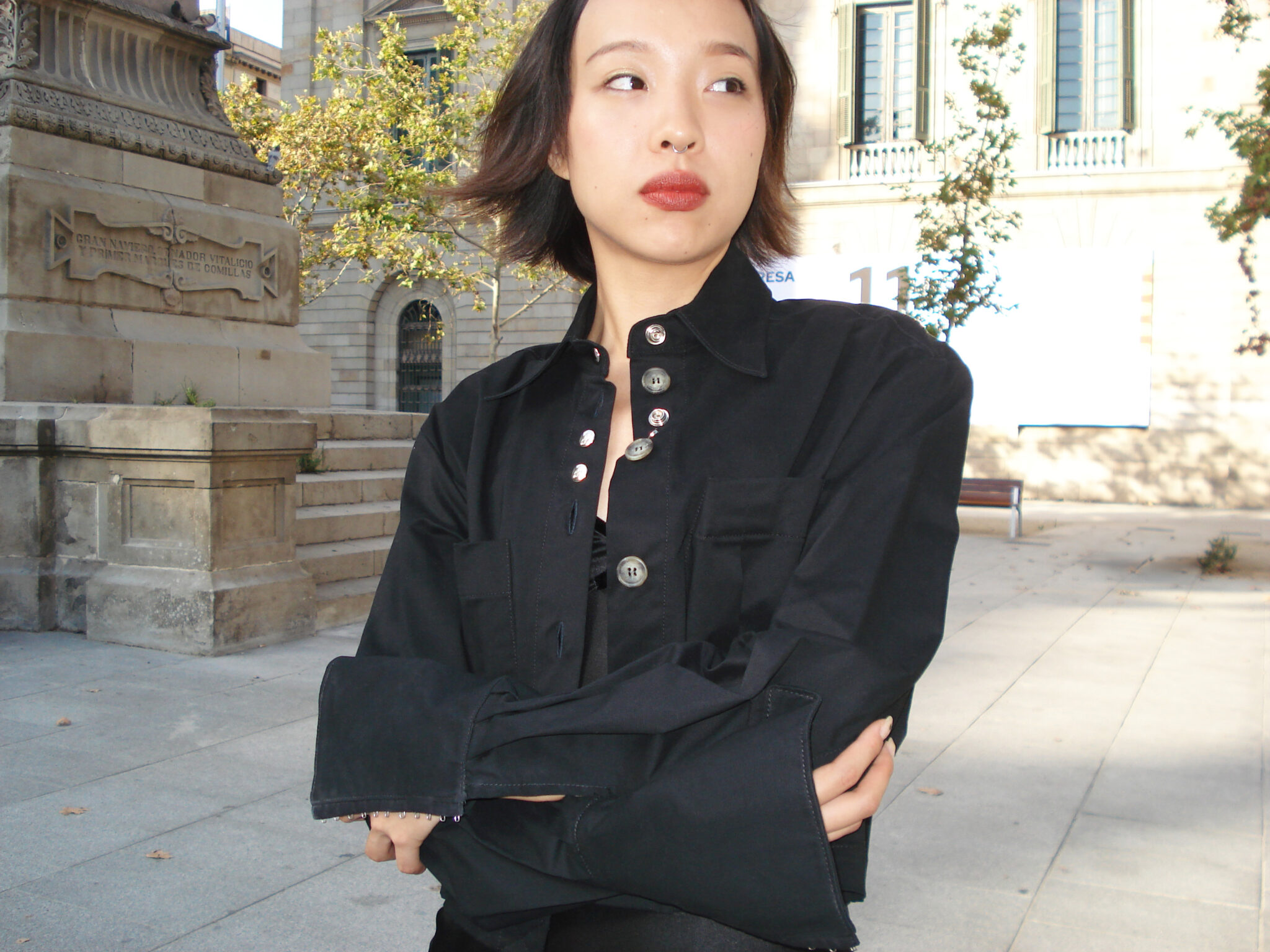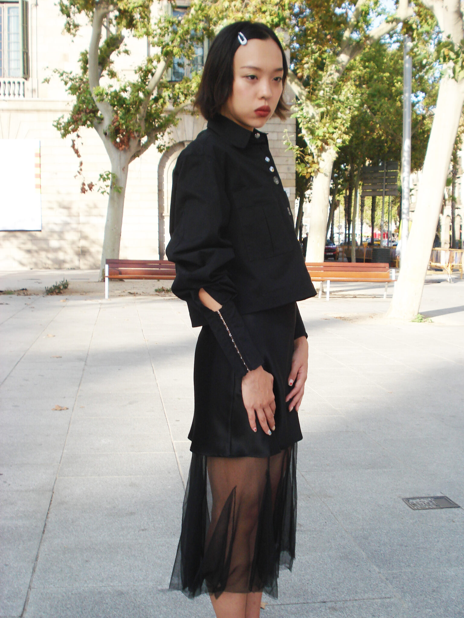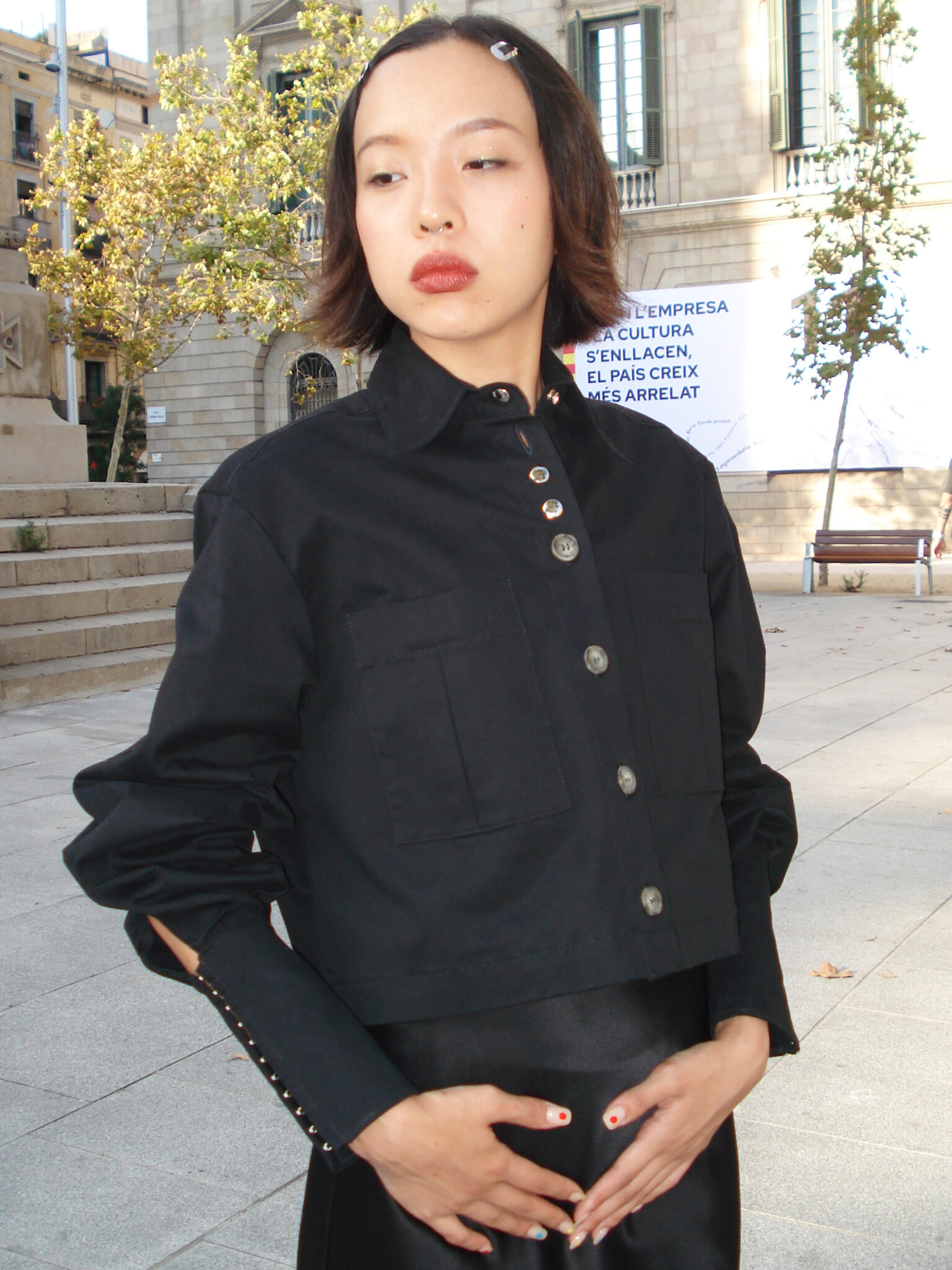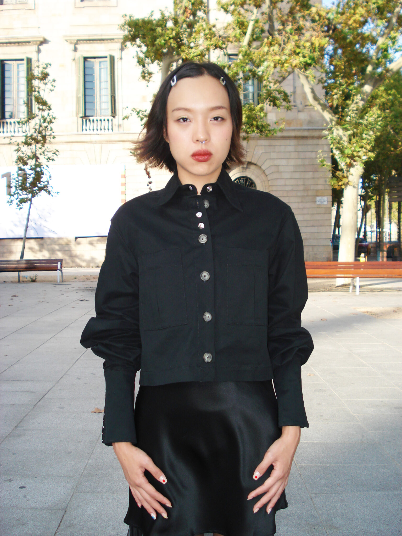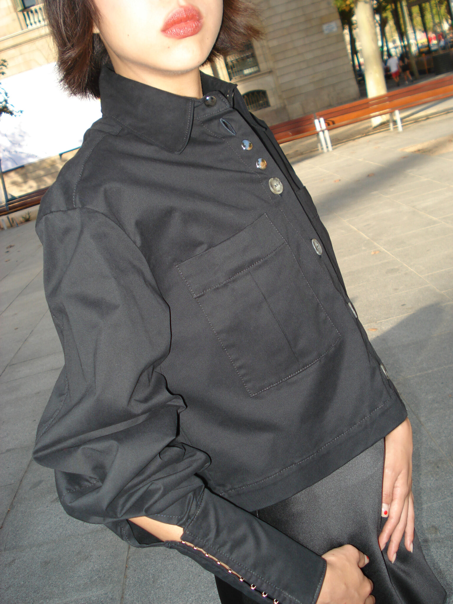 Long-sleeve shirt in black fabric. V-neck and front button closure. Front pockets with pleats. Sleeves with darts and extra-long cuffs featuring snap-tape fastening. Back dart. Eyelets at the underarm. Woven label on the inside.