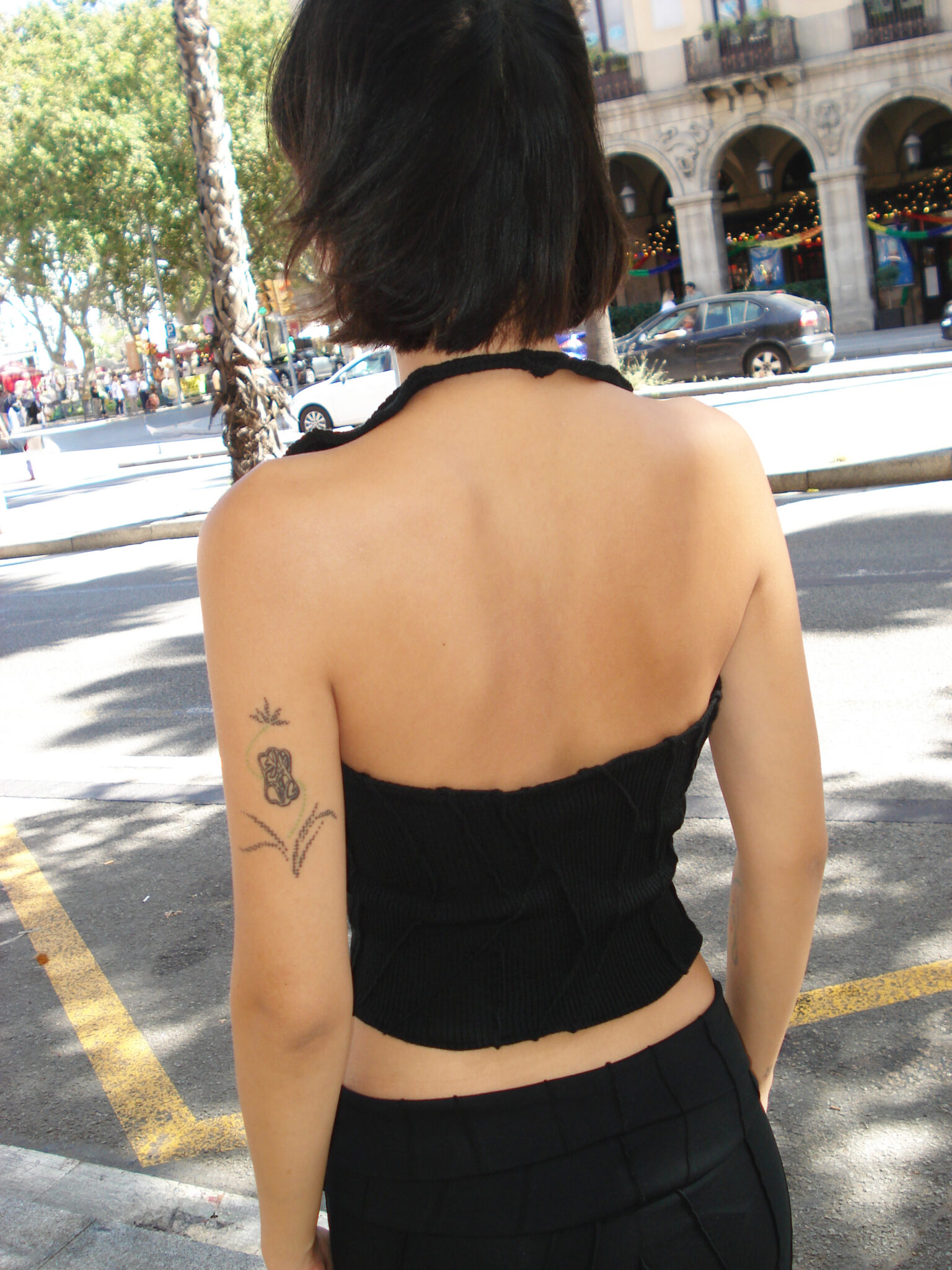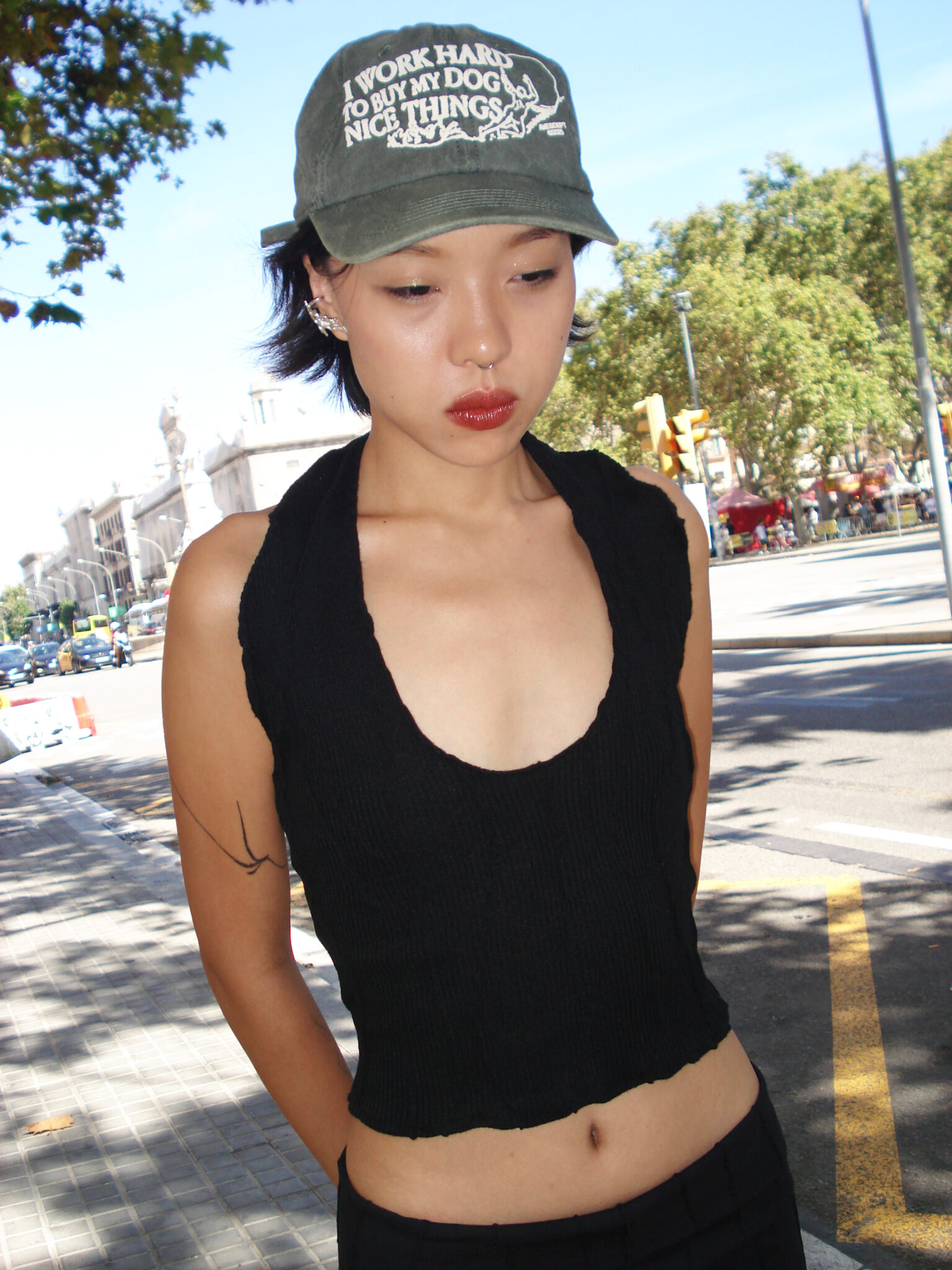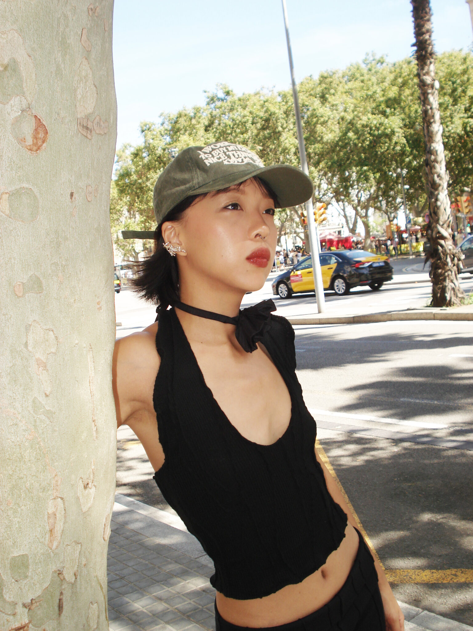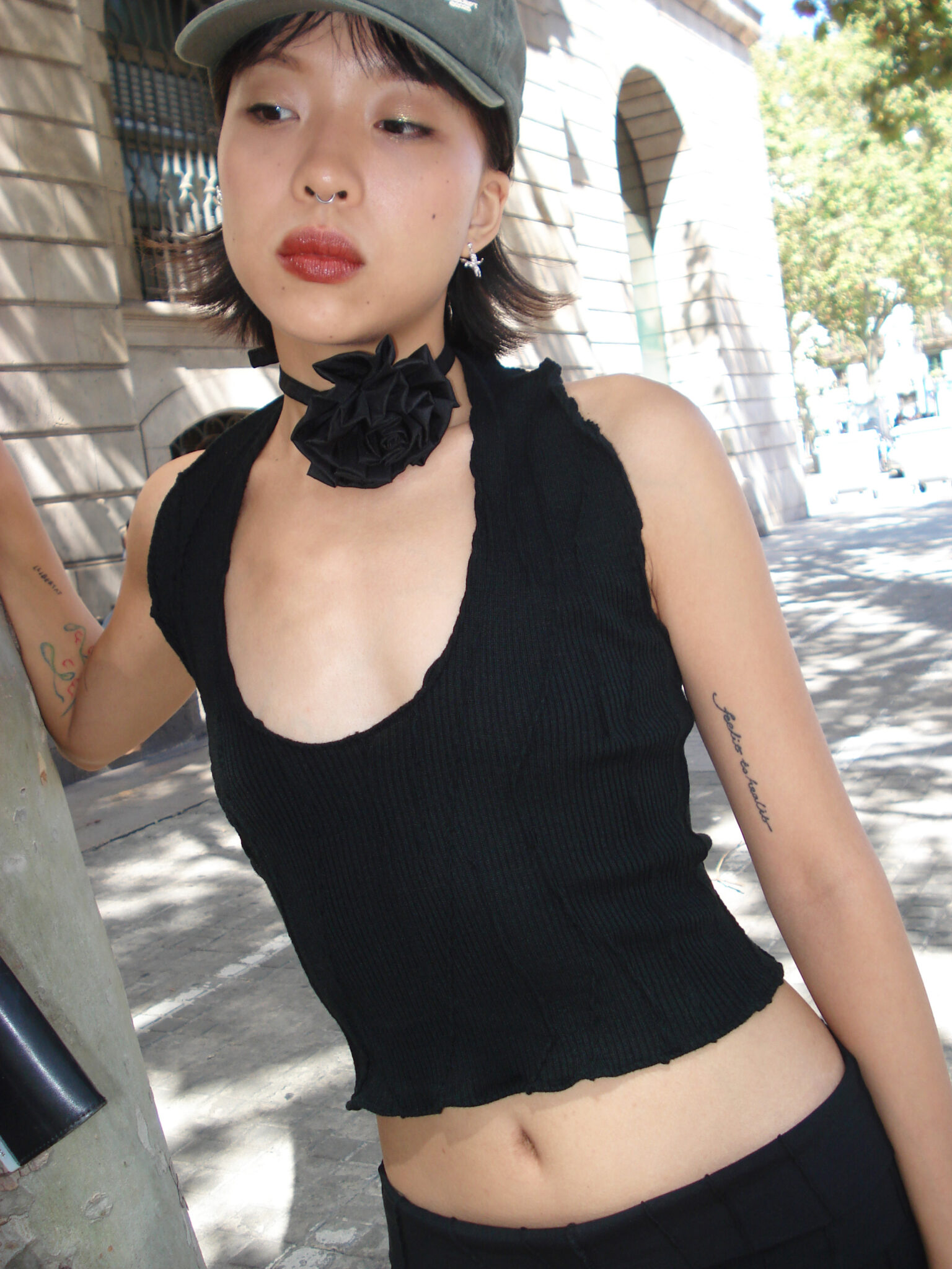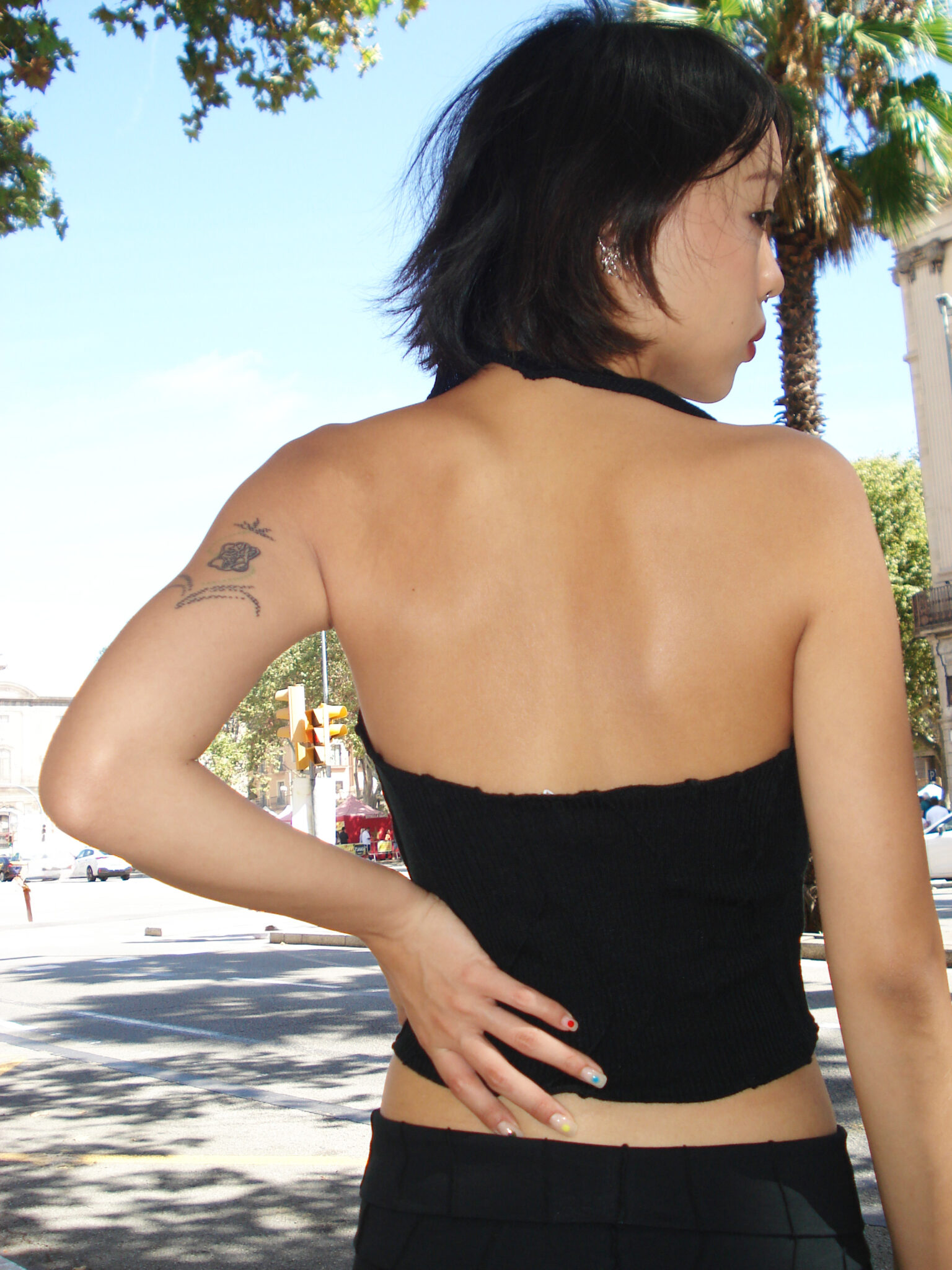 Ribbed knit low-cut halter top. Unique handmade suture formation on each item. Finished garments may vary due to artisanal manufacturing.