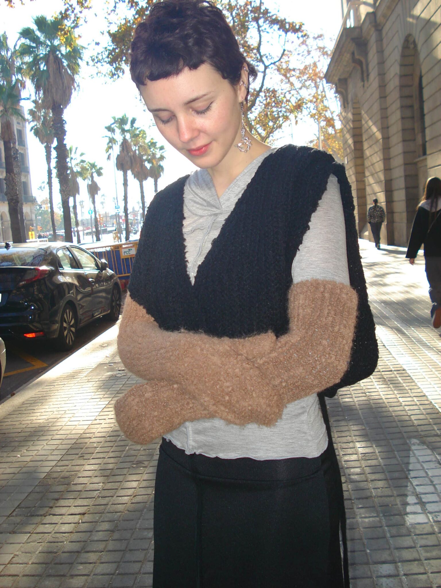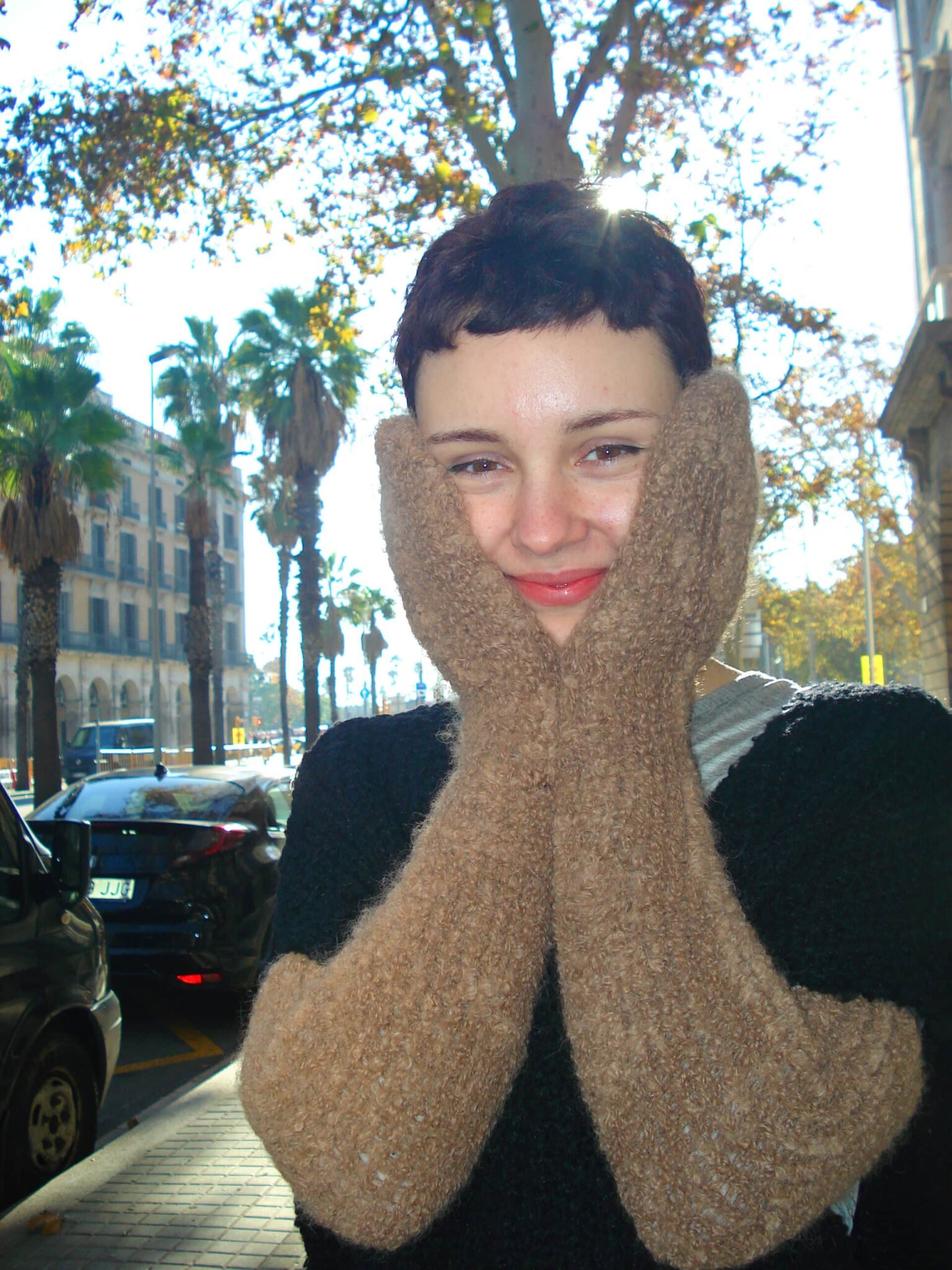 Elbow-length fuzzy mittens knitted in soft and chunky wool alpaca Suri bouclé for extra warmth.