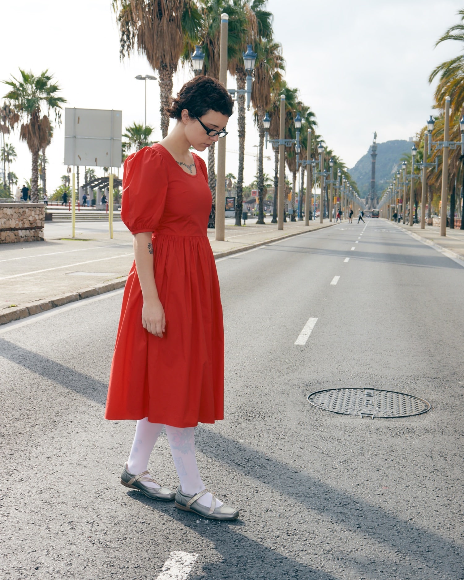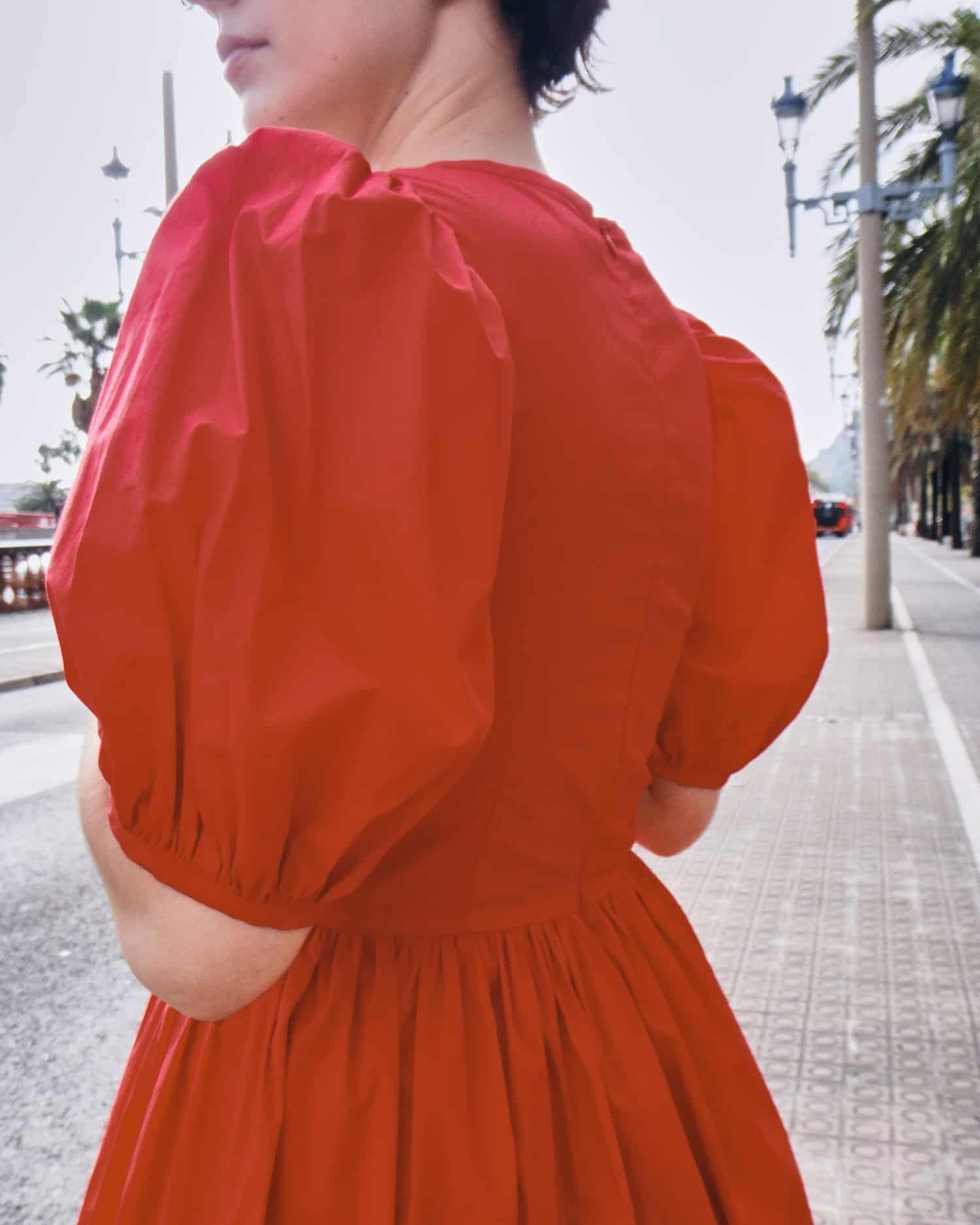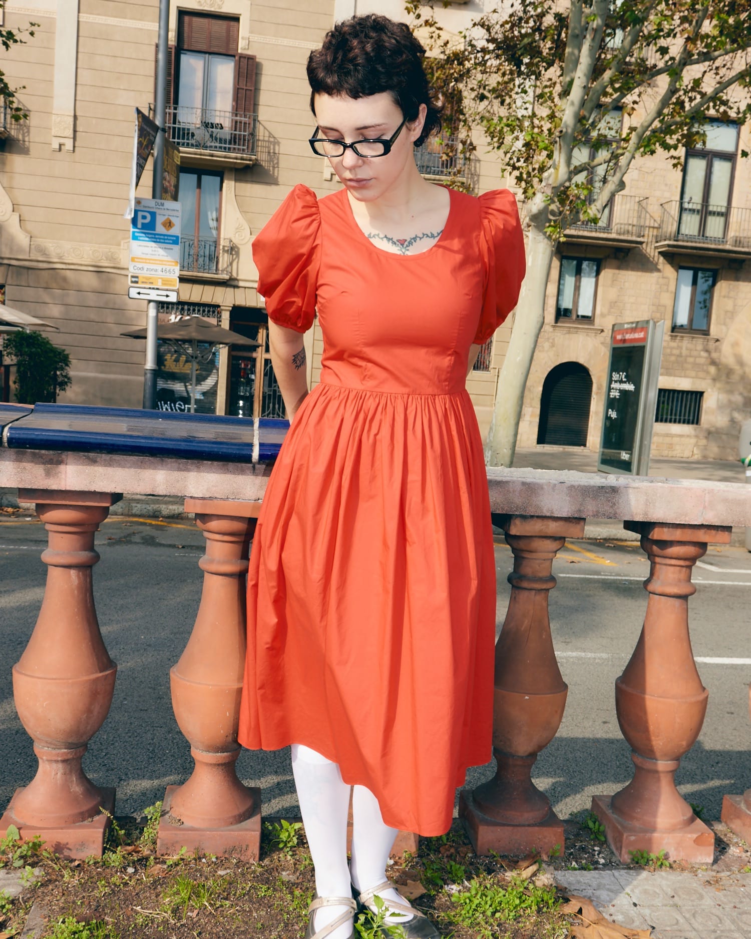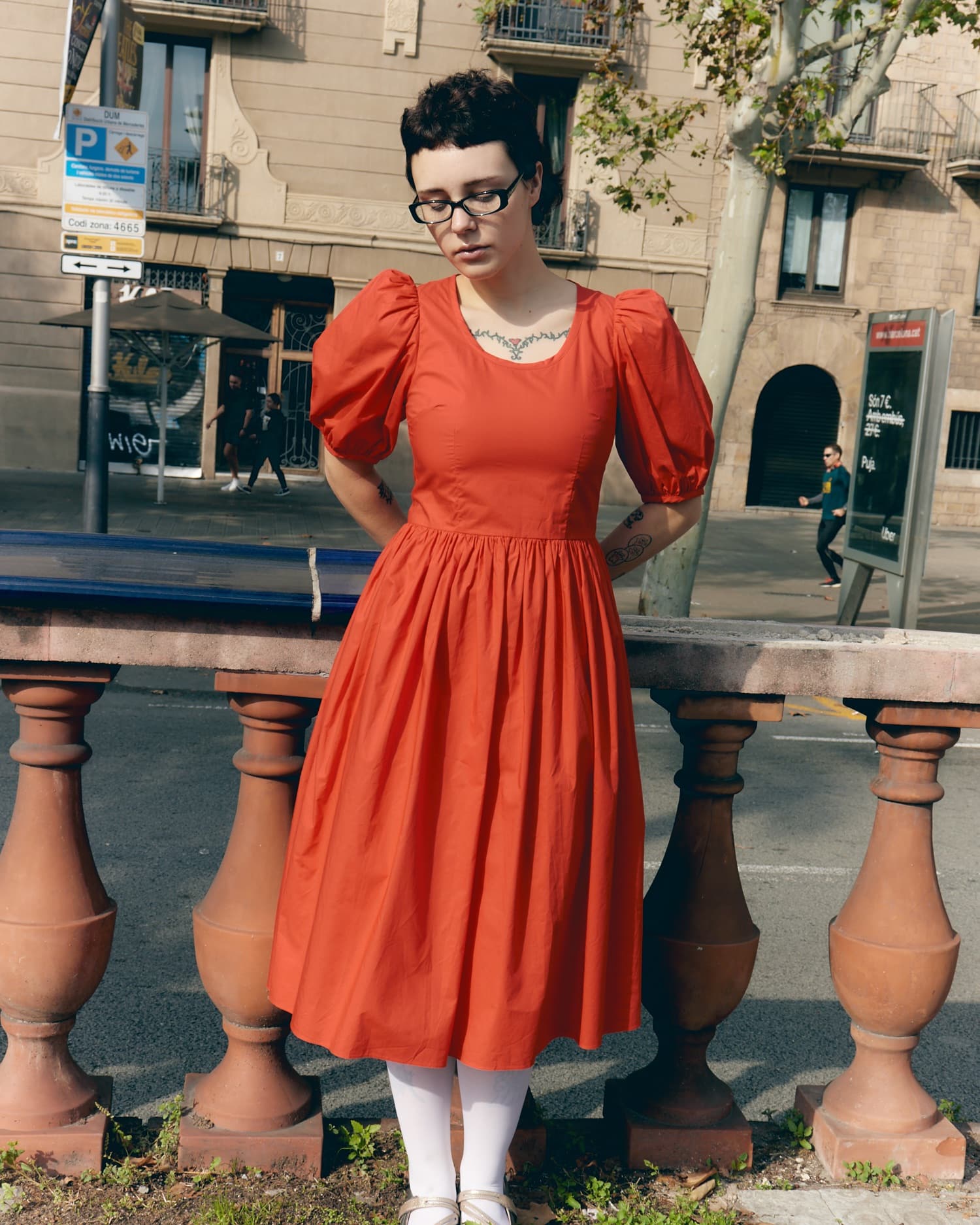 The Carmella dress in red is a midi-length dress with puffy short sleeves and a gathered waist skirt.