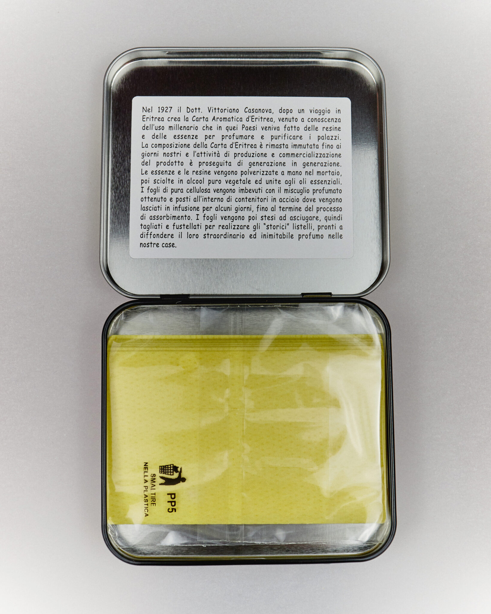 This beautiful and practical metal box contains 72 strips of historical Carta Aromatica d’Eritrea (Aromatic Paper of Eritrea), which has remained unaltered since 1927. Pure cellulose strips ready to be burned, soaked in the inimitable aromatic essence composed of absolutely natural and pure essential oils, resins and musks with multiple properties.