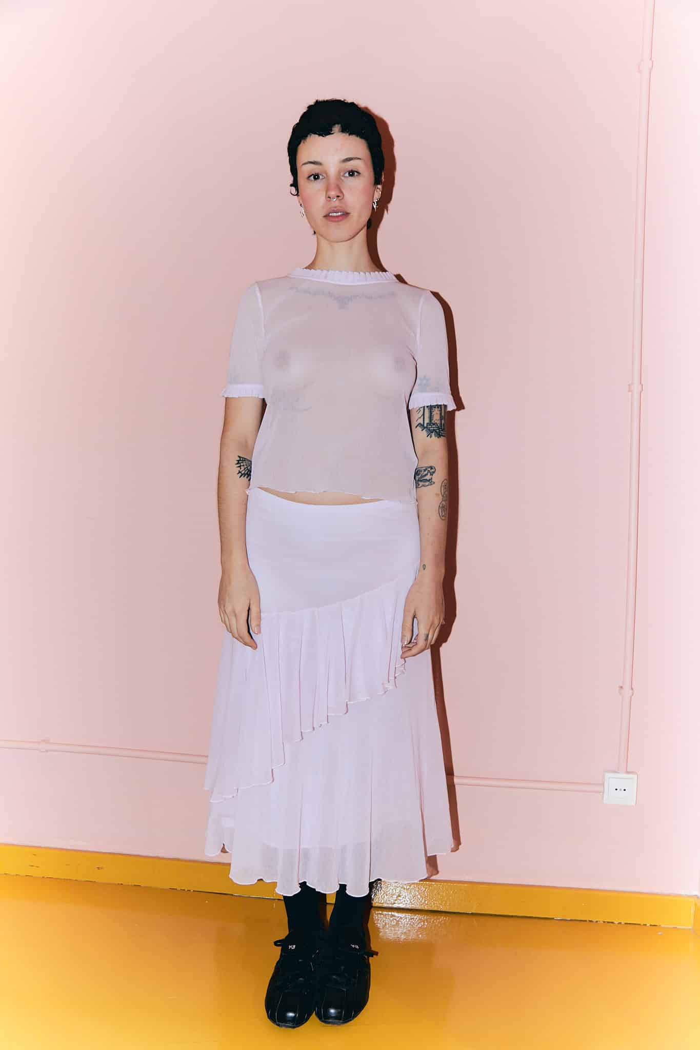 The Cecilia skirt in pink is crafted from cotton tulle and features layered diagonal ruffles. The skirt sits slightly fitted around the hips and falls to create a flowy silhouette.