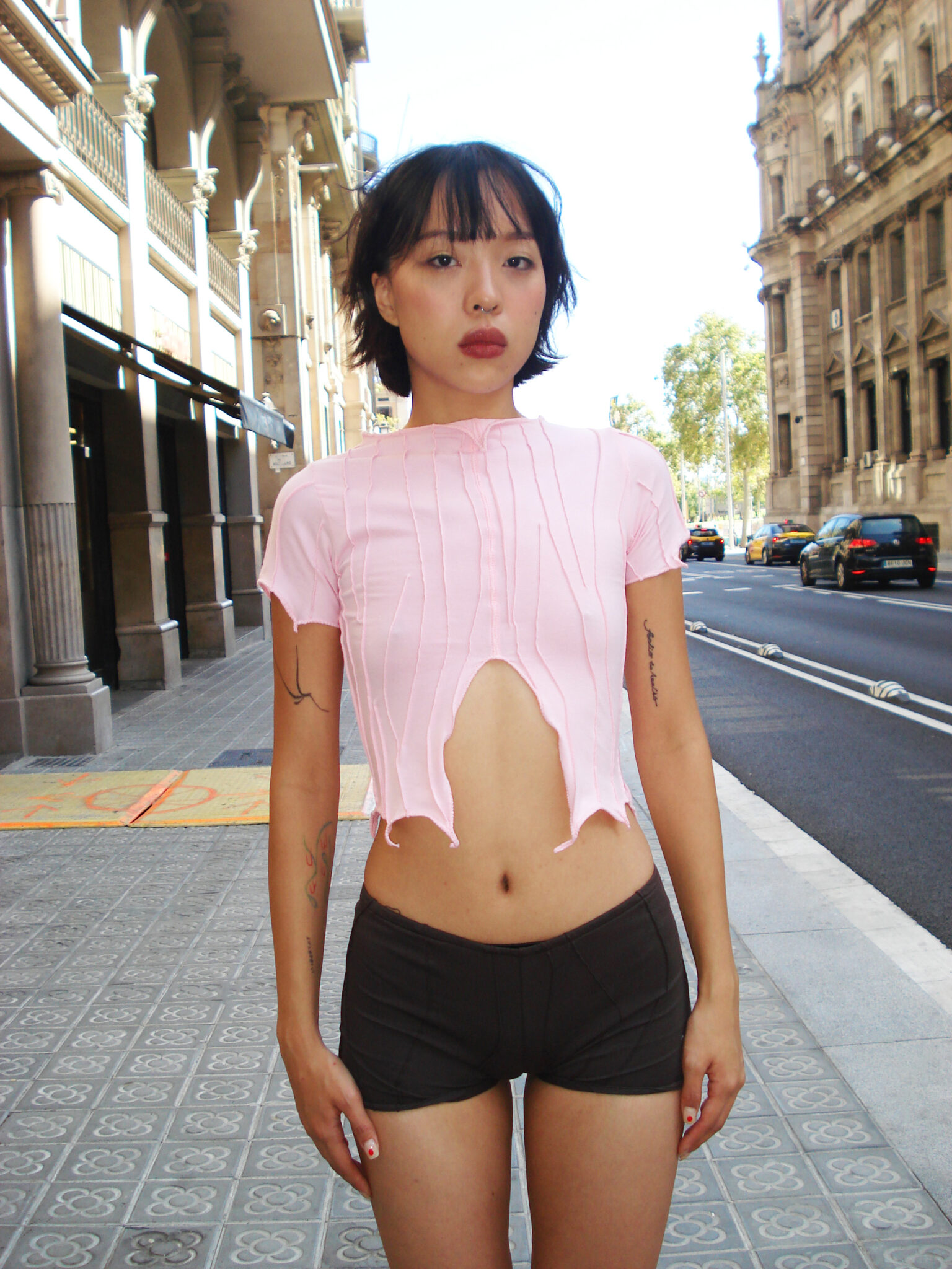 Fitted stretchy cotton shorts featured elastic waistband. Unique handmade suture formation on each item. Finished garments may vary due to artisanal manufacturing.