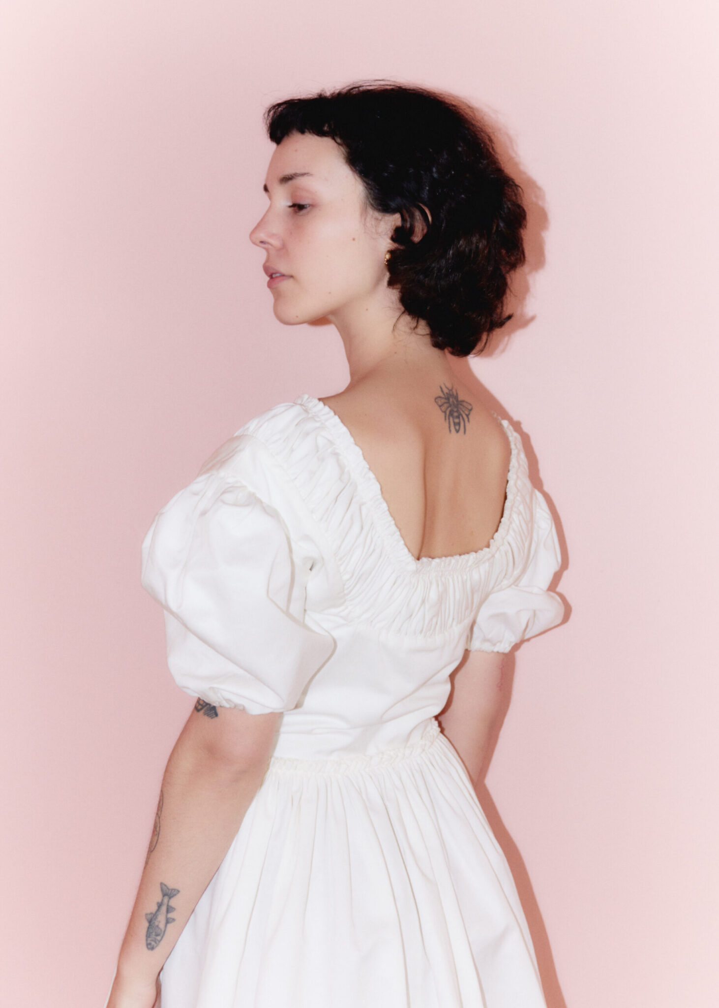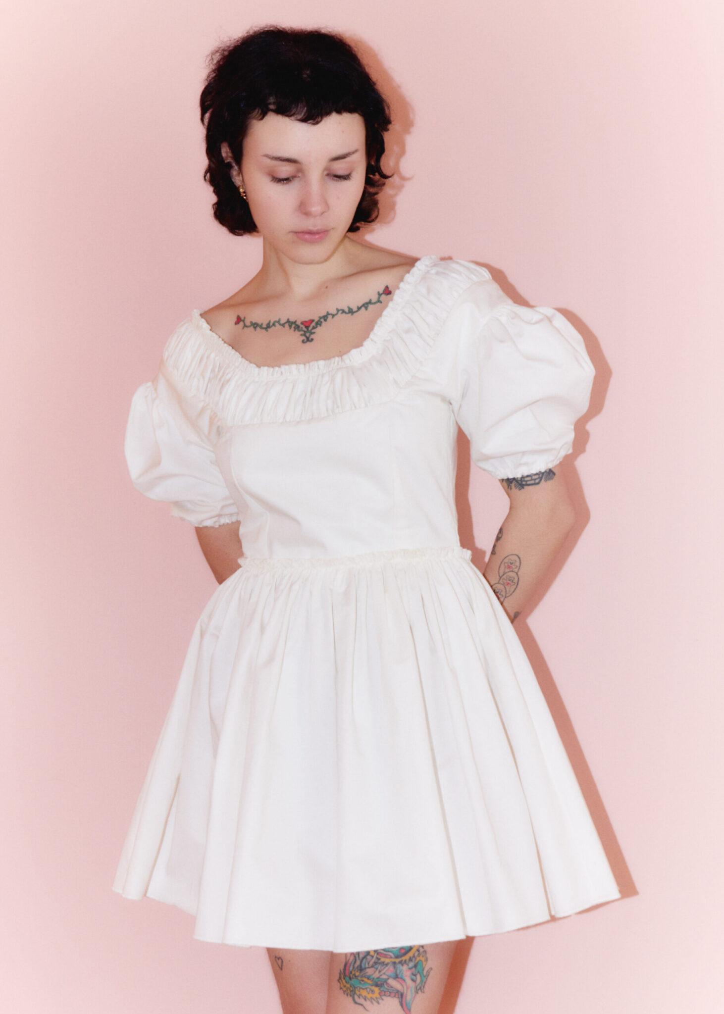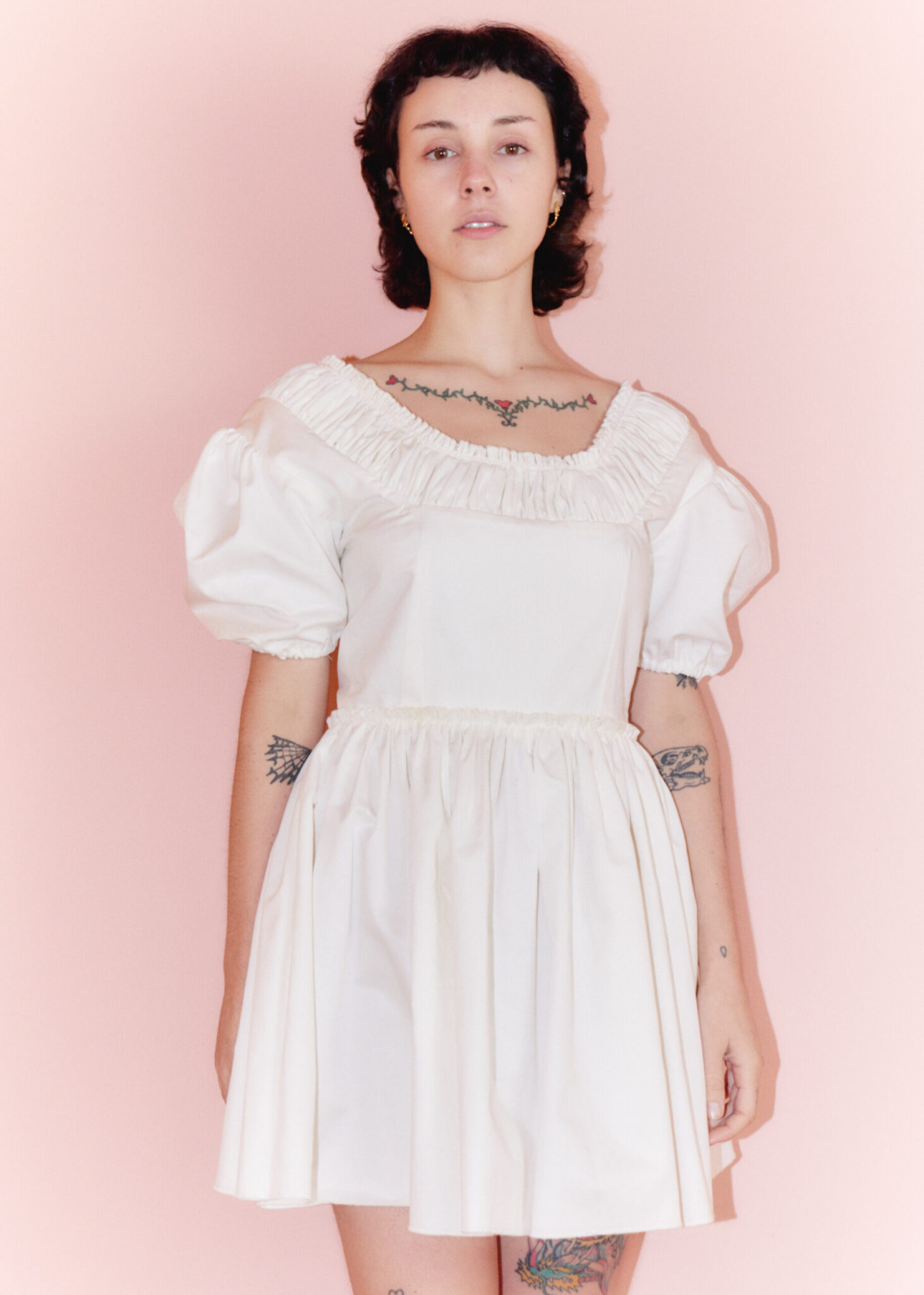 Anemone’s Mini Dress features puffy sleeves and a beautiful ruffled neckline.