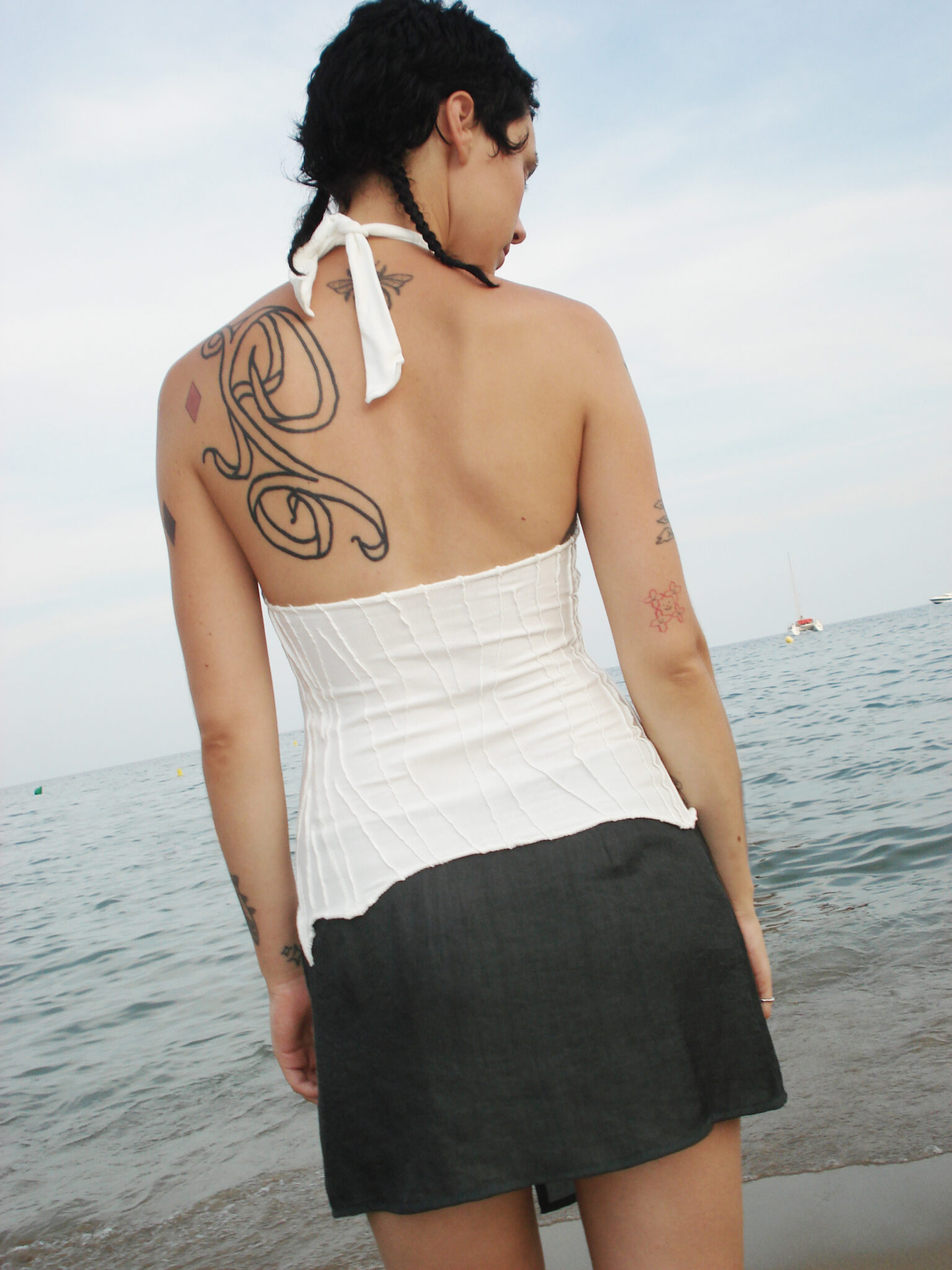 Fitted halter top with adjustable strap at the neck. Open back and asymmetric scraps bottom. Unique handmade suture formation on each item. Assembled from the fabric scraps and ‘cut-offs’ of production. Finished garments may vary due to artisanal manufacturing.
