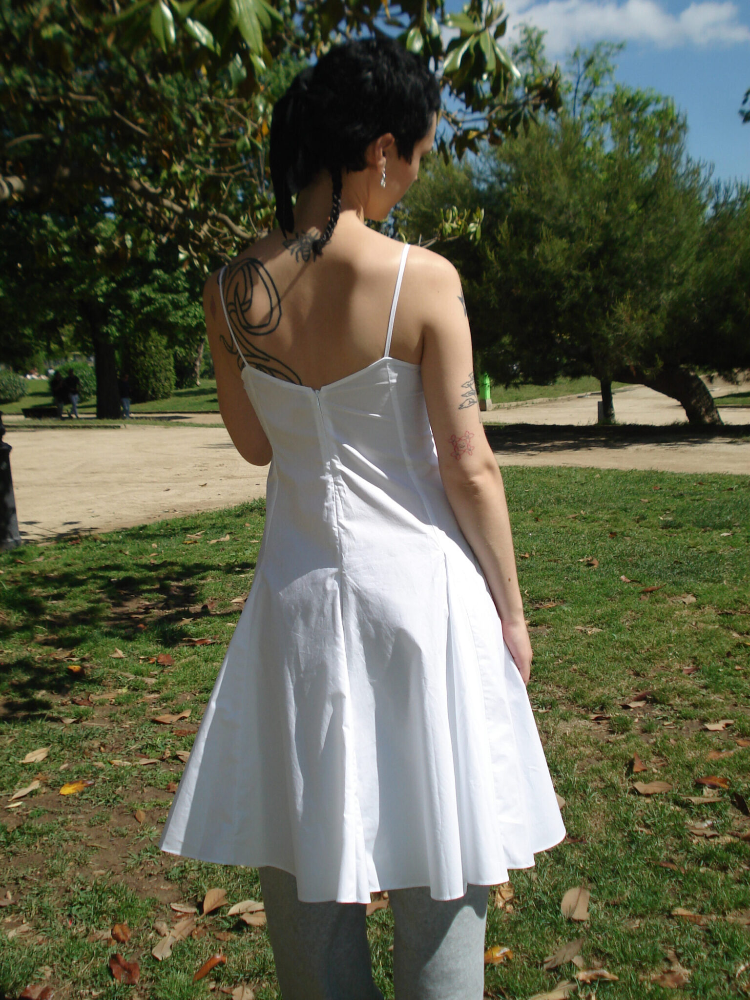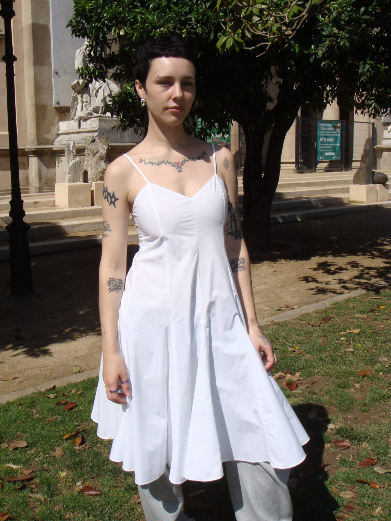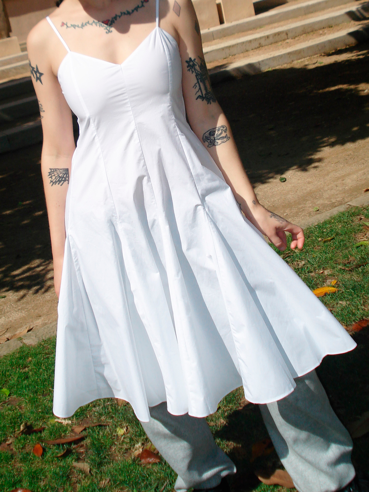 The Ebba dress in white cotton poplin is cut to bare your collarbones with slender straps that trace the shoulders and has a flowy a-line skirt. This dress is an elegant summer staple. It is also available in light pink in Dupion silk.