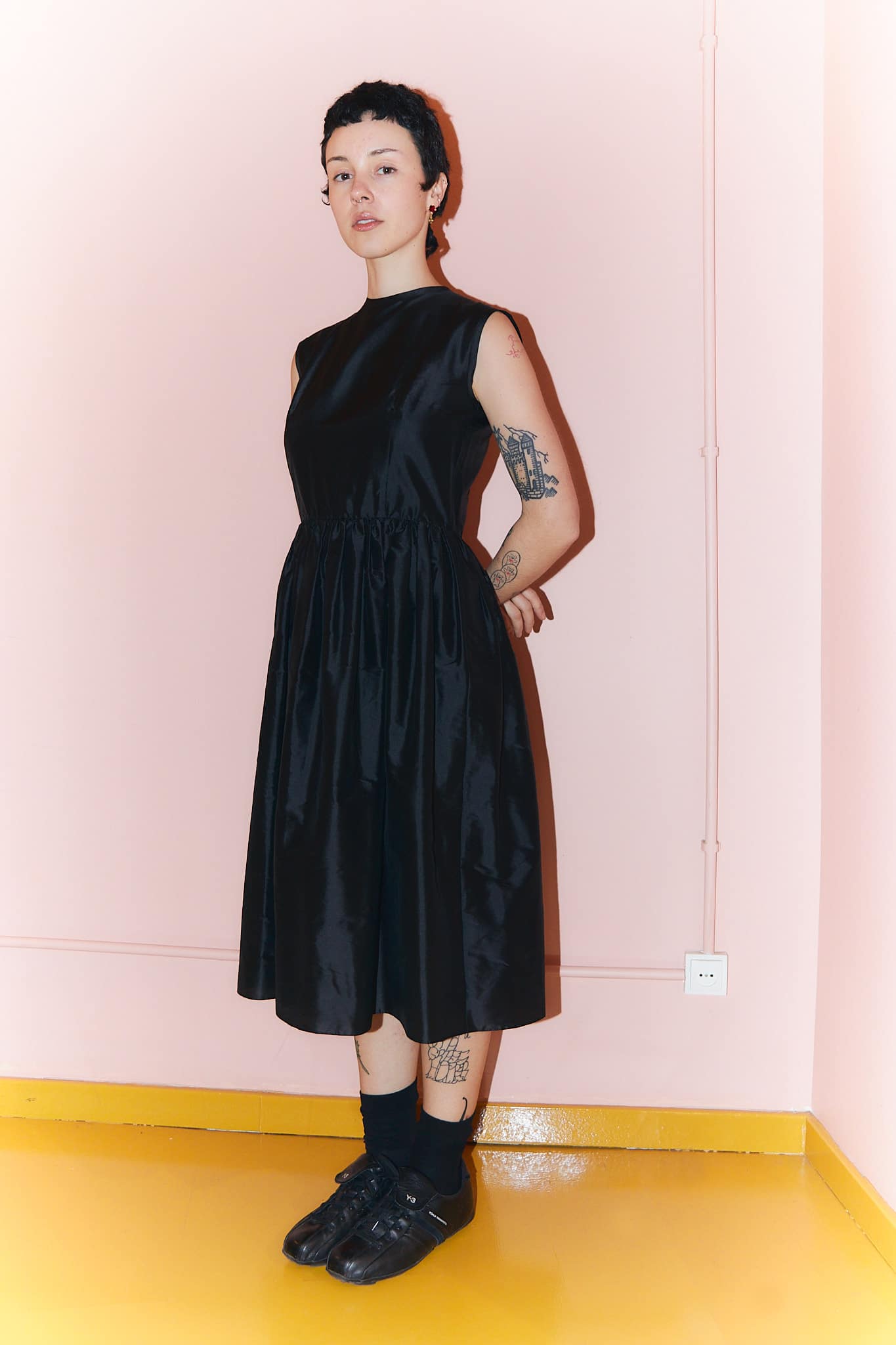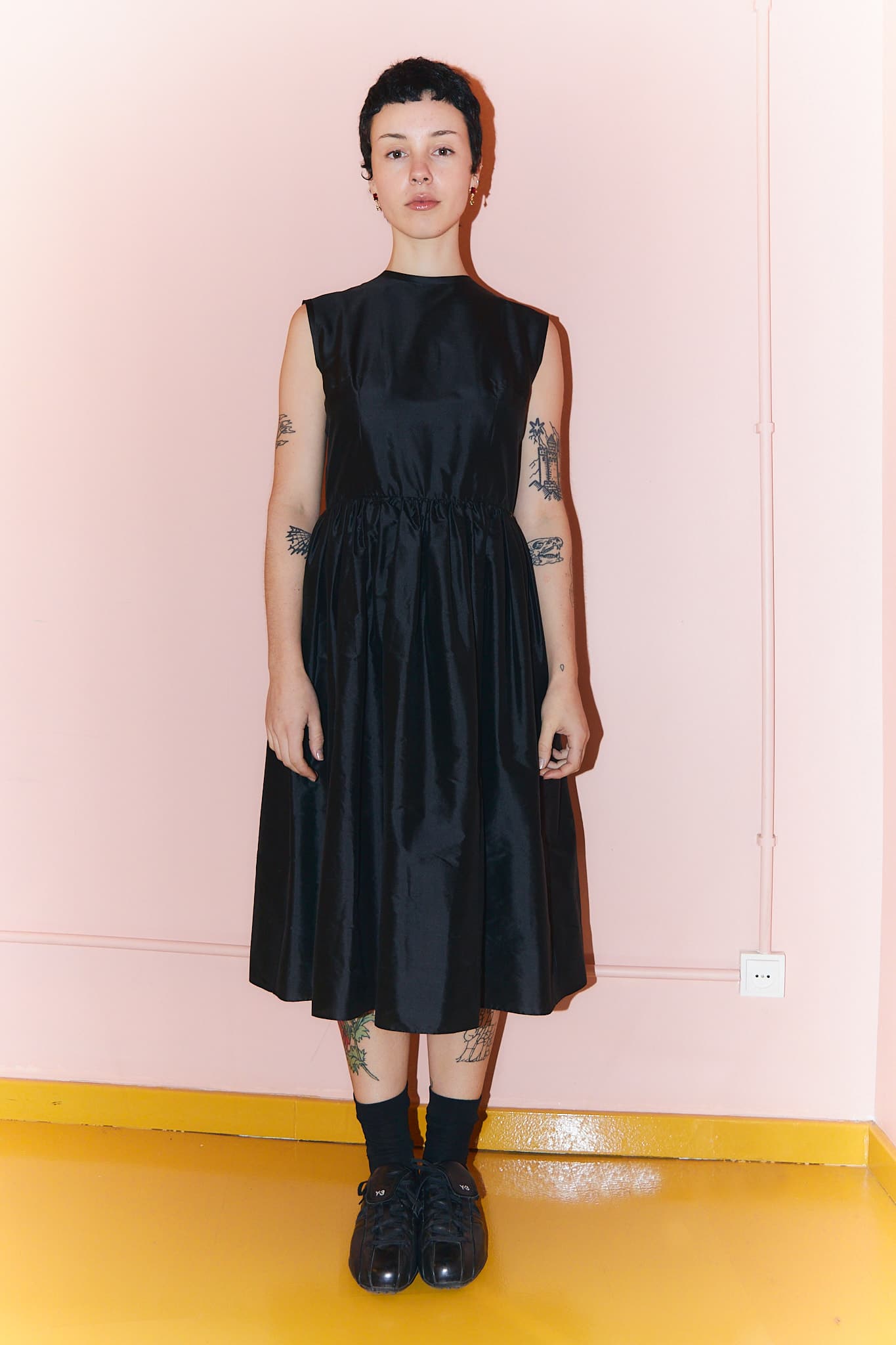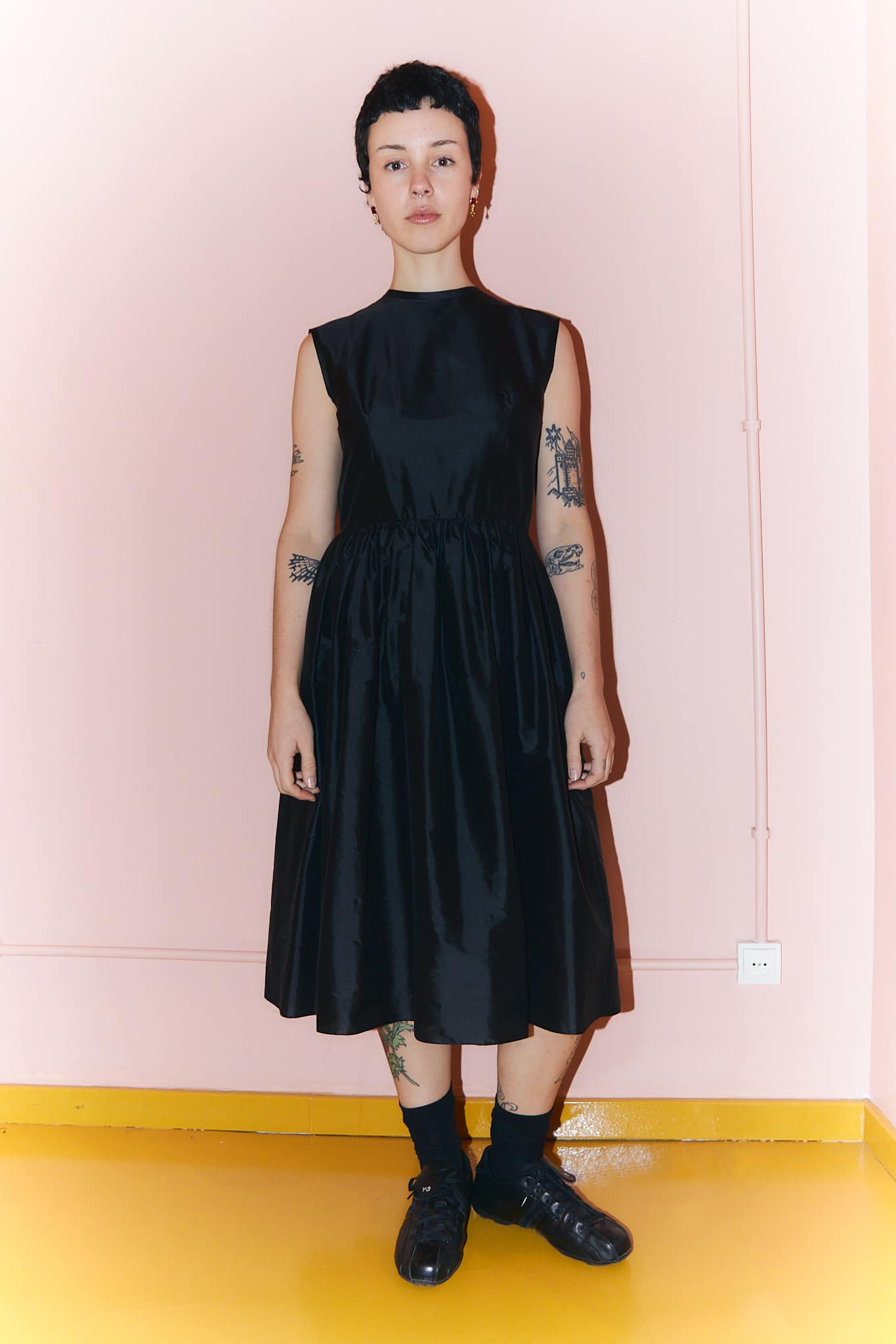 The Elisabeth black silk dress is a midi-length dress with ever-so-slightly capped sleeveless shoulders and a gathered waist skirt.