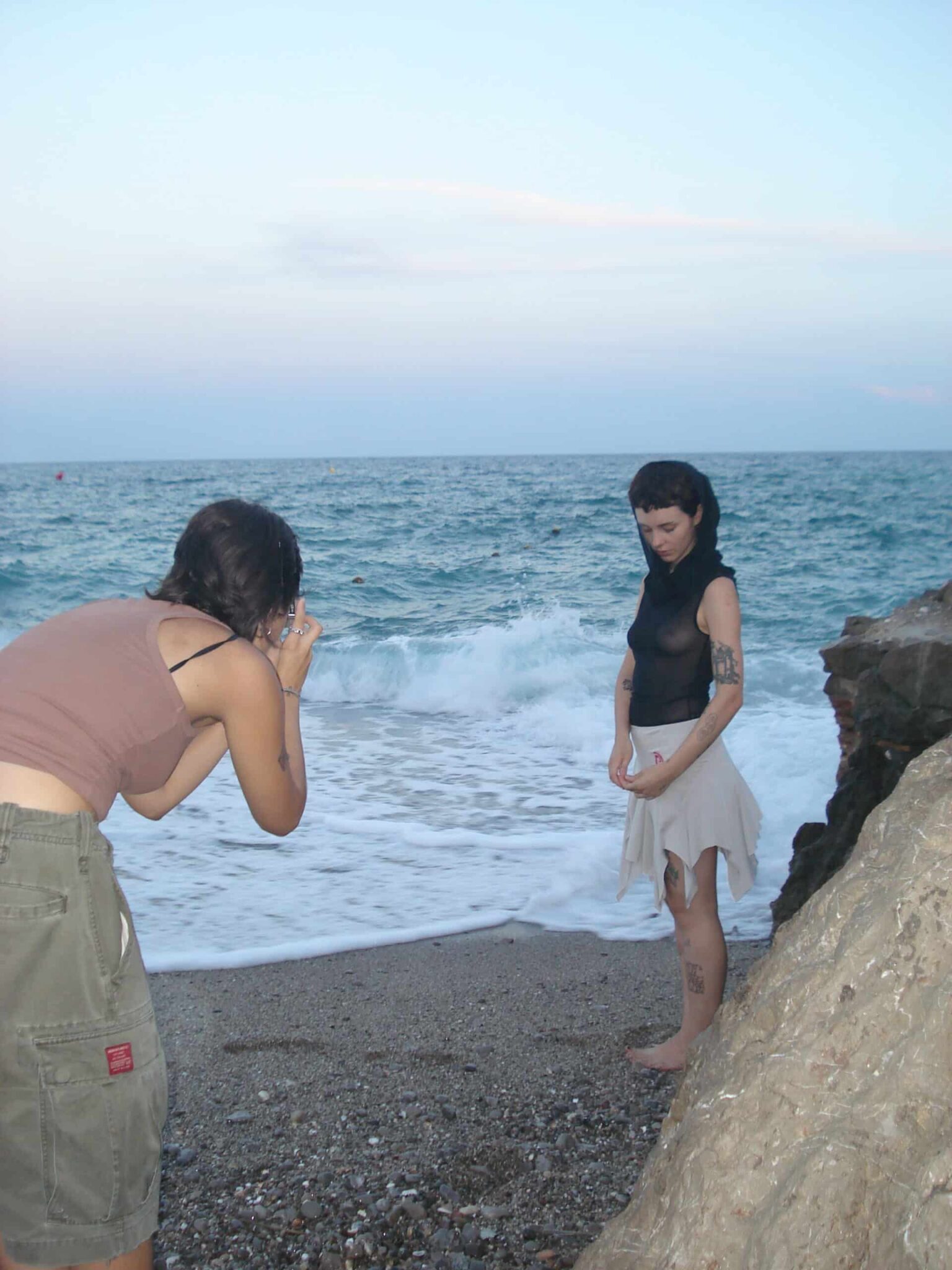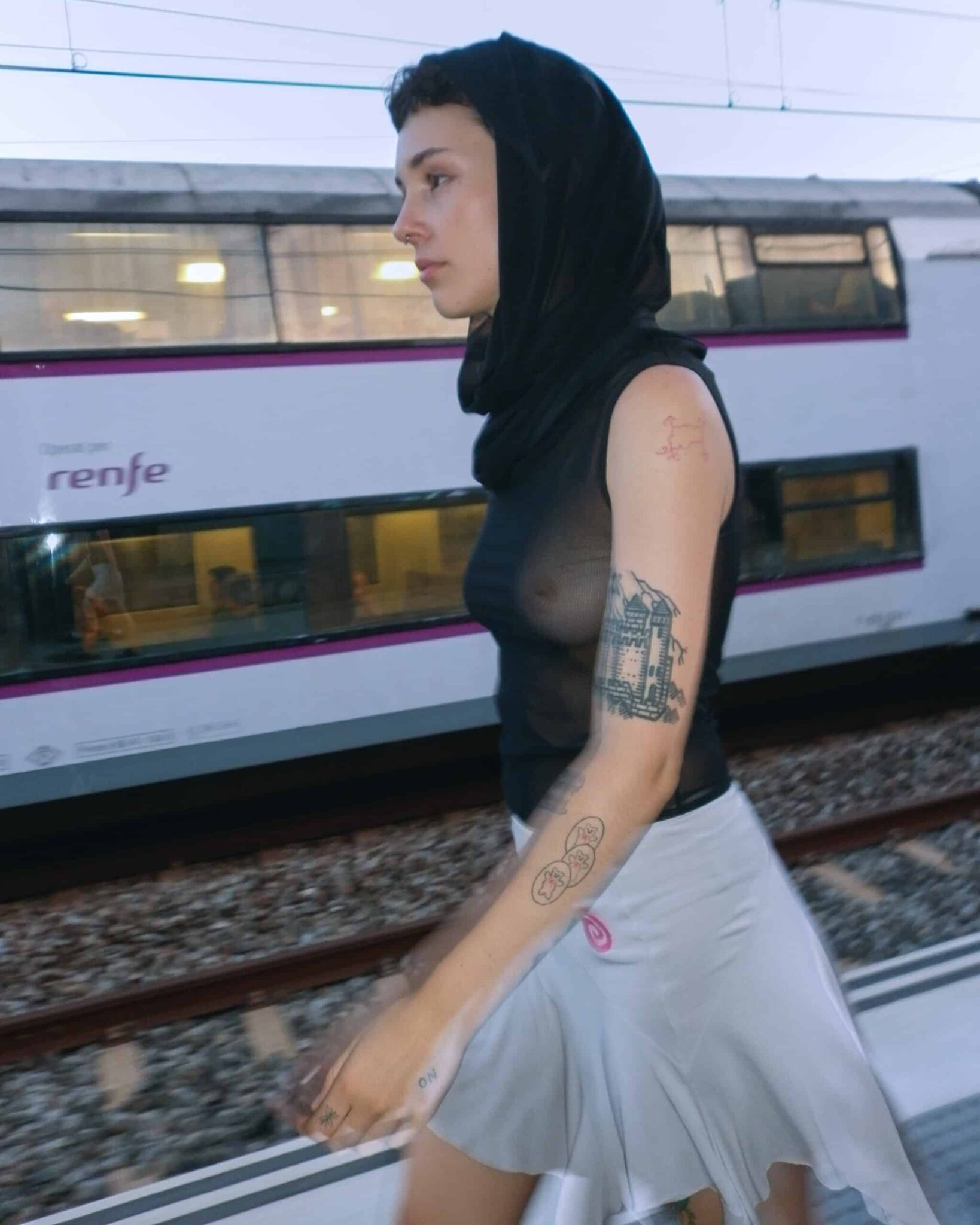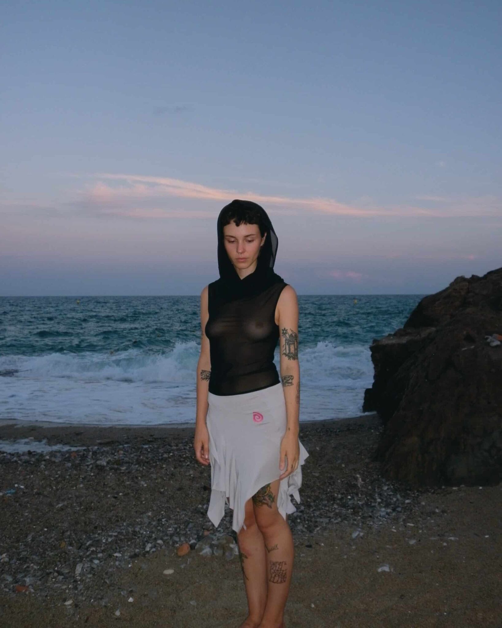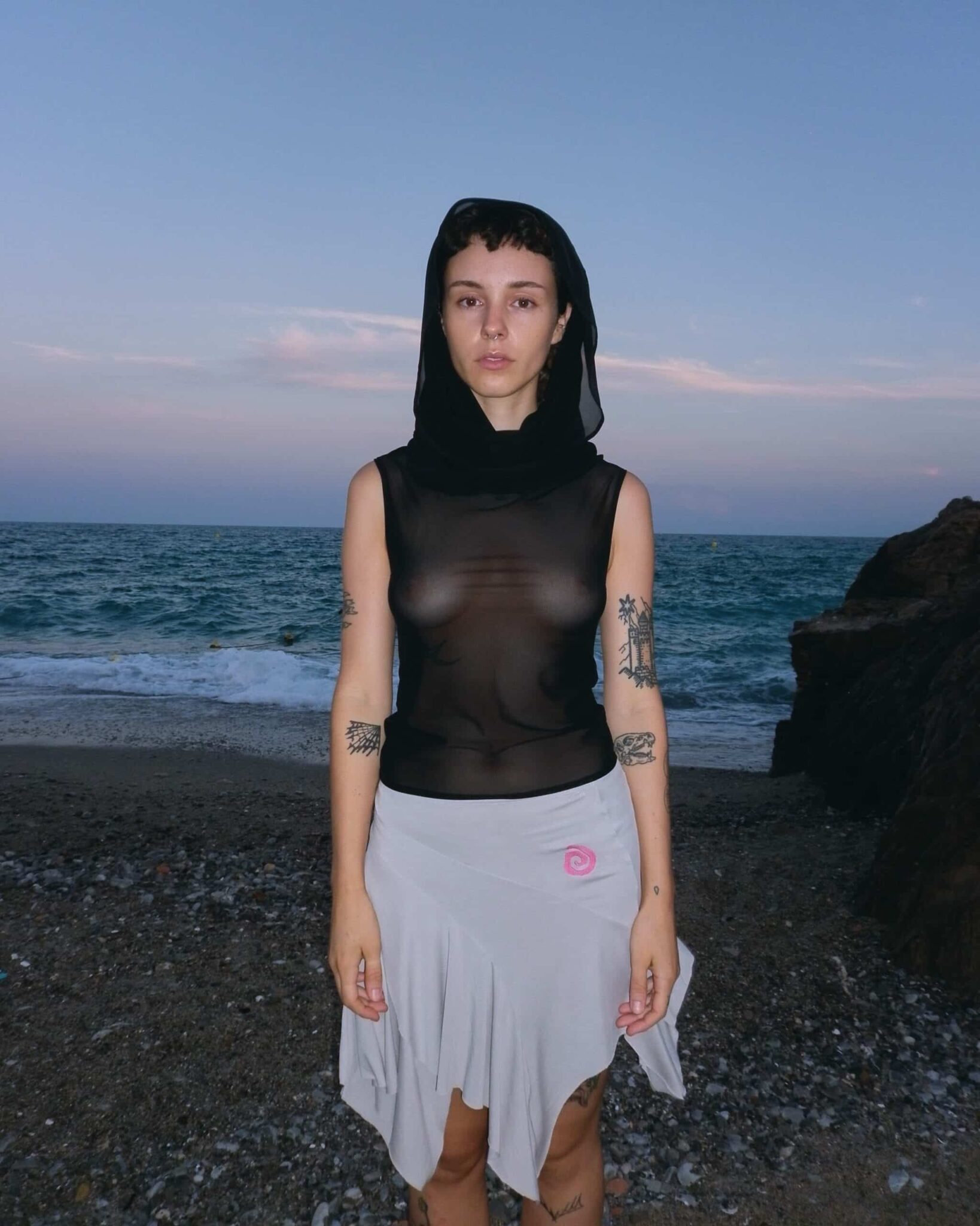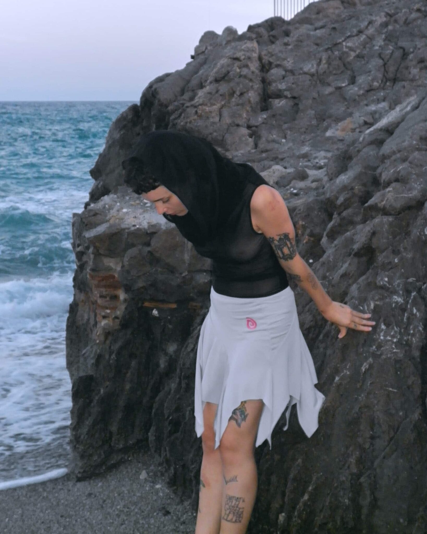 Signature asymmetric cut skirt with panelled construction in modal jersey. Bias cut layered shape with raw hem. Embroidered spiral logo o the right and elasticized waistband. lined throughout.