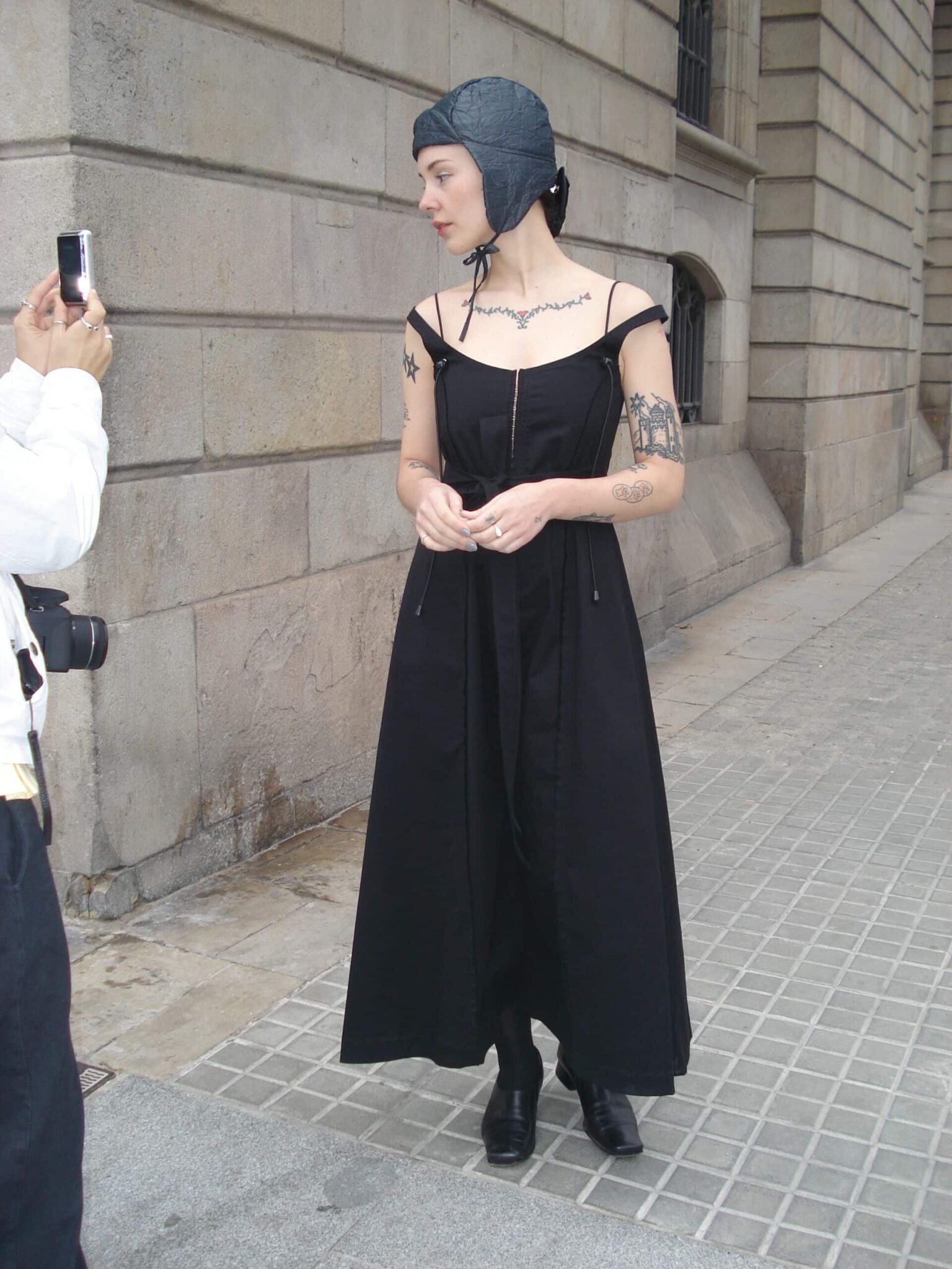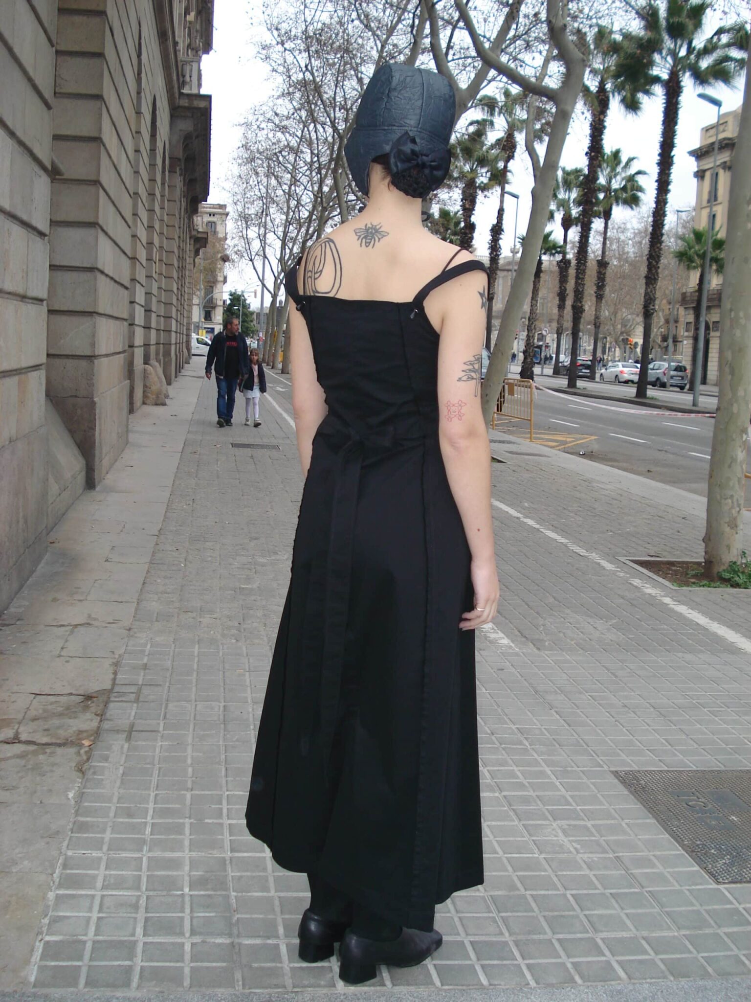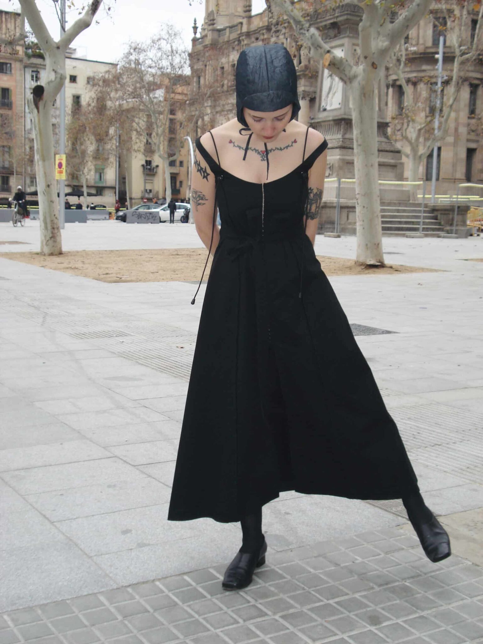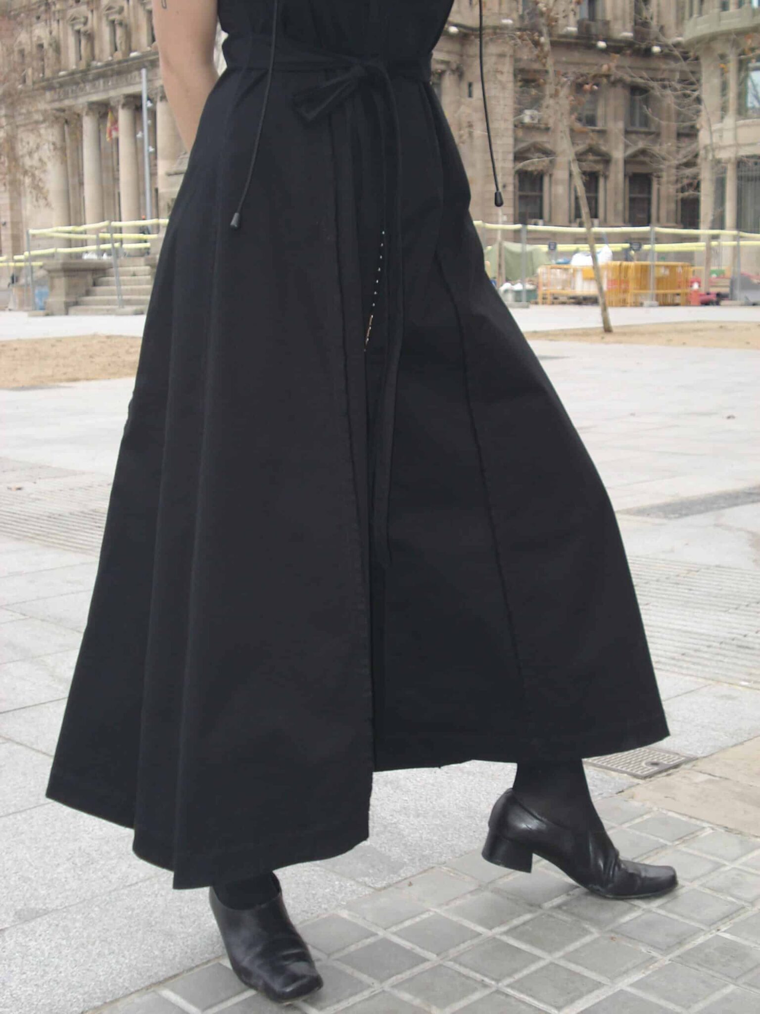 Long, eight-panel strappy dress made from black twill fabric. Front closure with hook-and-eye tape, and adjustable side/back ties. Double straps with adjustable elastic bands. Convertible leg feature with hook-and-eye fastener to transform into pants. Selvage detail on the panels.