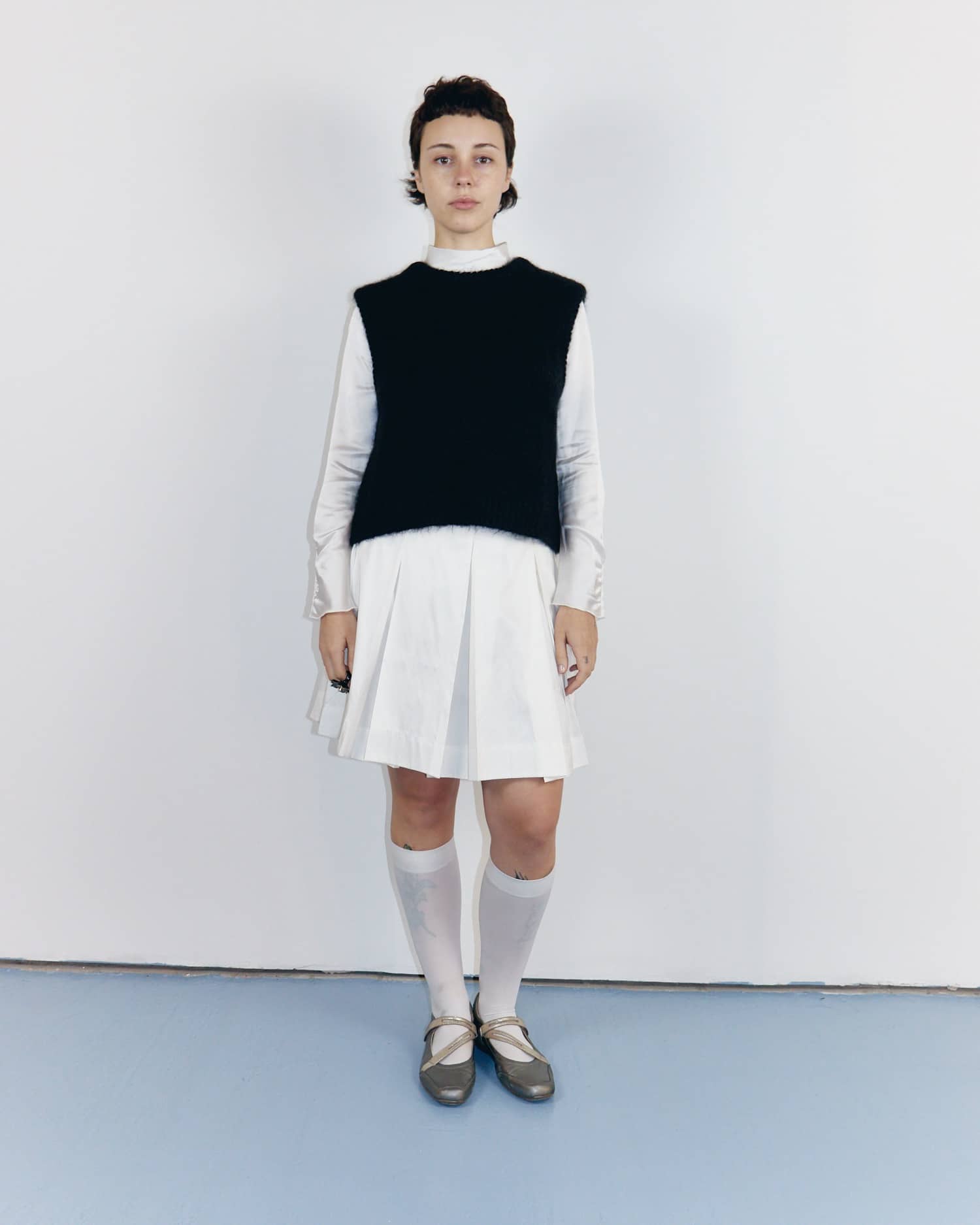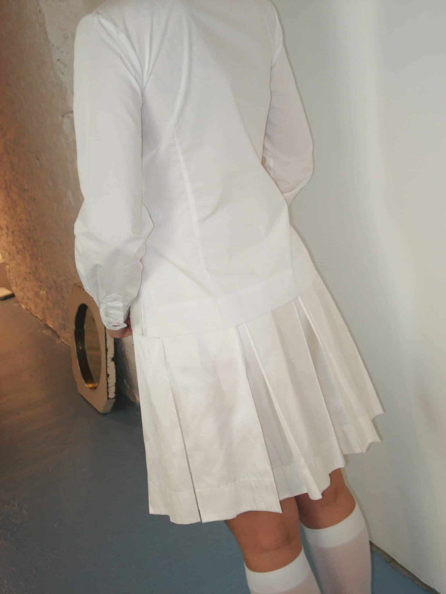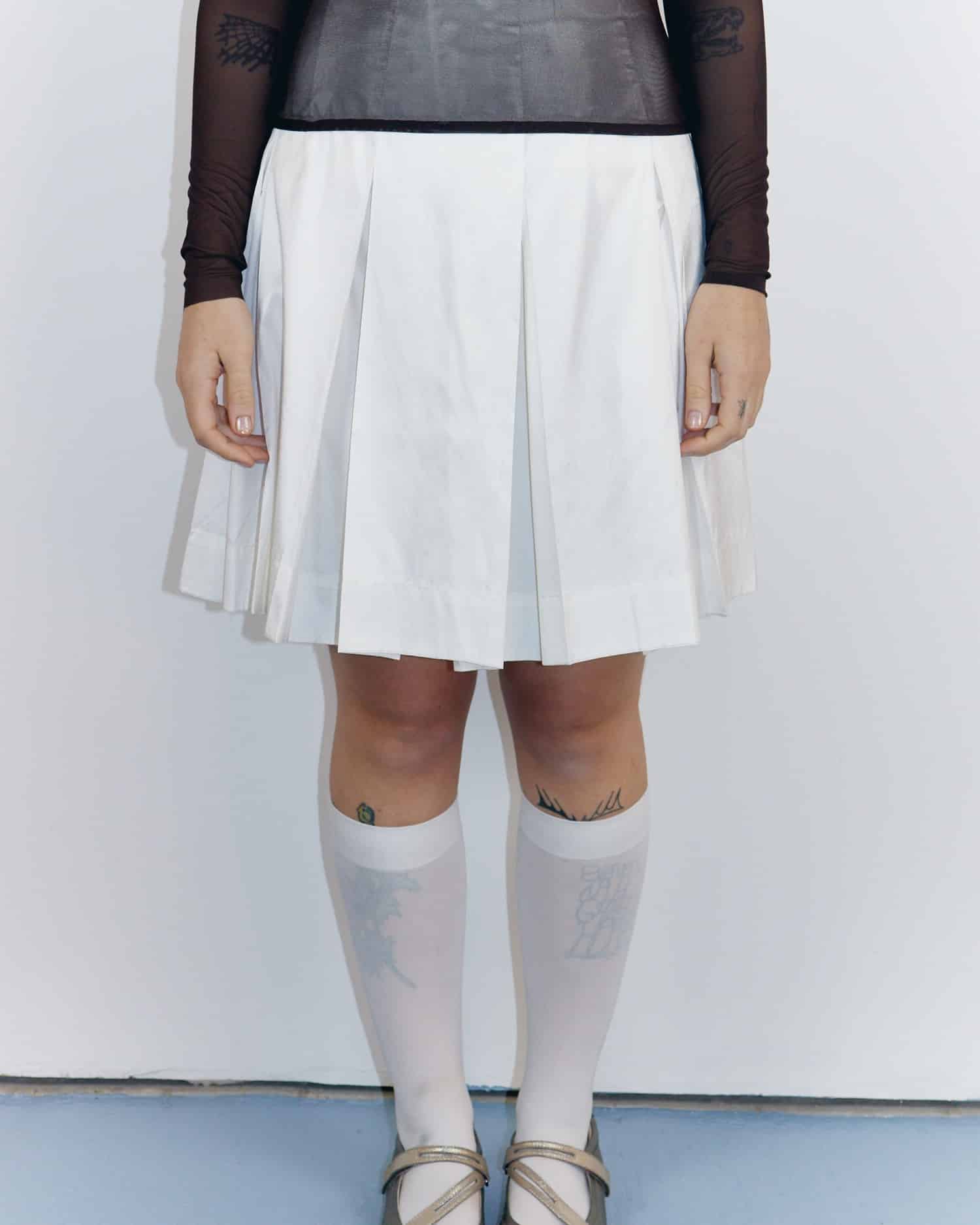 The Freya skirt in ivory is a classic pleated mini skirt referencing the popular silhouettes of the late 90s. Falling to a length just above the knees and has a side zip closure.