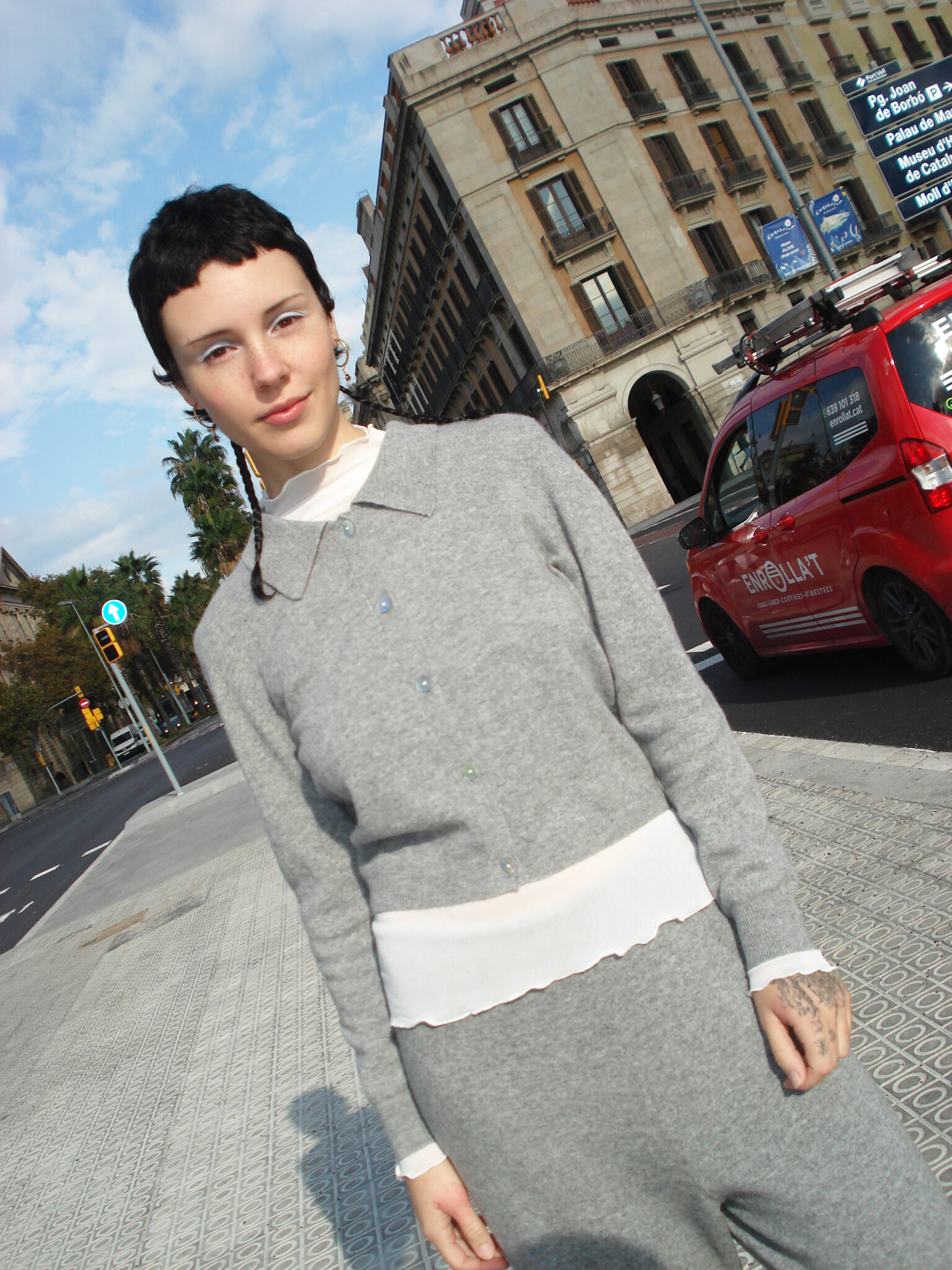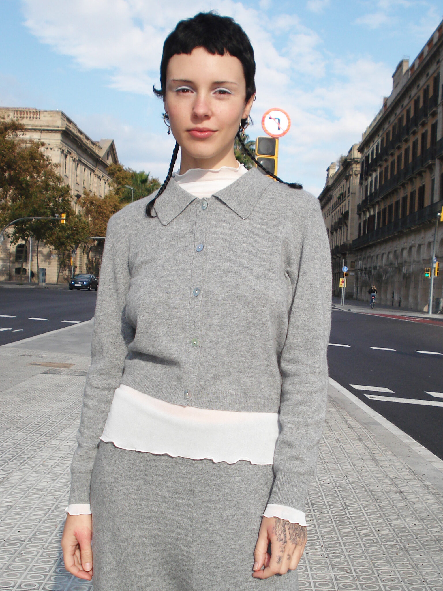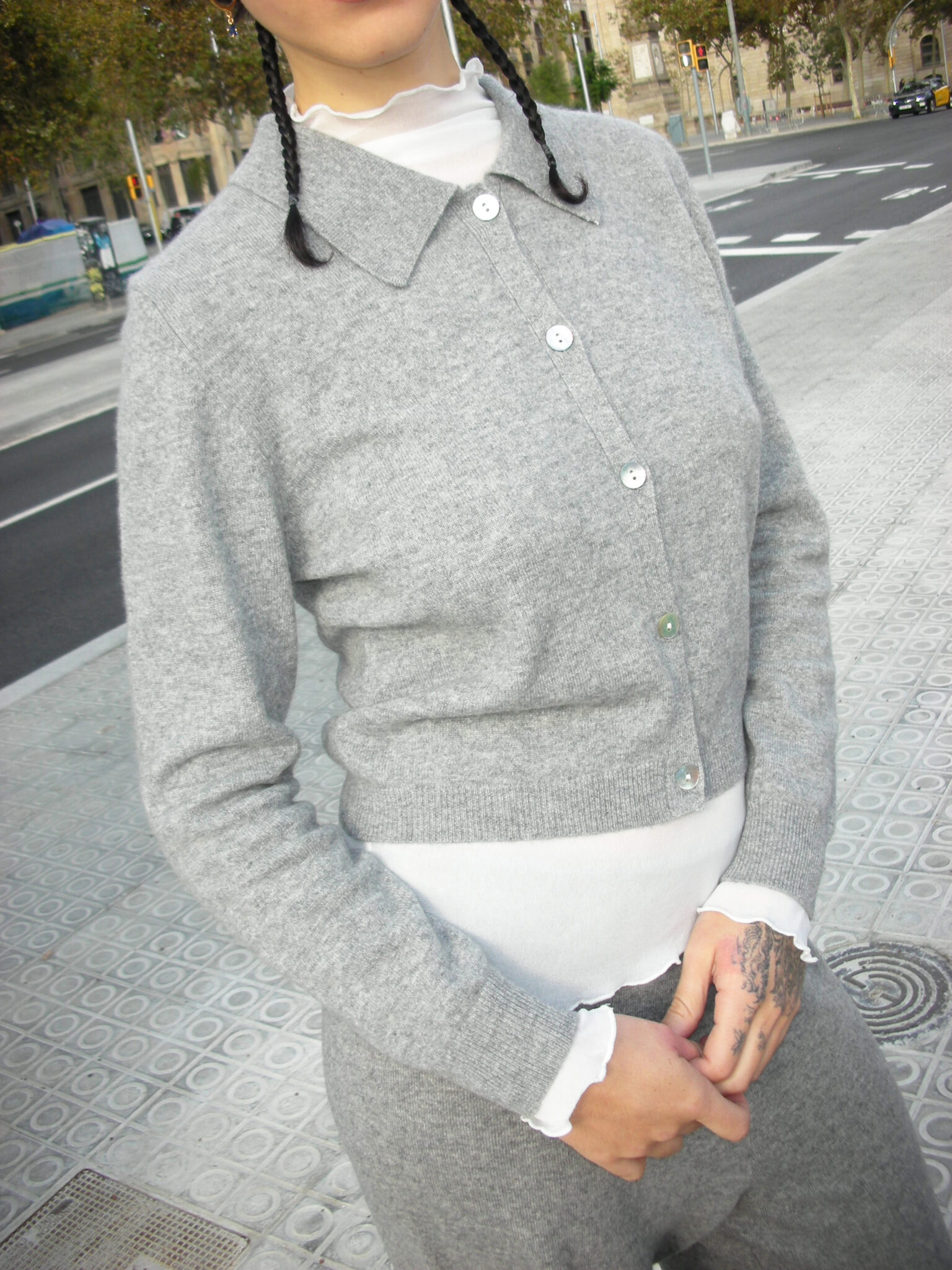 The Anselma cardigan in grey is made from cashmere. Designed for a slim fit, it features a cropped length and a shirt collar neckline, complete with mother-of-pearl buttons.
