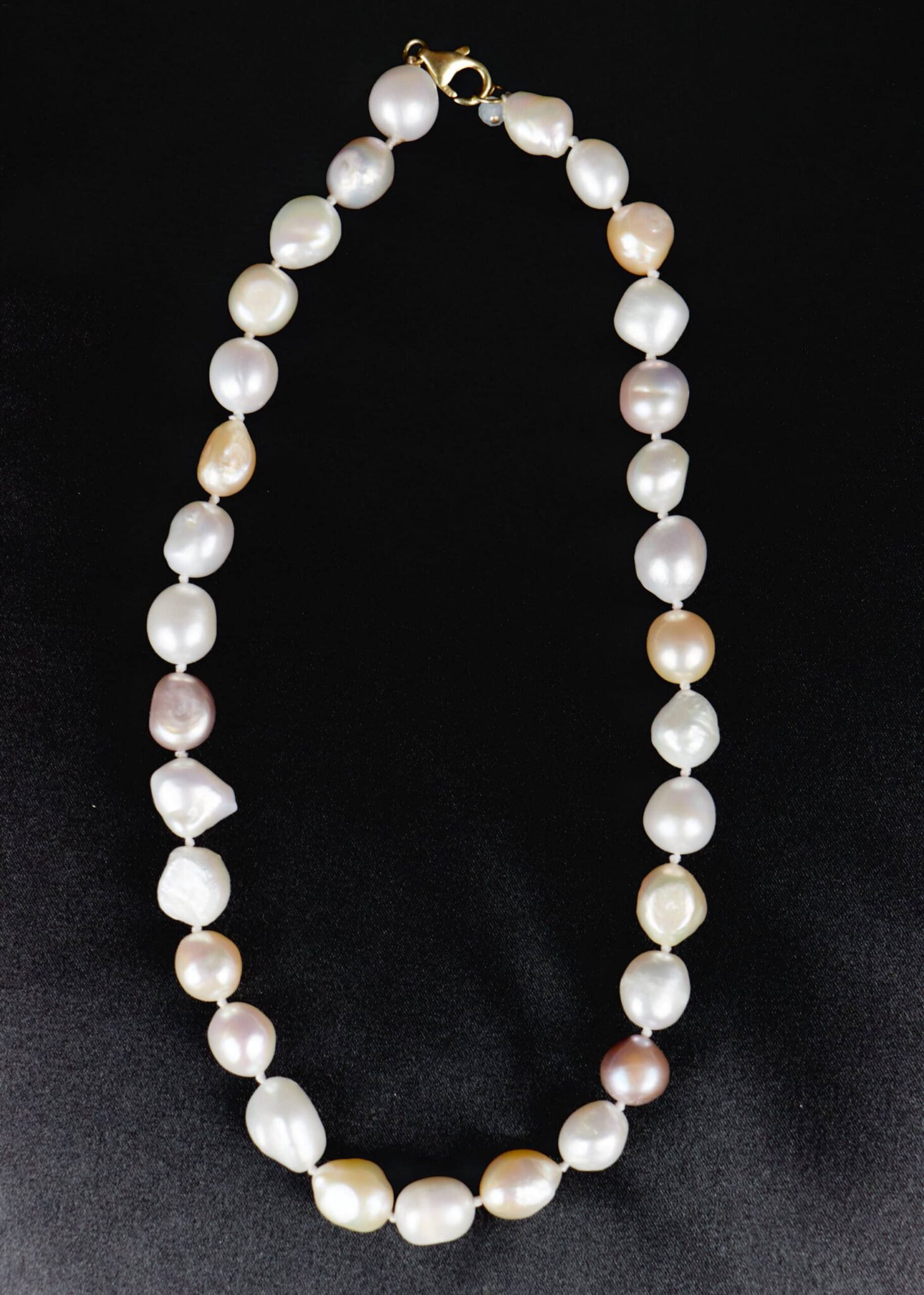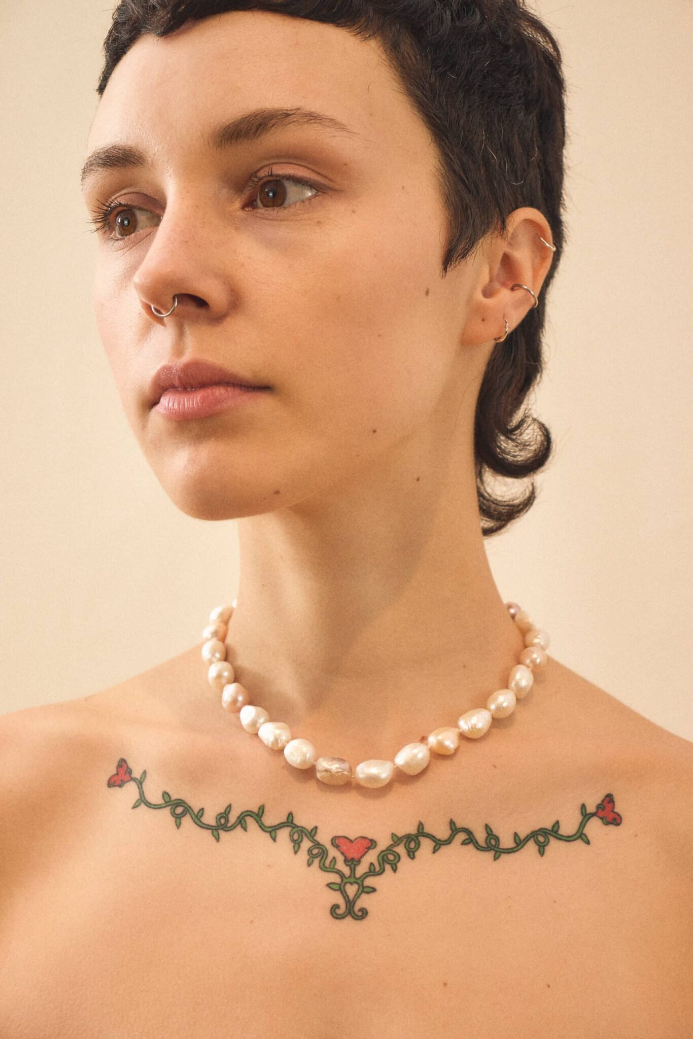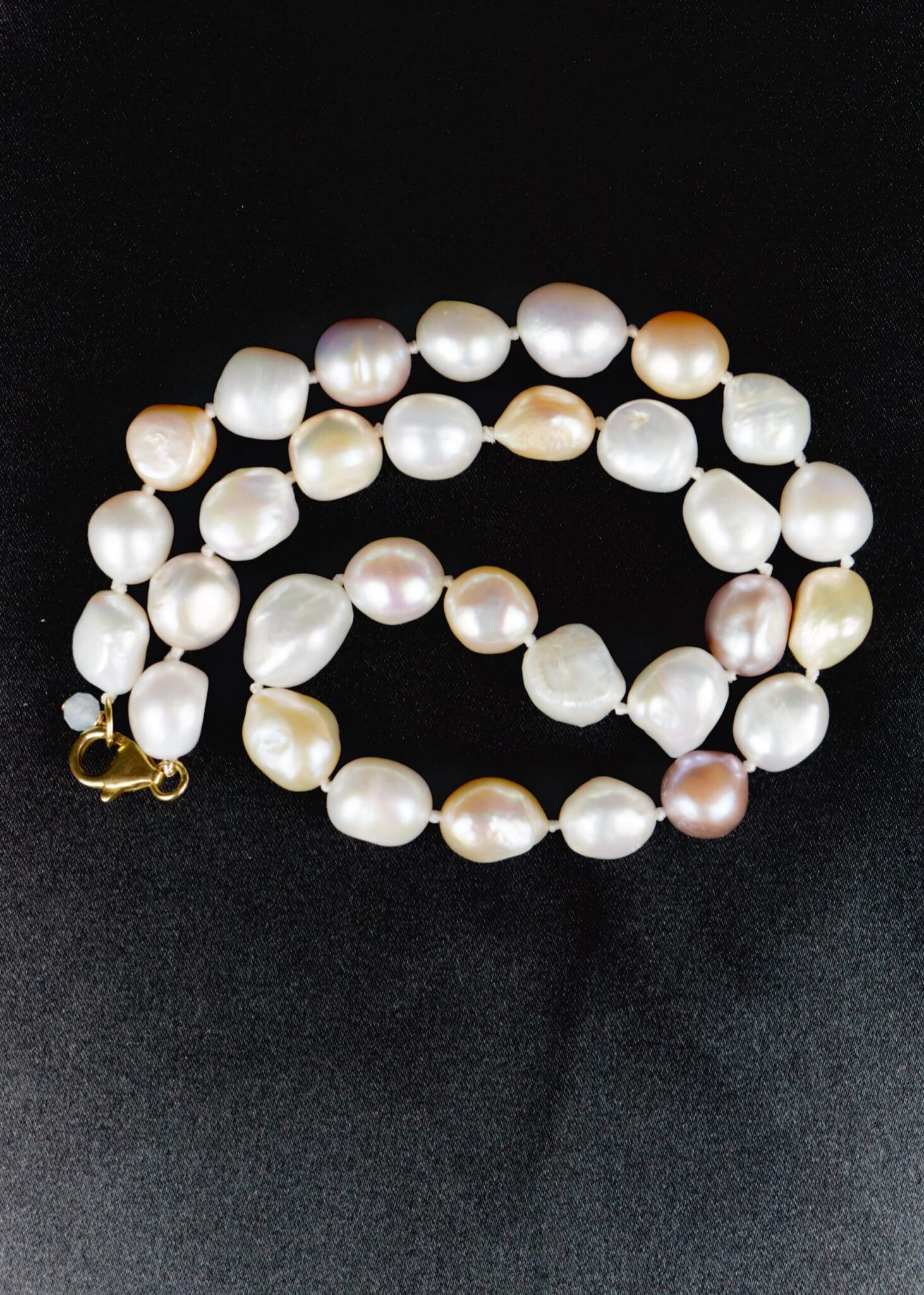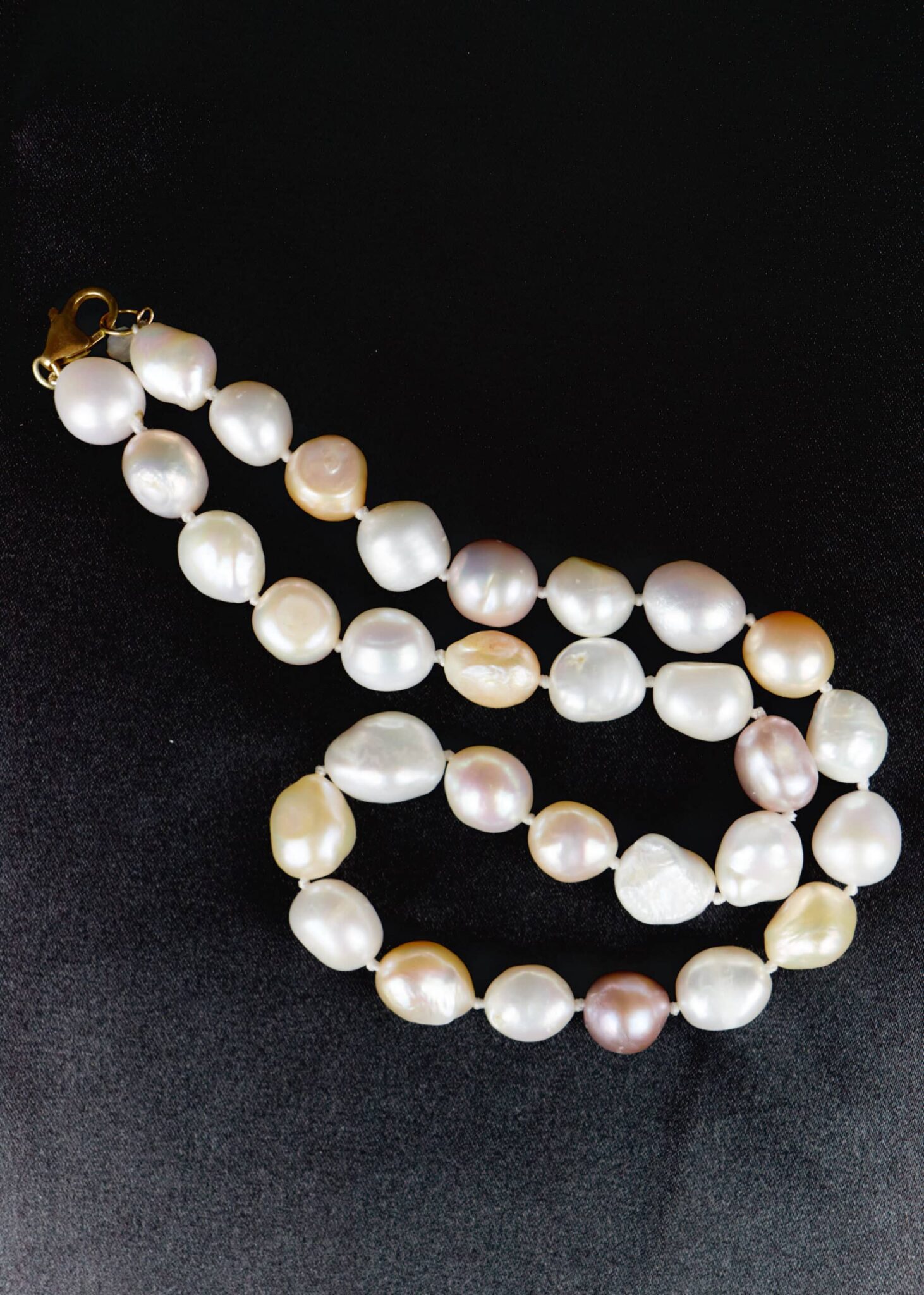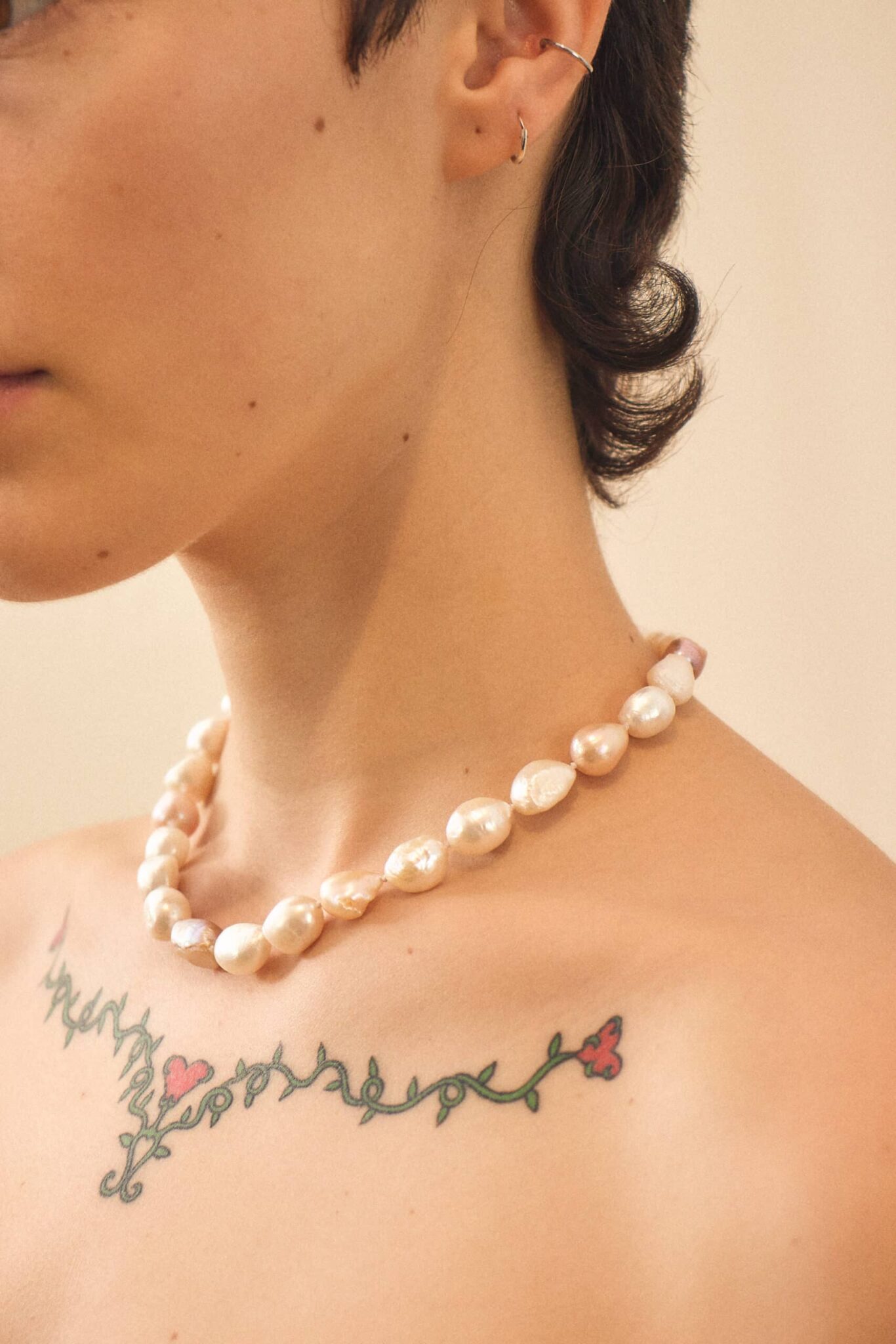 The Jean necklace is made up of a string of freshwater pearls in hues of ivory and light pink that trace the collarbone at just the optimum length.