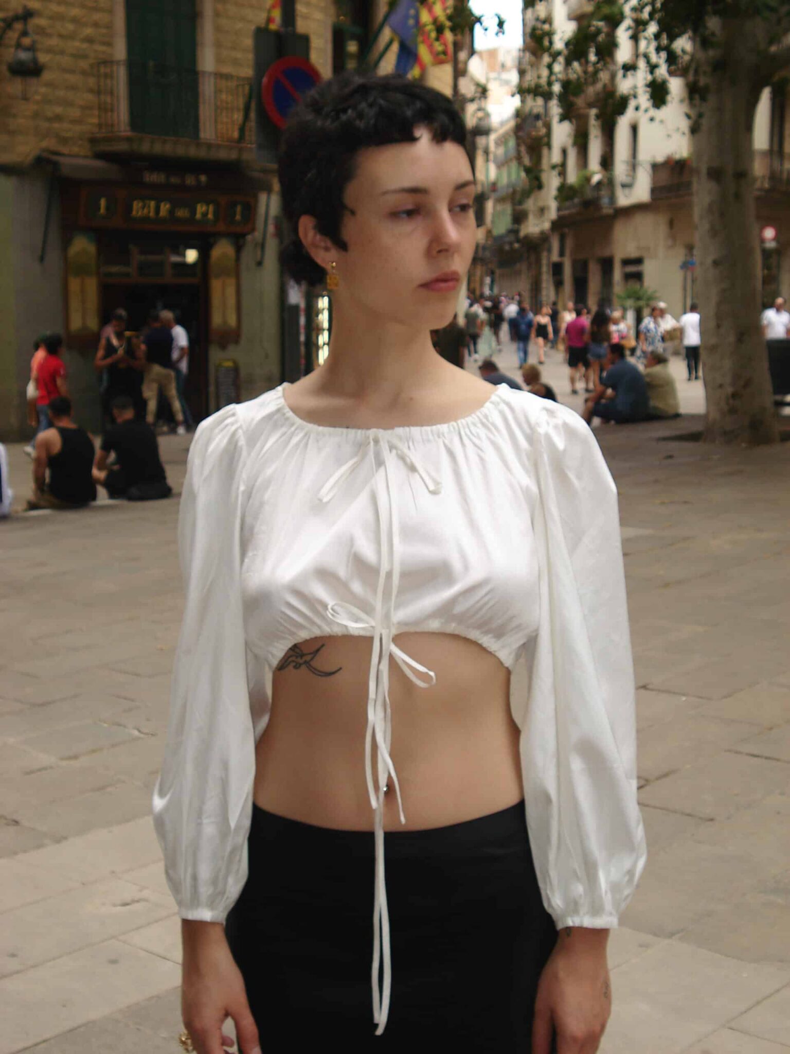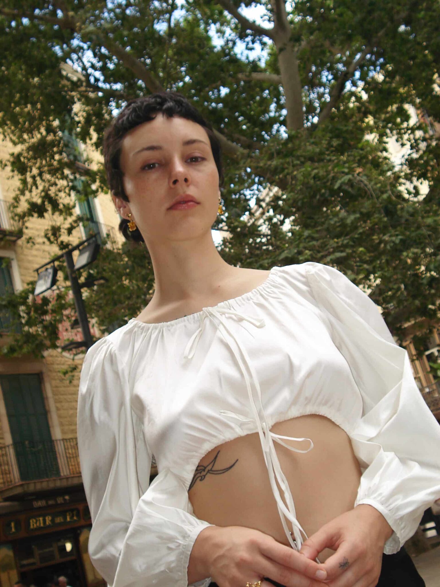 The Lupe blouse by Hai is crafted from soft, textured dupion silk that gathers at the neckline and waist with string adjustment to tighten or loosen its silhouette as you like.
