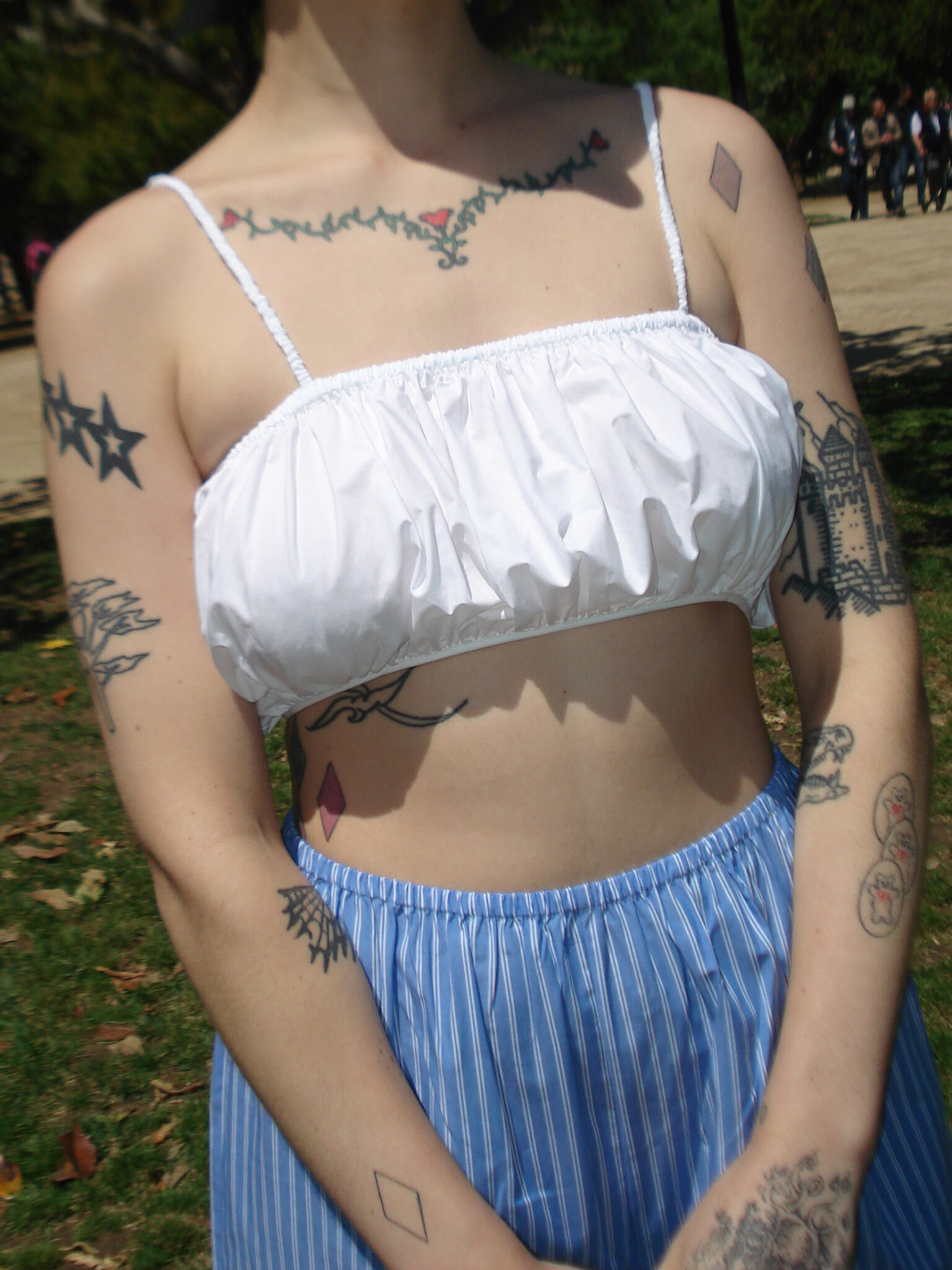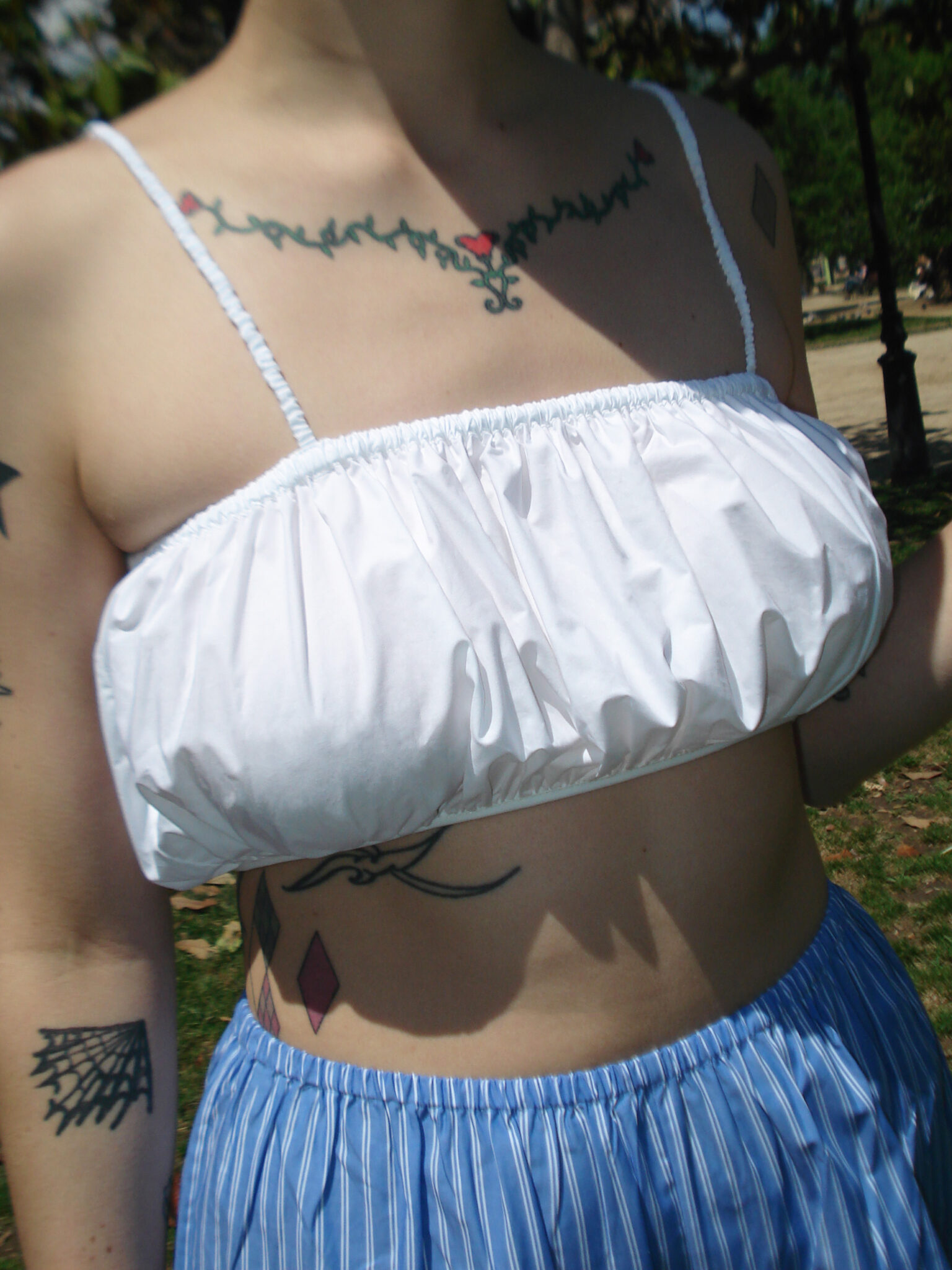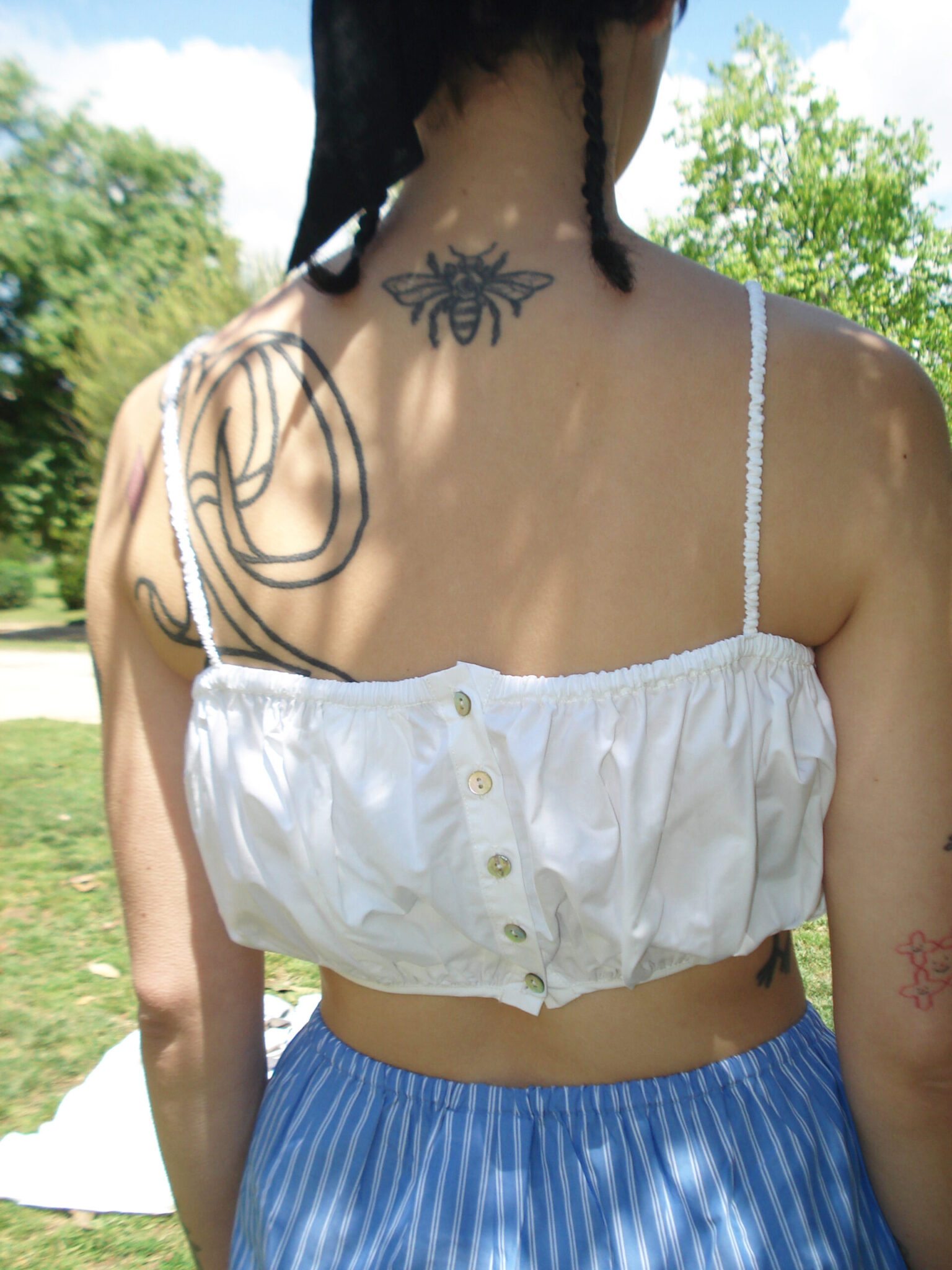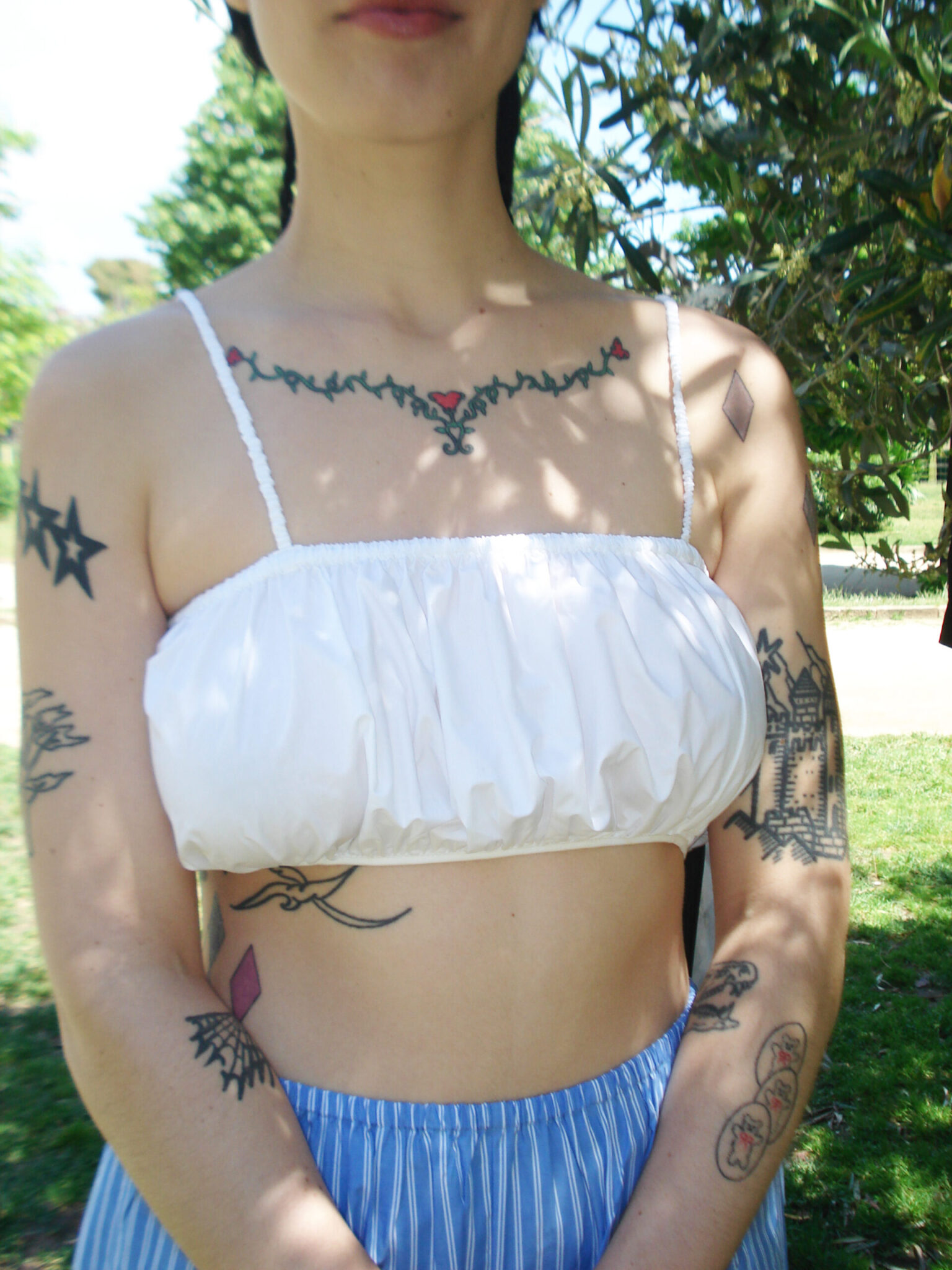 The Marlowe bralette top in white features a minimalist design with gathered fabric around the bust. The back of the top is accented with a row of buttons to secure it. Made from lightweight, breathable cotton. It is also available in light blue.