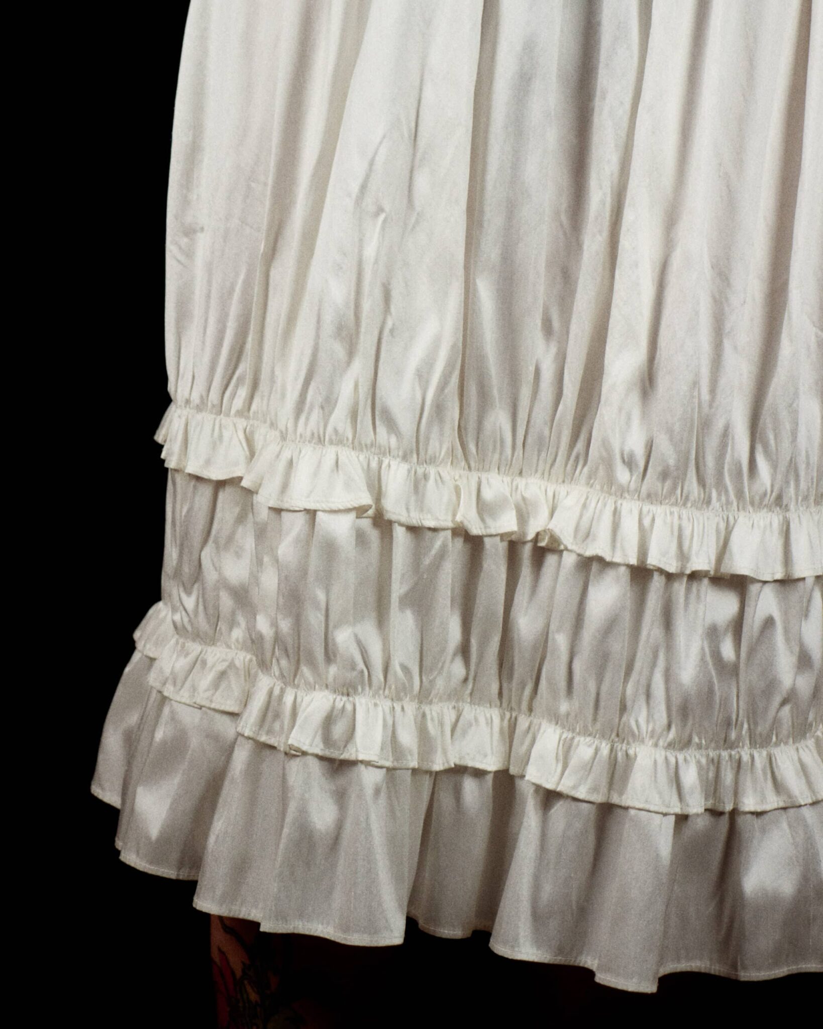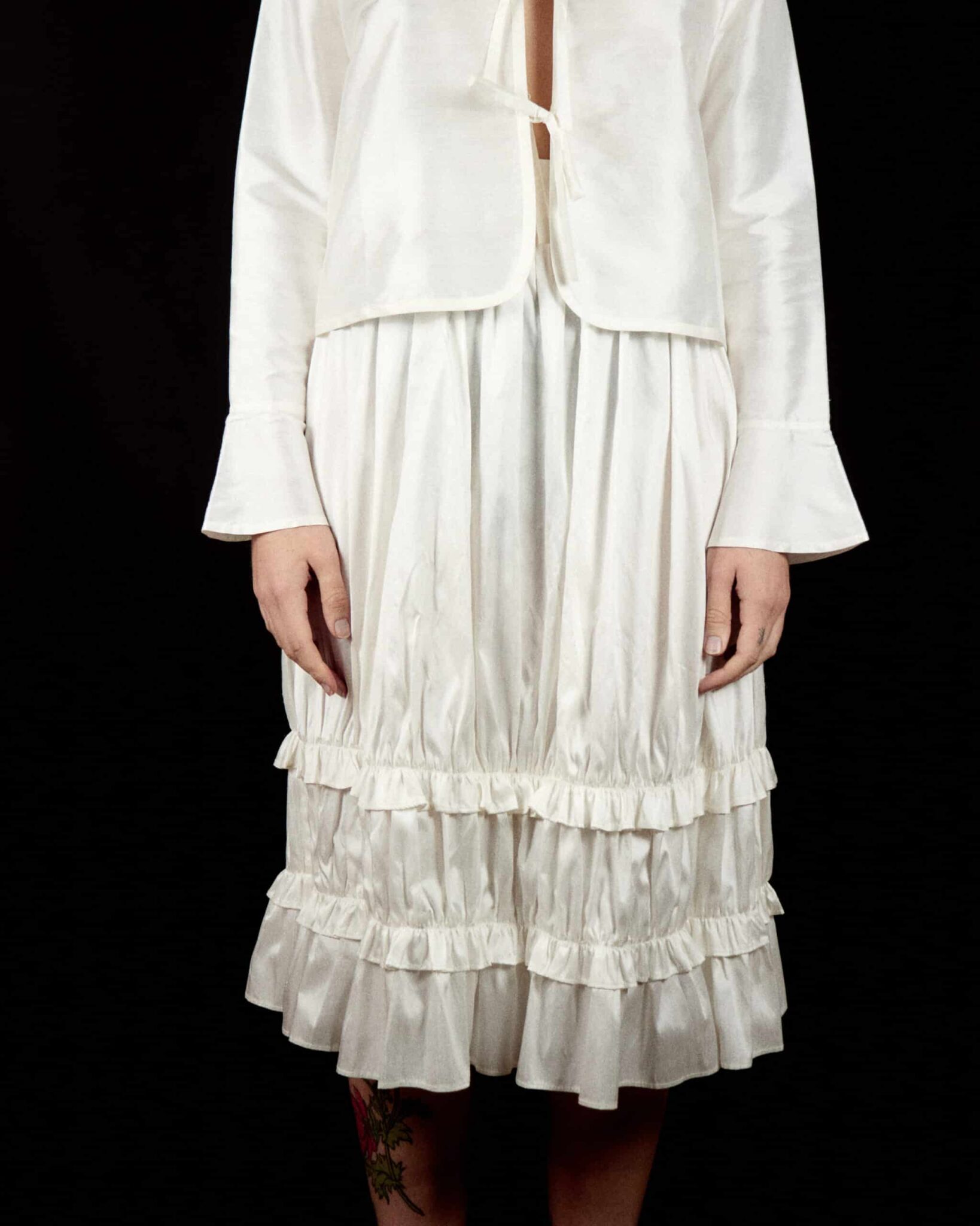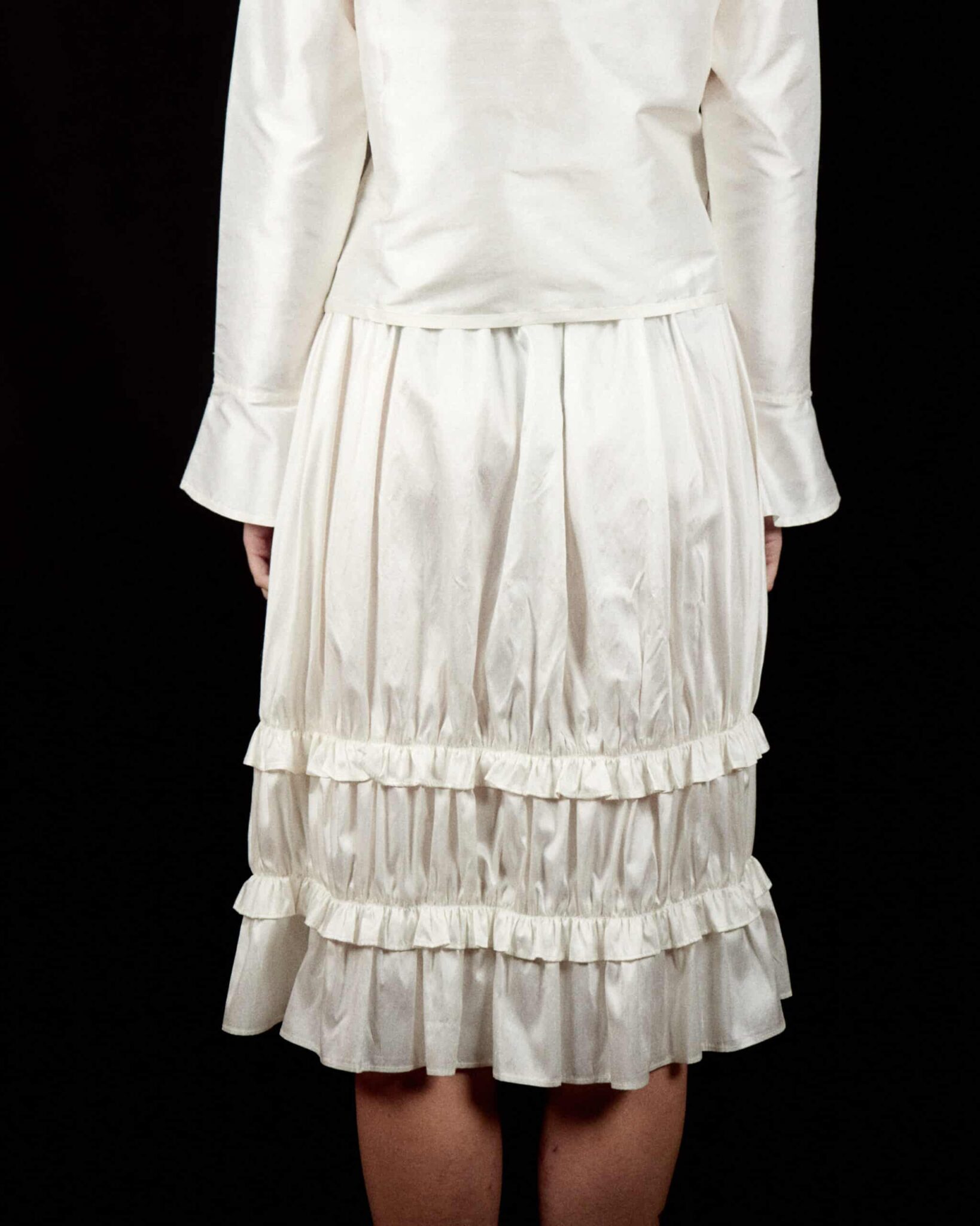 Pure nostalgia springs to mind when wearing the Maud skirt, childhood memories of dressing up with friends and dreaming of the future. Handcrafted in London from dupion silk, Maud sits high on the waist and features a double-layer ruffle hem. To be worn with wooly tights, over trousers or brave bare legs.