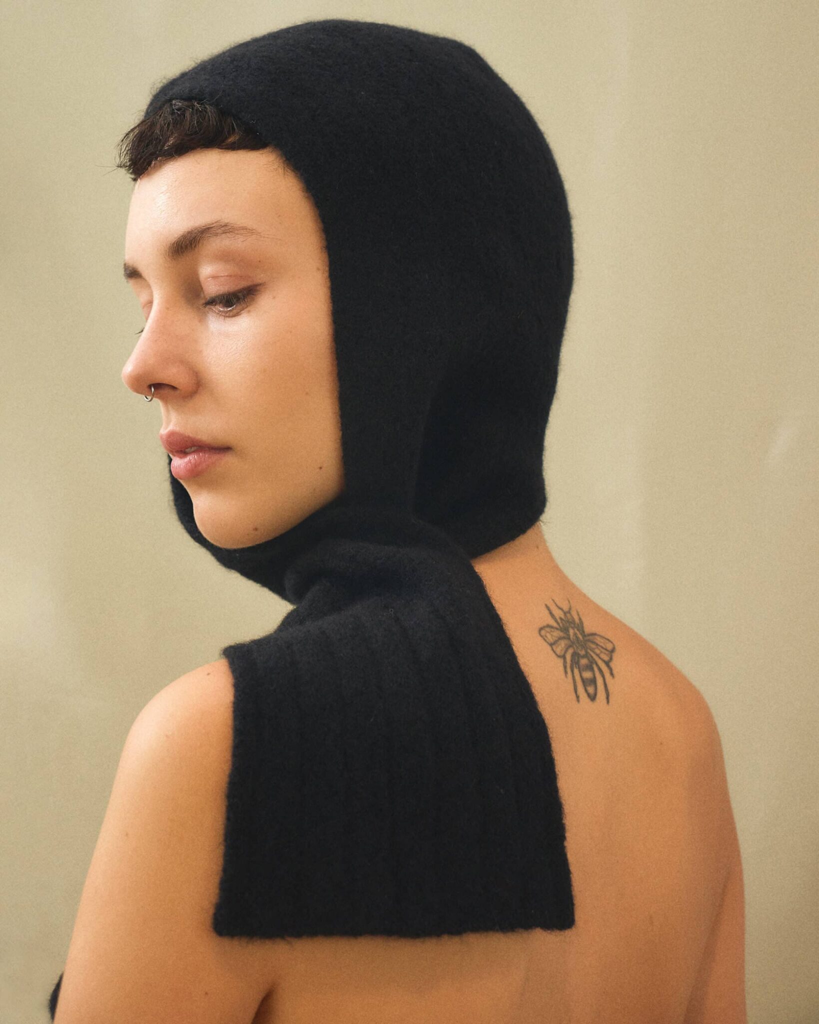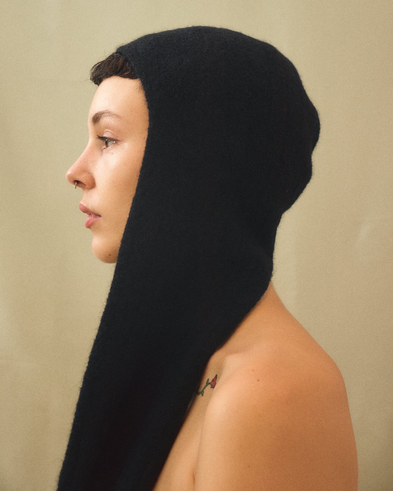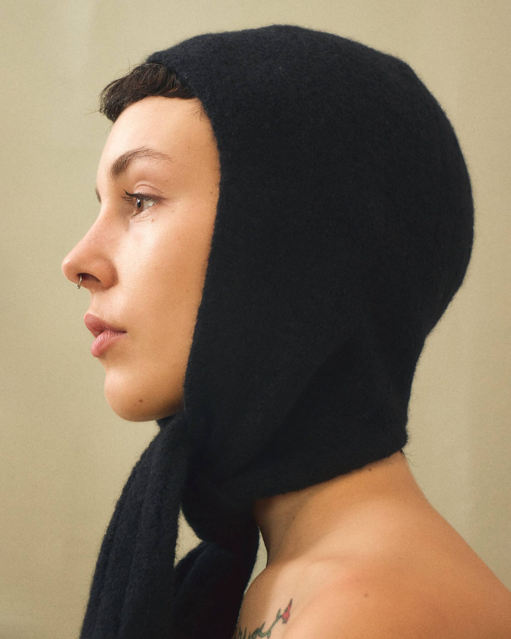 Ribbed hood-scarf knitted from a fuzzy alpaca-wool blend yarn featuring extended trims at sides to be tied under the chin or worn loose.