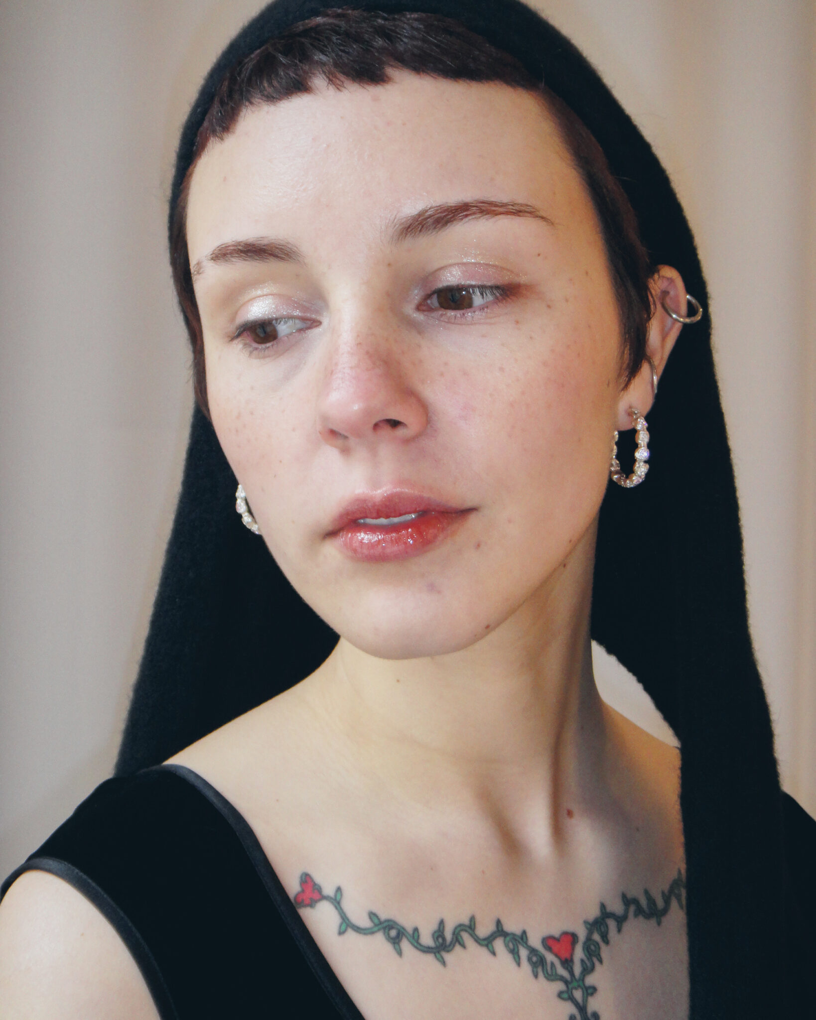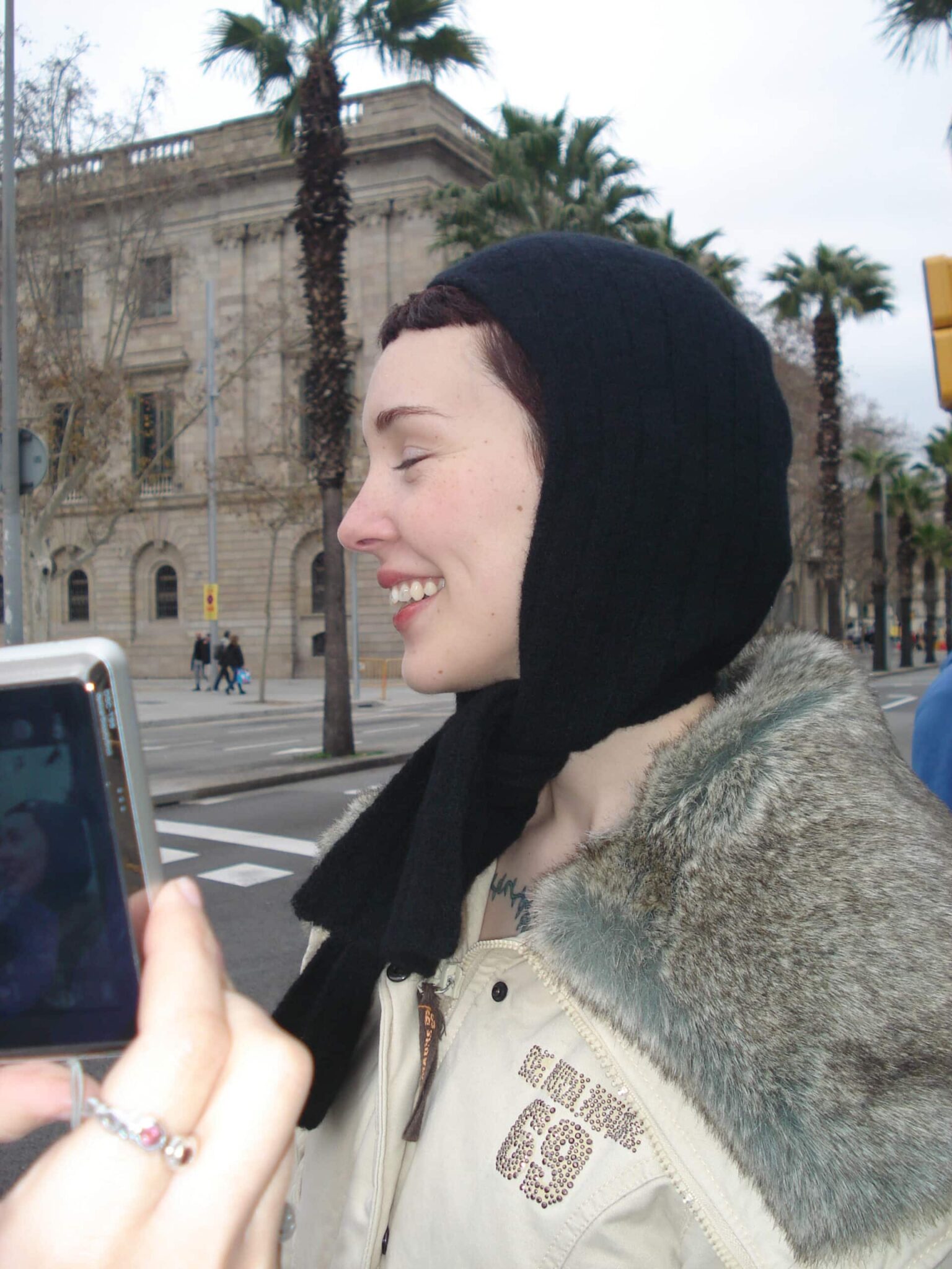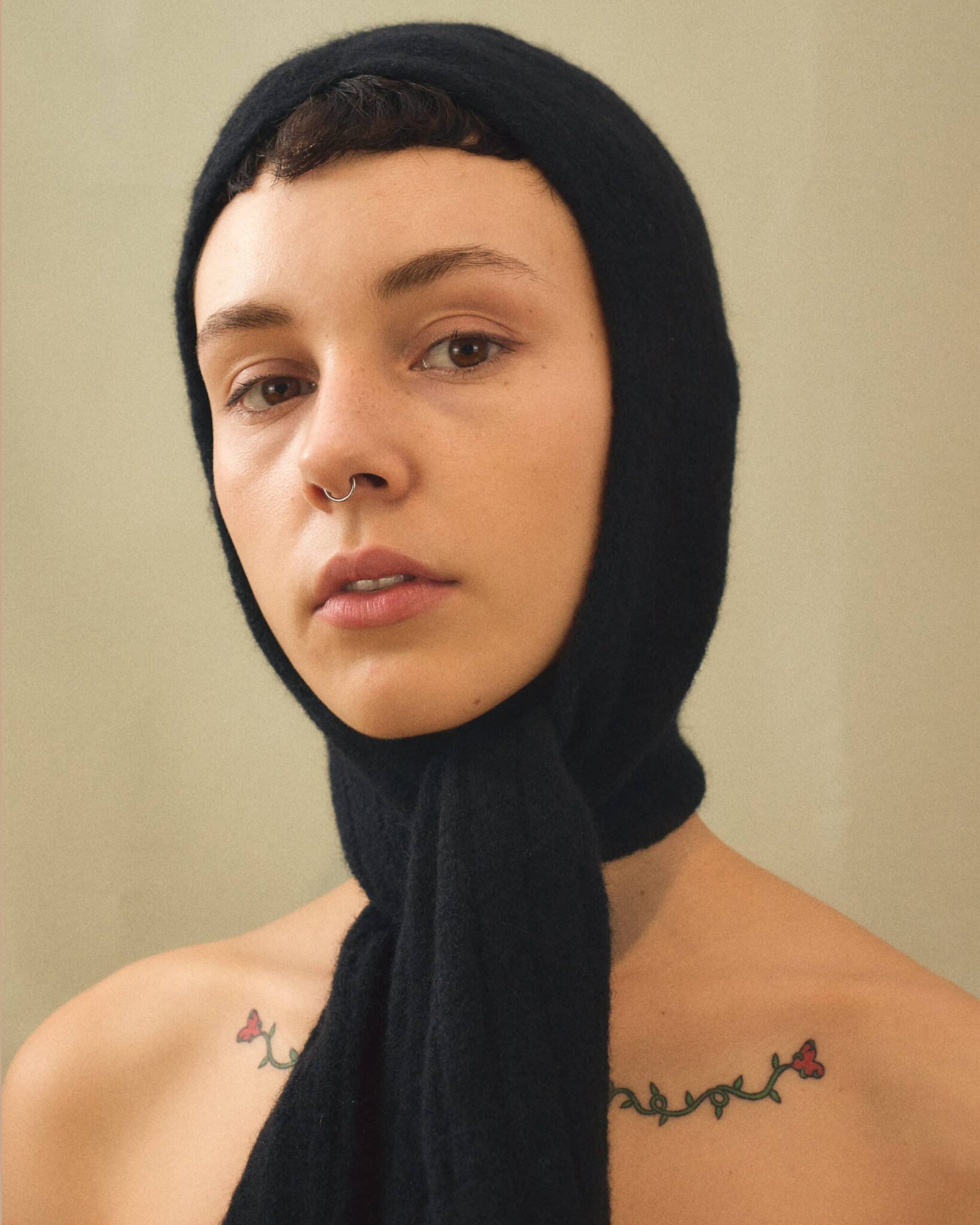 Ribbed hood-scarf knitted from a fuzzy alpaca-wool blend yarn featuring extended trims at sides to be tied under the chin or worn loose.