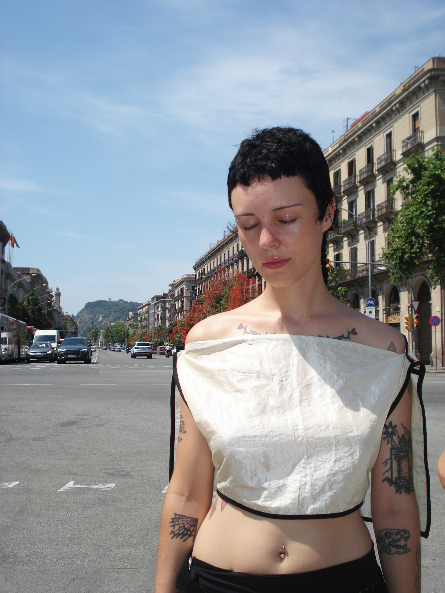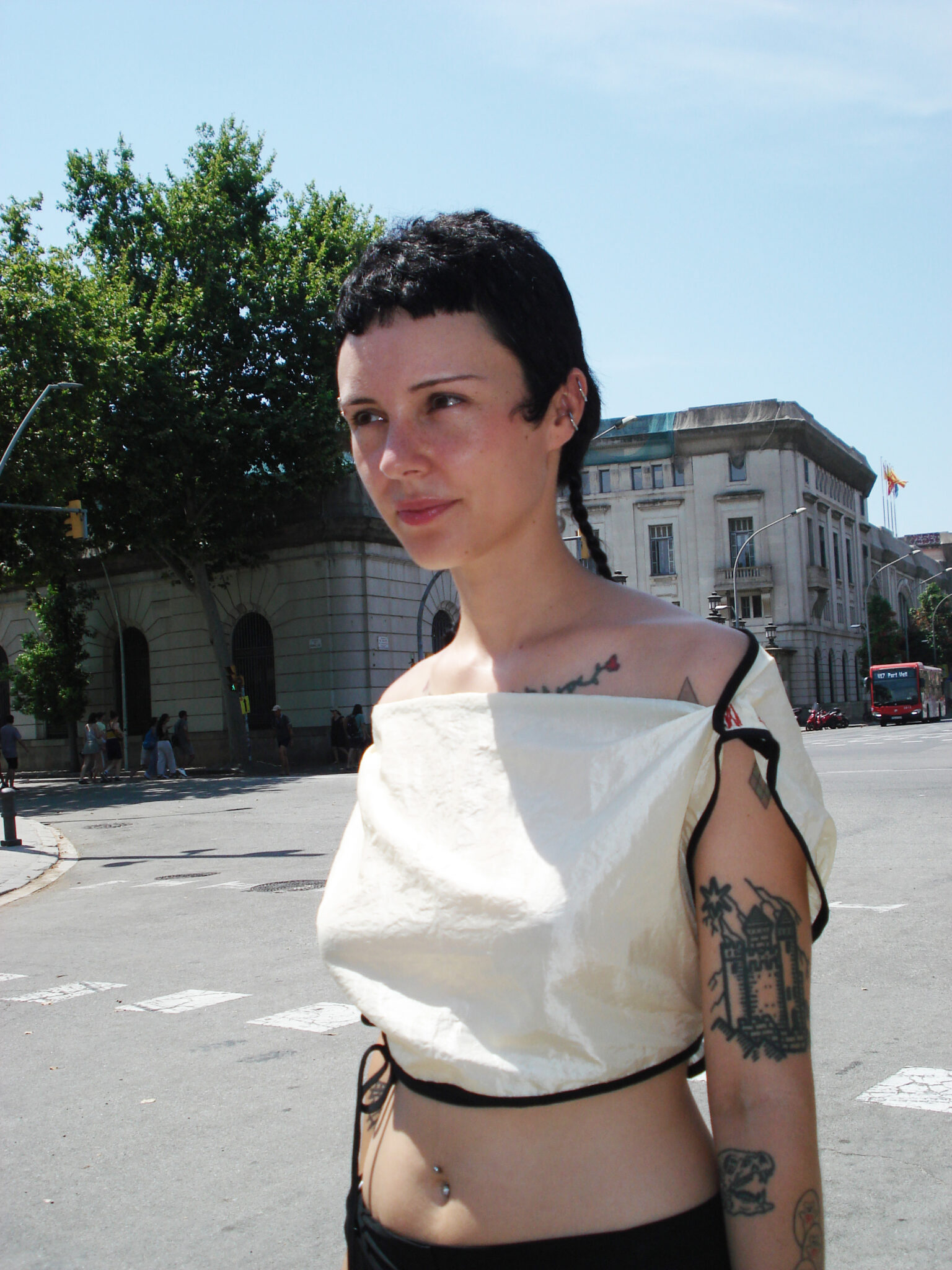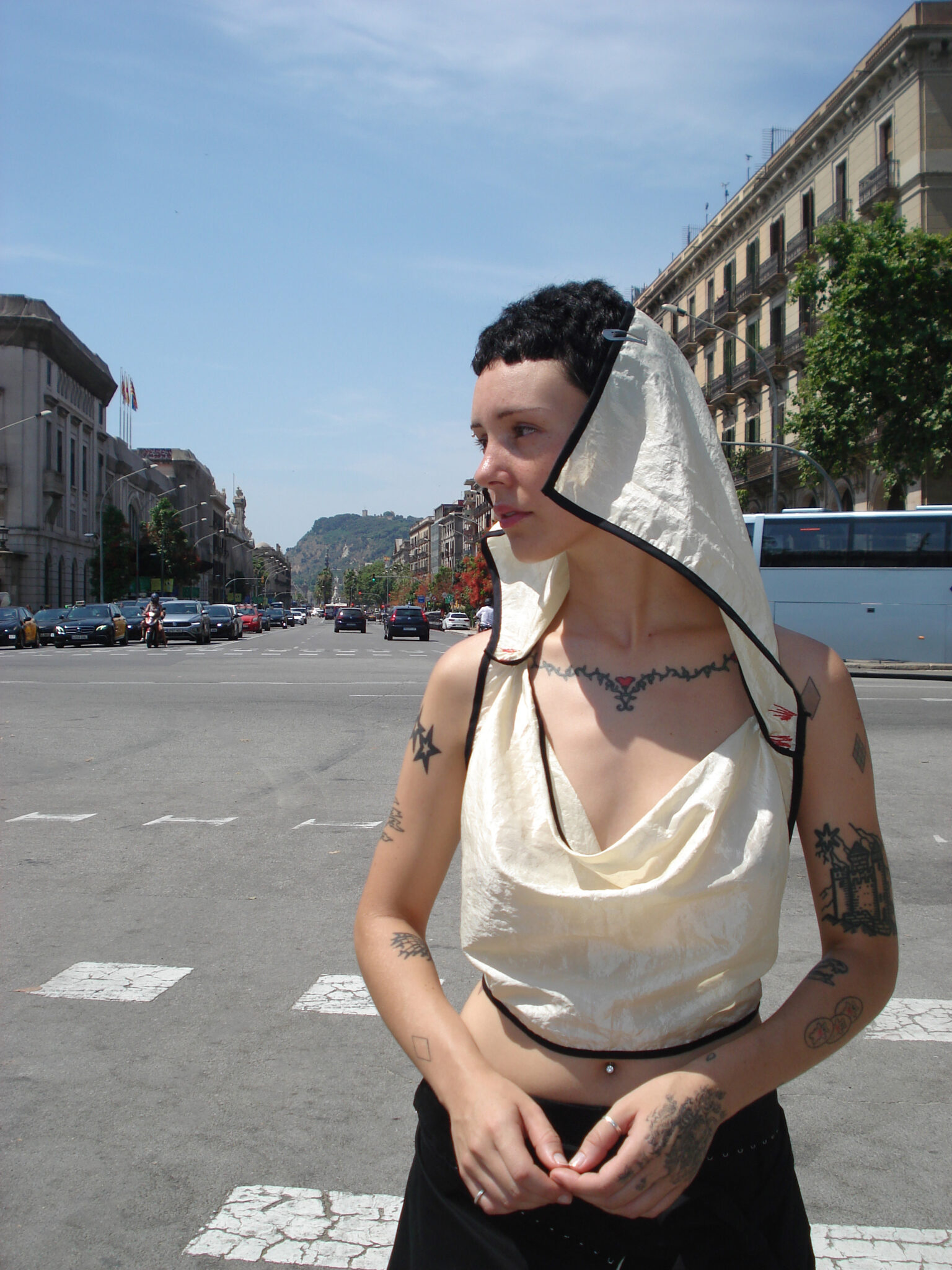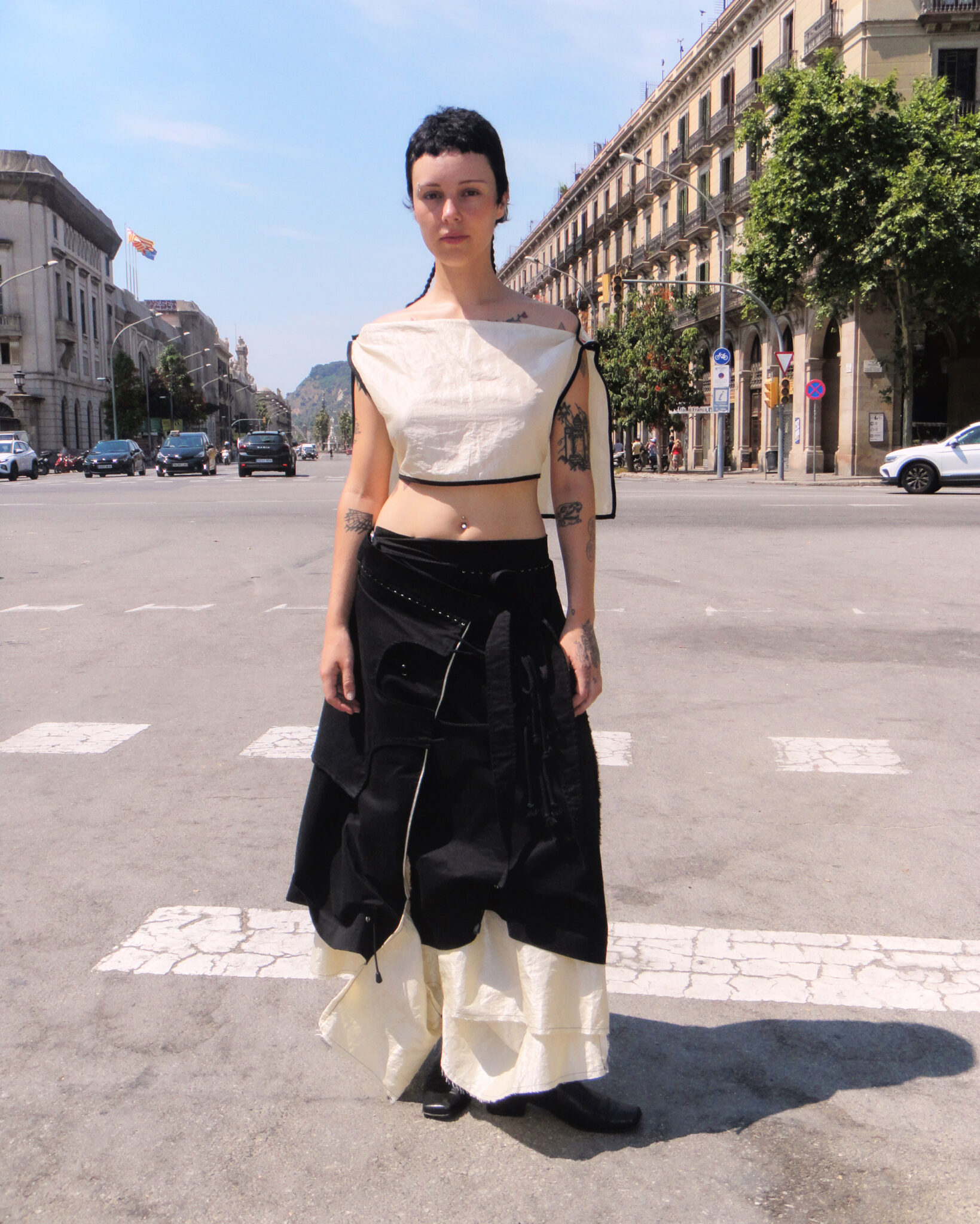 Multi-function piece crafted from vanilla taffeta with black piping. Features red stitching details and a hand-stitched rectangular label.