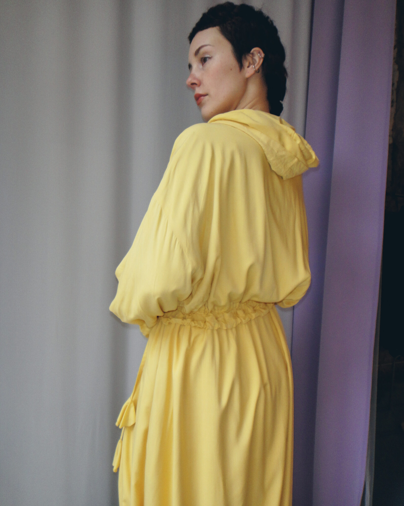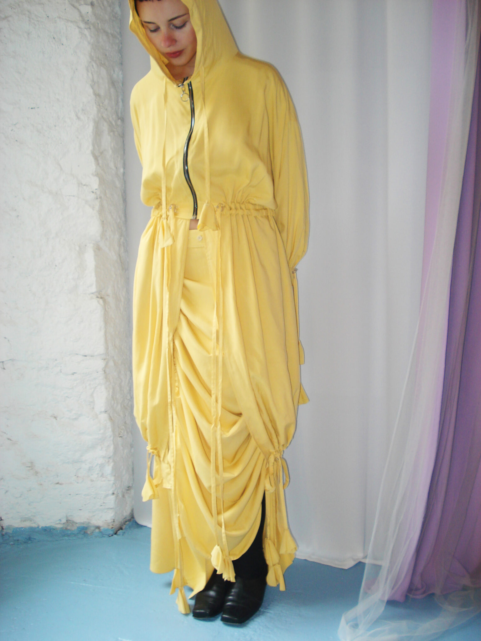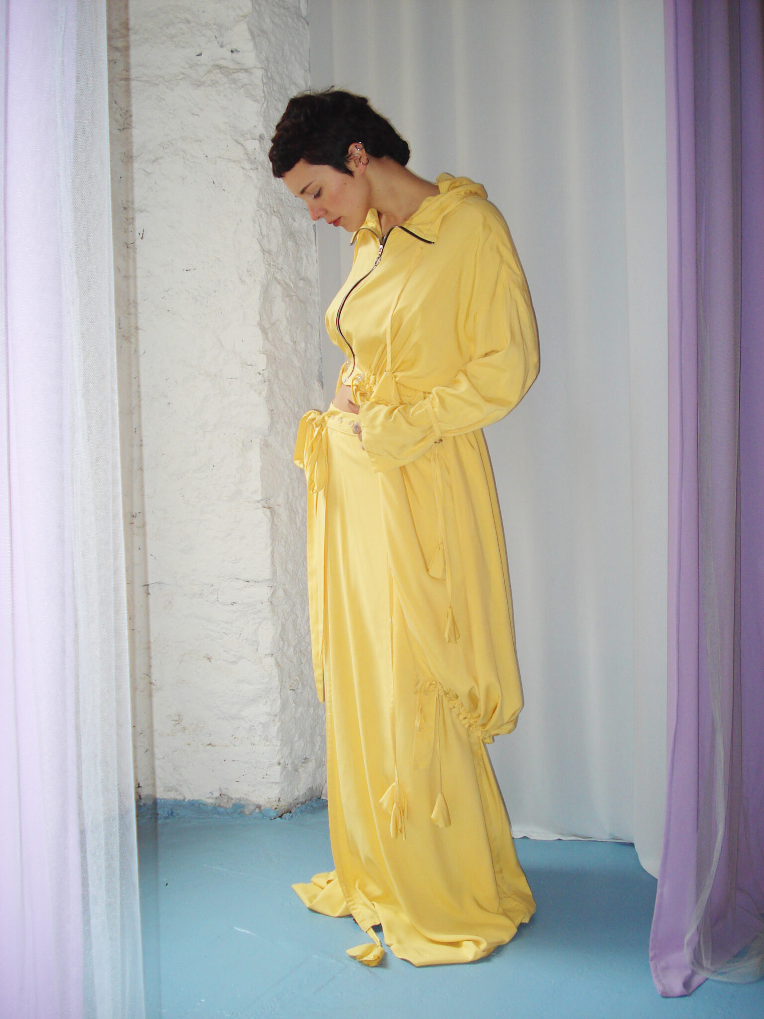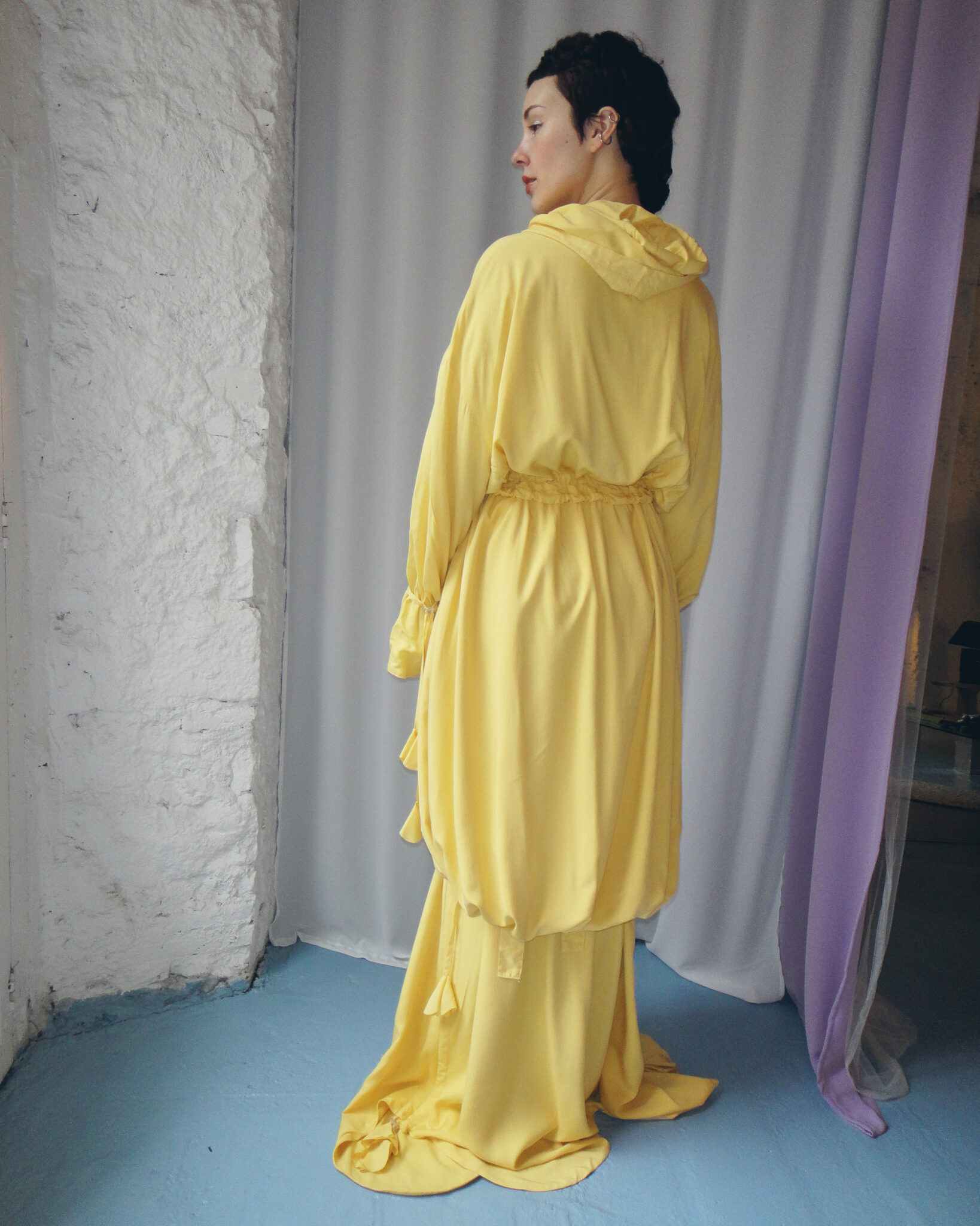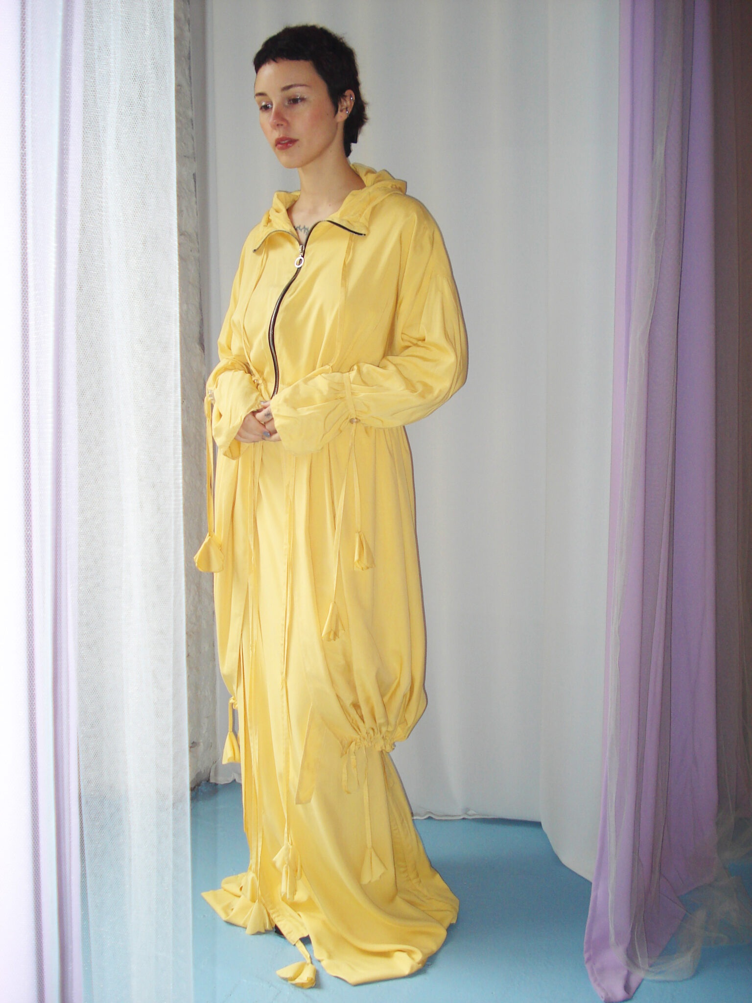 Oversized dust coat crafted from double-layer yellow viscose fabric. Flowing long-sleeve design. Hood and neckline adjustable with ties. Central zipper closure. Adjustable waist and hem. Interior features straps and ties for fastening.