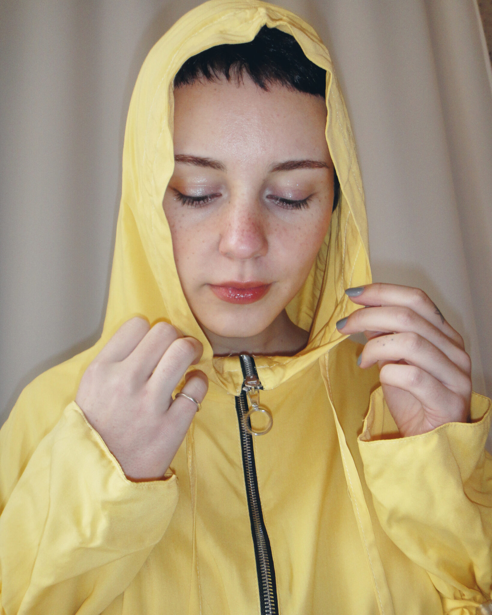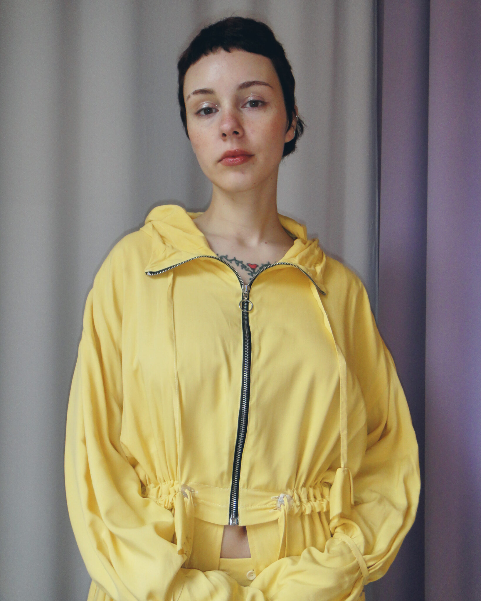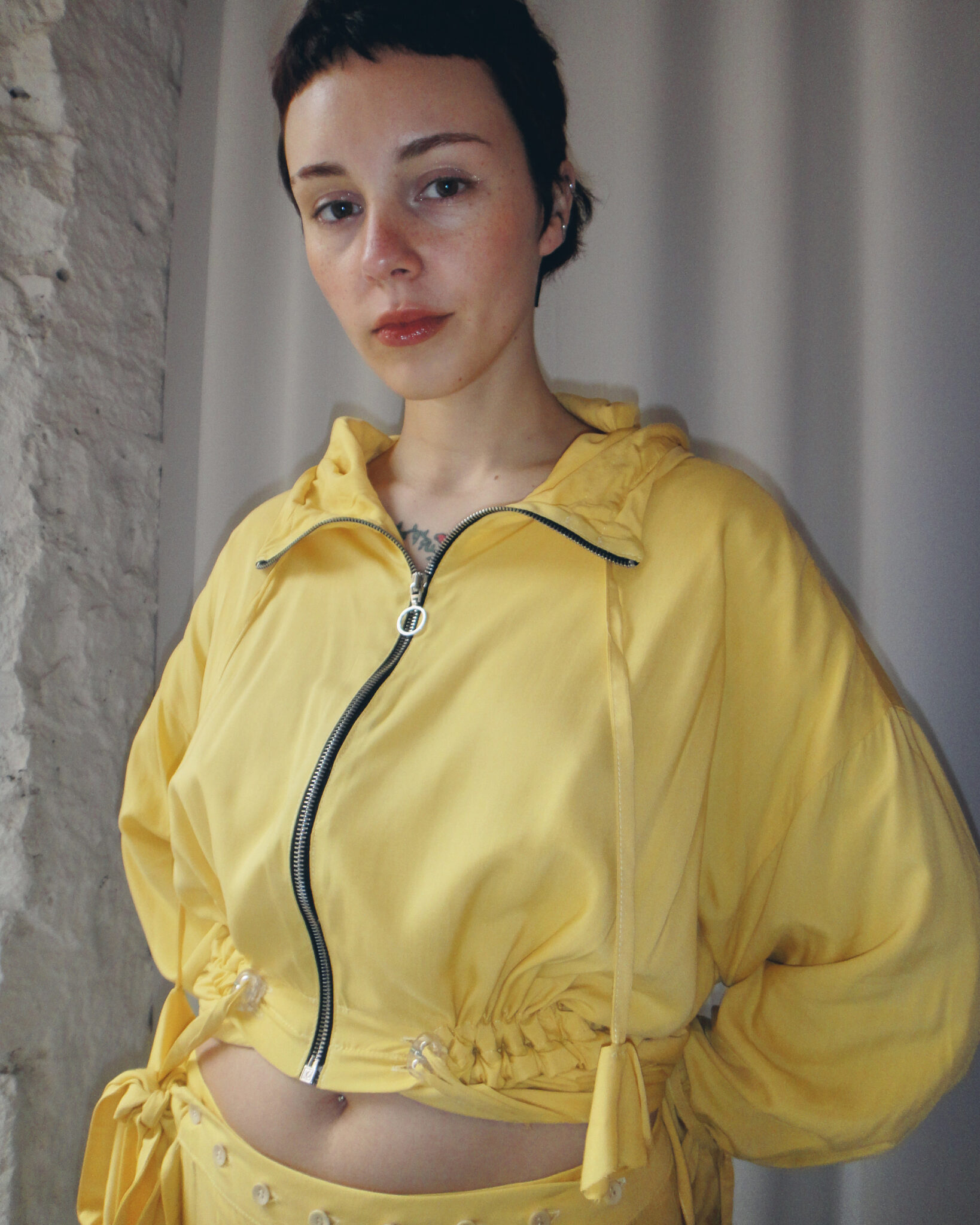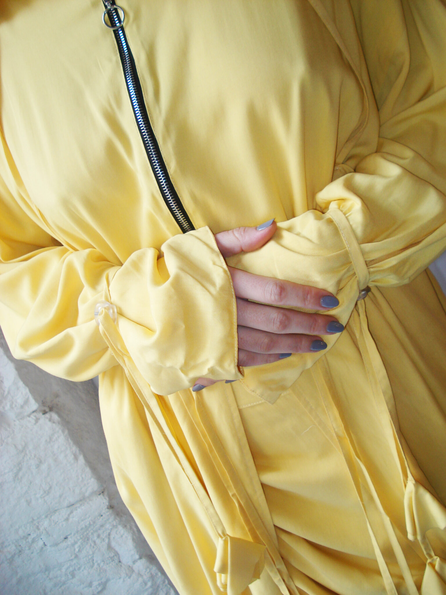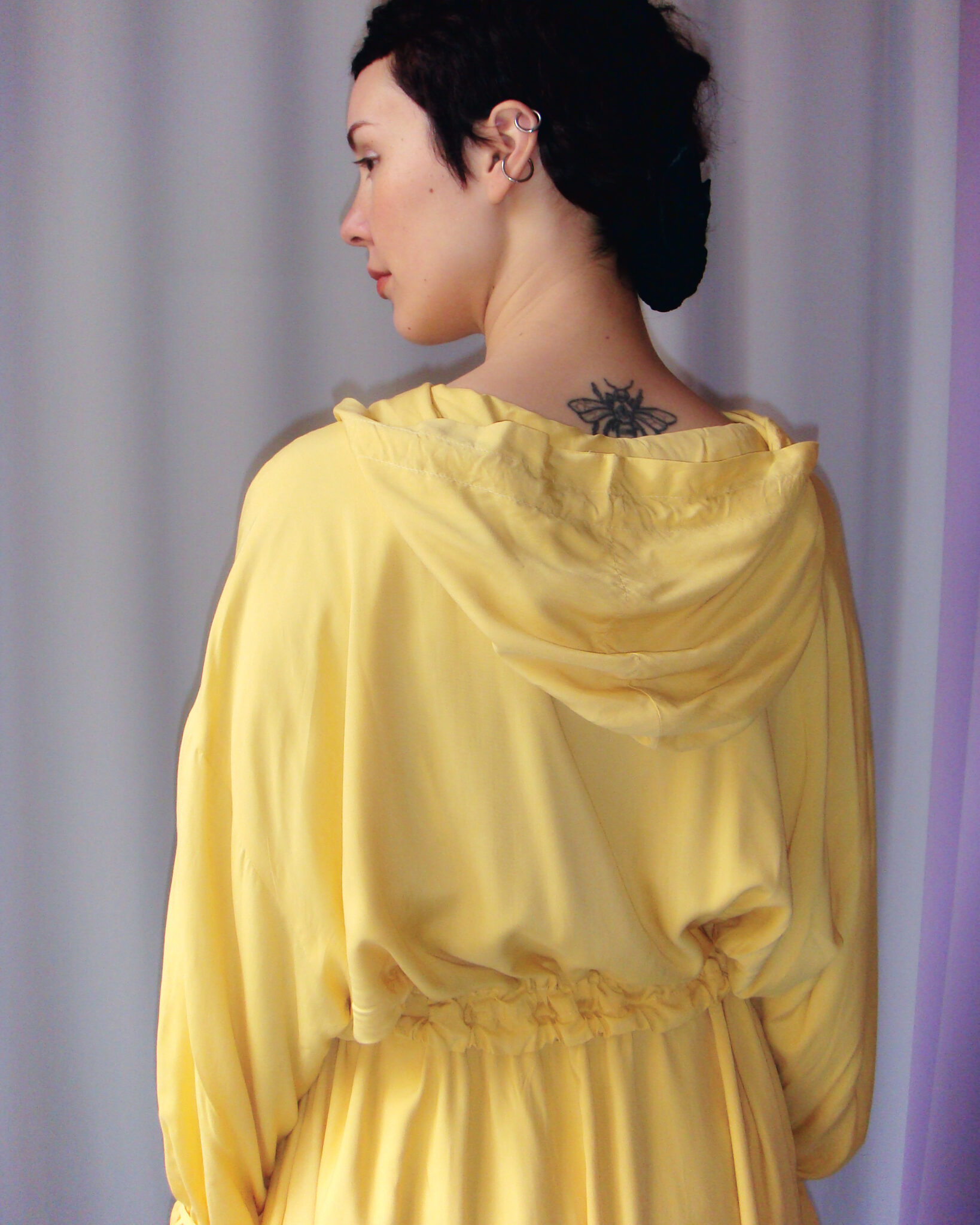 Oversized dust coat crafted from double-layer yellow viscose fabric. Flowing long-sleeve design. Hood and neckline adjustable with ties. Central zipper closure. Adjustable waist and hem. Interior features straps and ties for fastening.