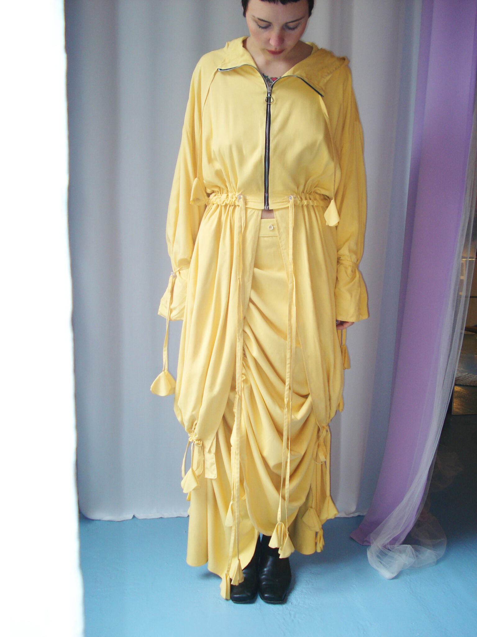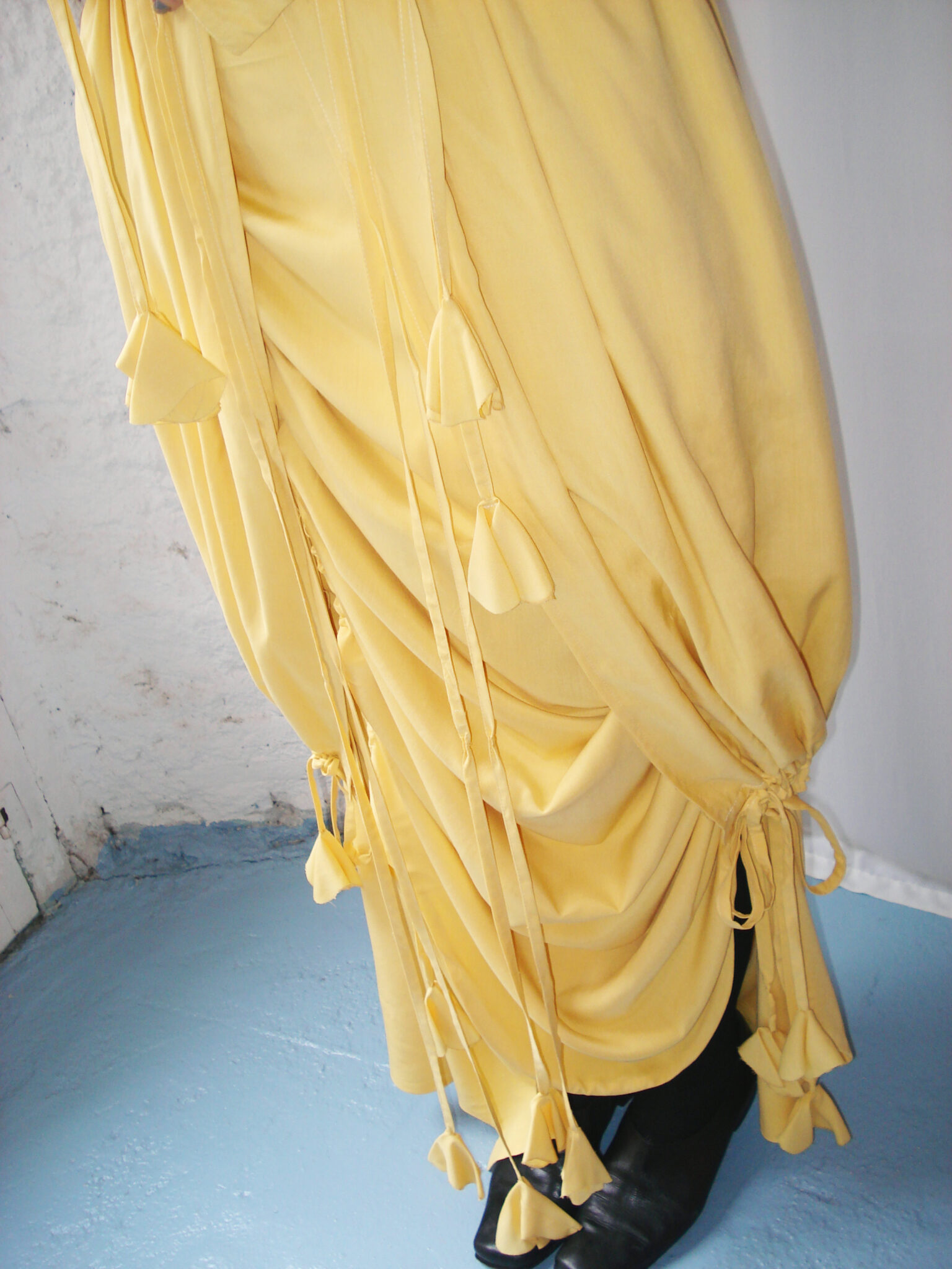 Extra-long skirt crafted from double-layer yellow viscose fabric. Adjustable waist with a tie and eight front buttons. Sides feature drawstring-style ribbons for gathering.