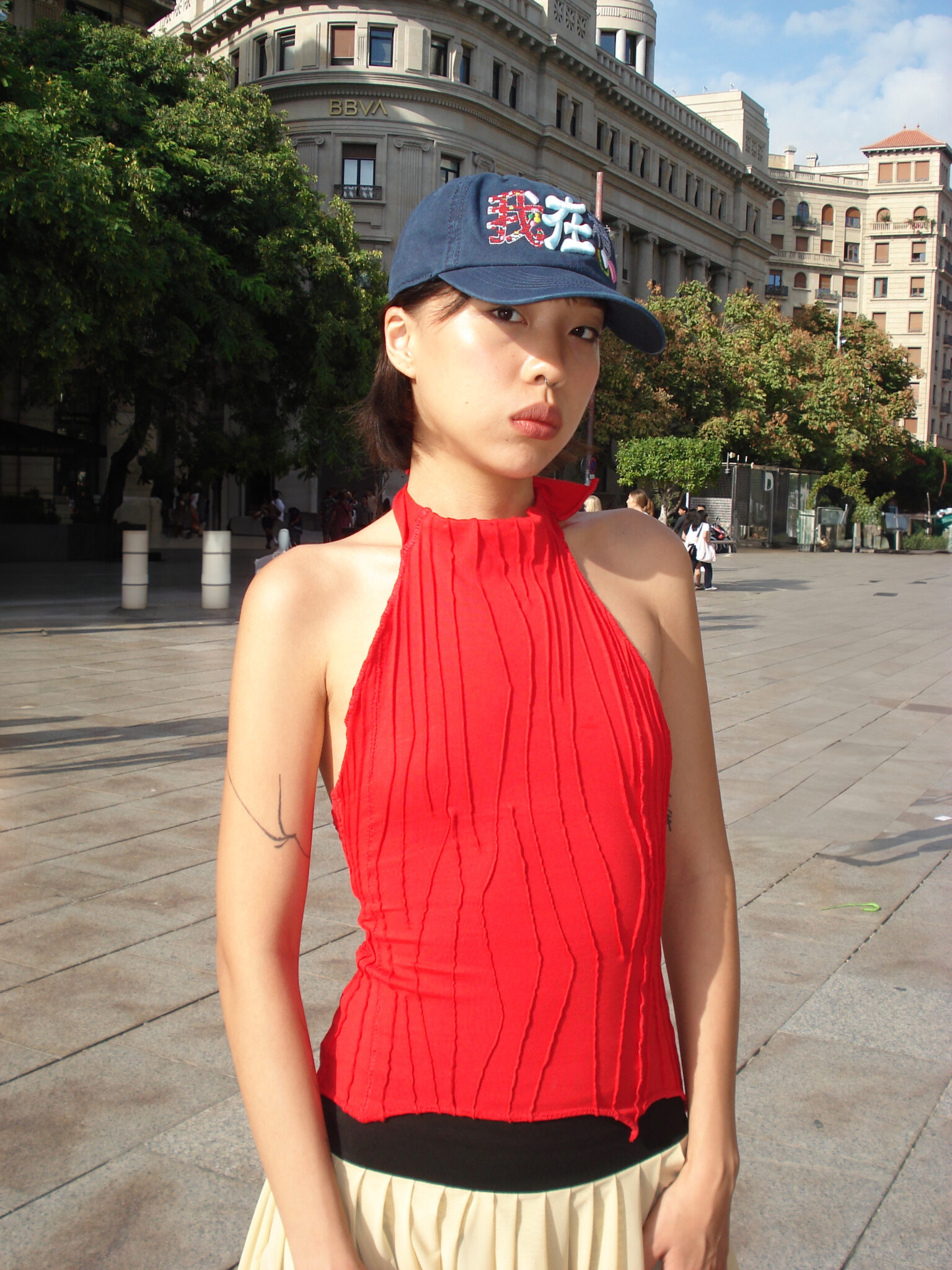 Fitted halter top with adjustable strap at the neck. Open back and asymmetric scraps bottom. Unique handmade suture formation on each item. Assembled from the fabric scraps and ‘cut-offs’ of production. Finished garments may vary due to artisanal manufacturing.