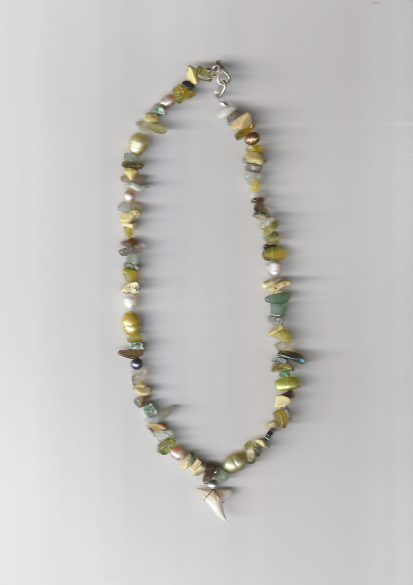 This necklace is made with different natural stones and freshwater pearls, featuring a shark tooth charm.