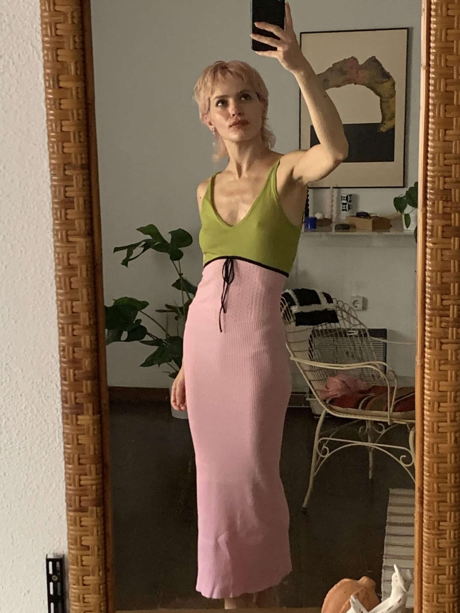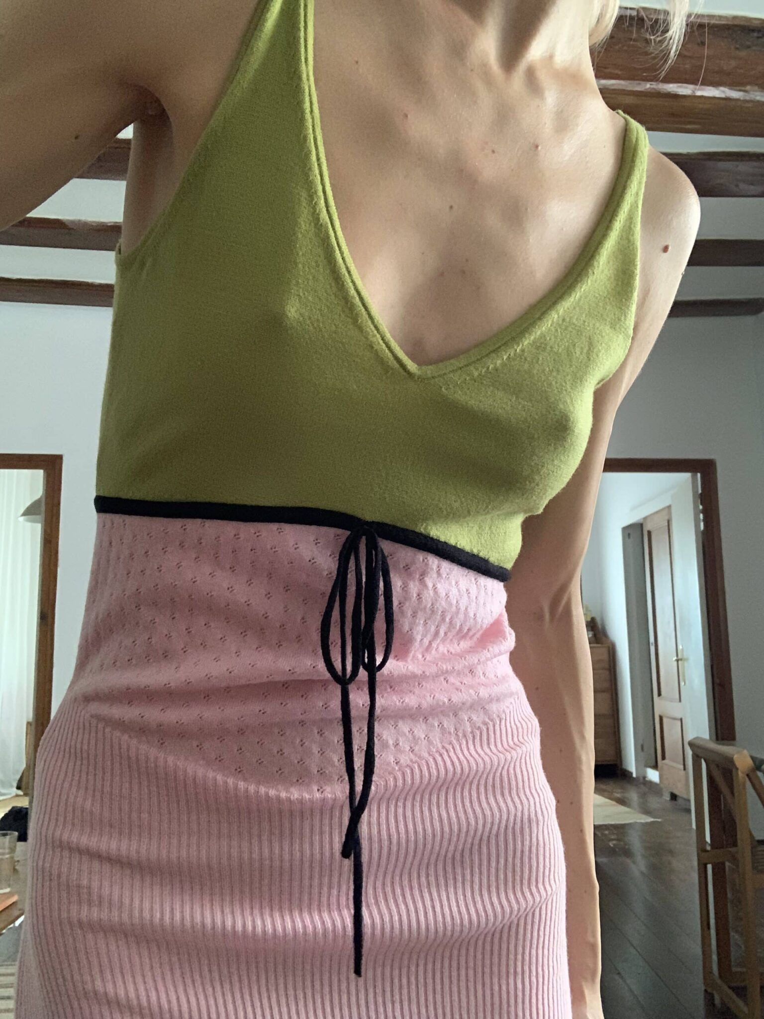 The Sigourney dress is a close-fitting knitted dress made from 88% extra fine merino wool. The delicate pattern and ribbed knit draw attention to the detail of the garment. The olive green and black waistline contrasts the softness of the pastel shade of pink.