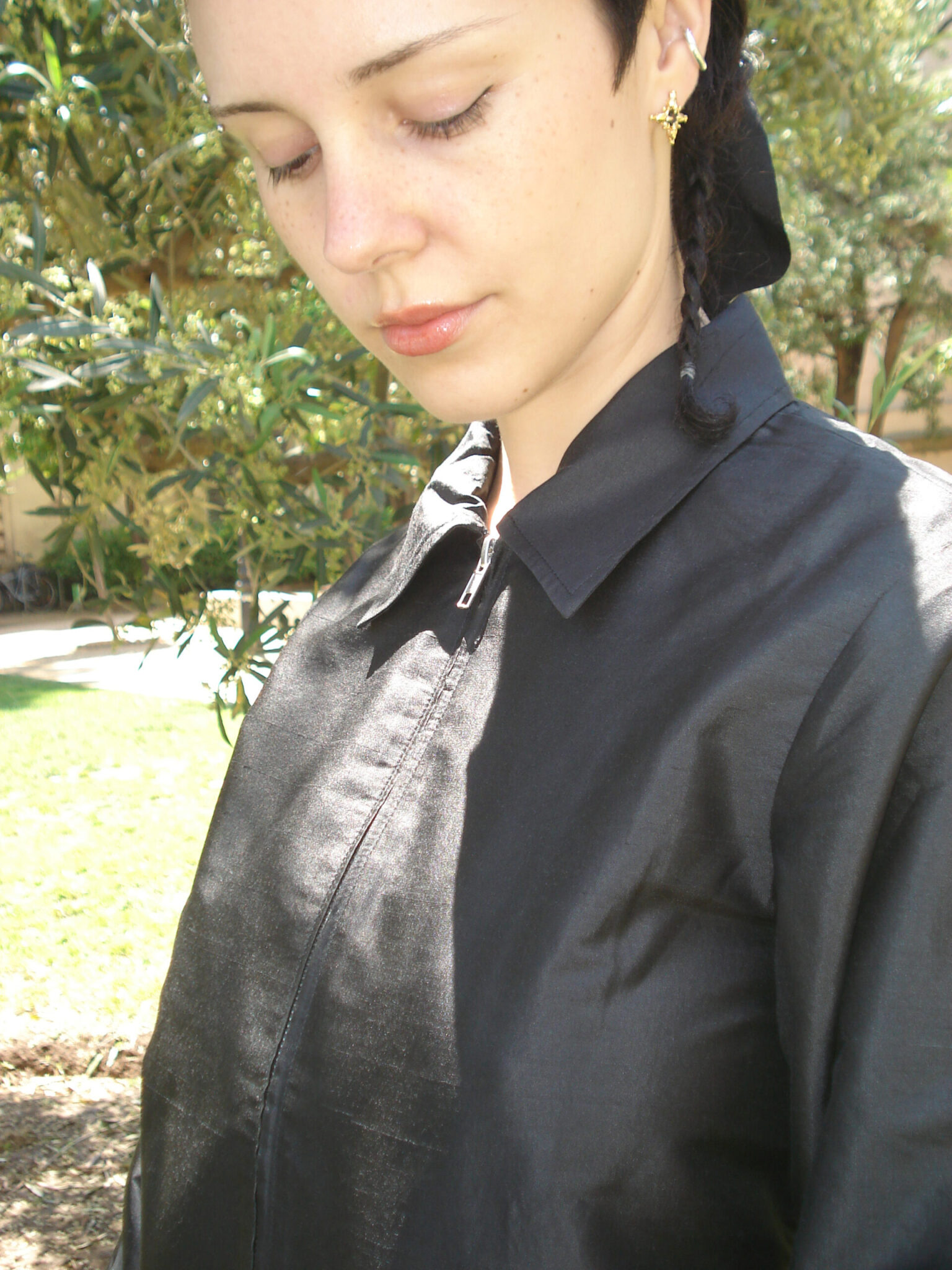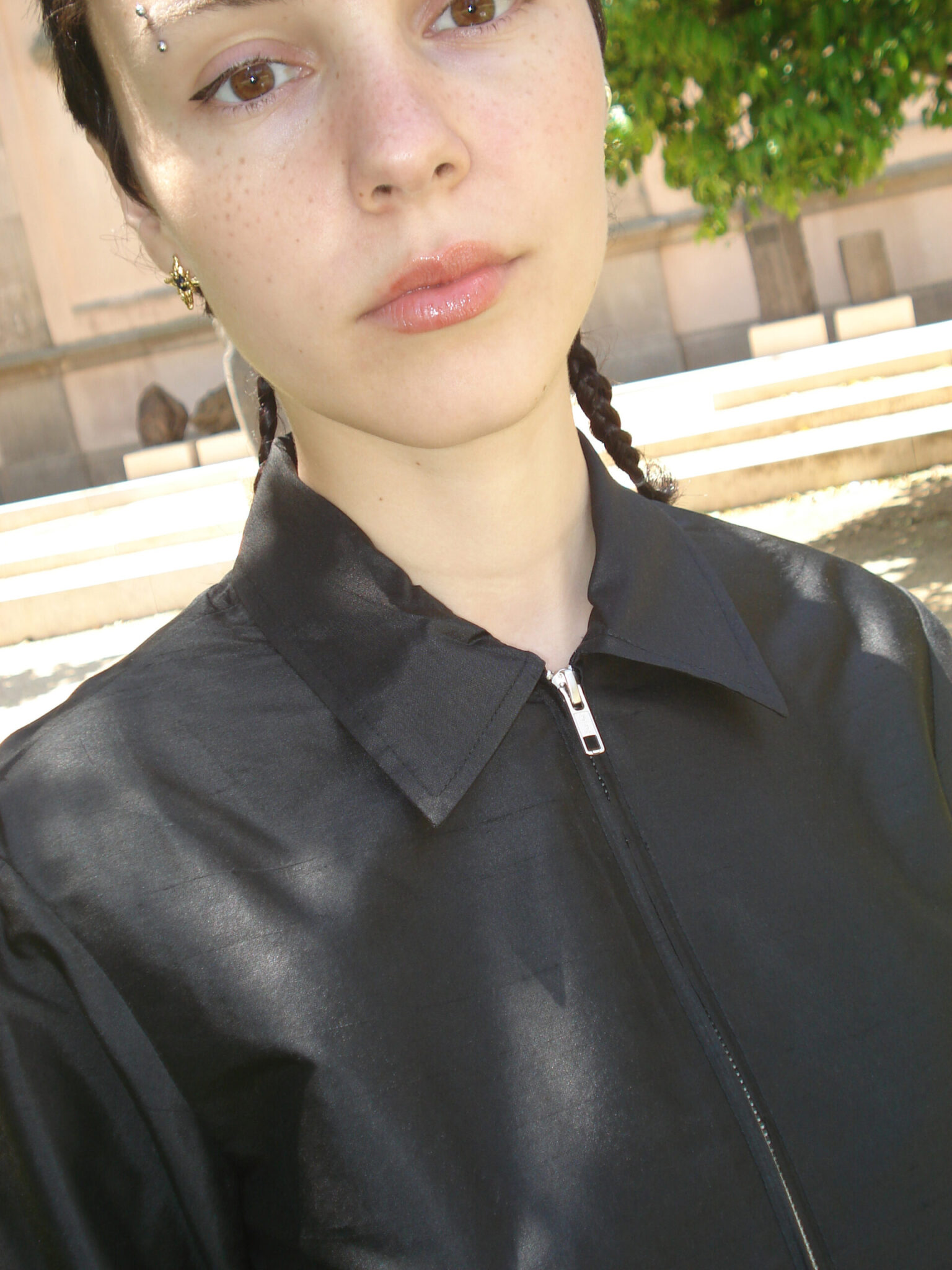 The Tamina Jacket in black is crafted from Dupion silk. It features a full-length front zipper, a flat ruffle at the bottom, and a structured collar. It has a slightly fitted silhouette, making it ideal for layering over a single garment. The jacket is also available in silver colour.