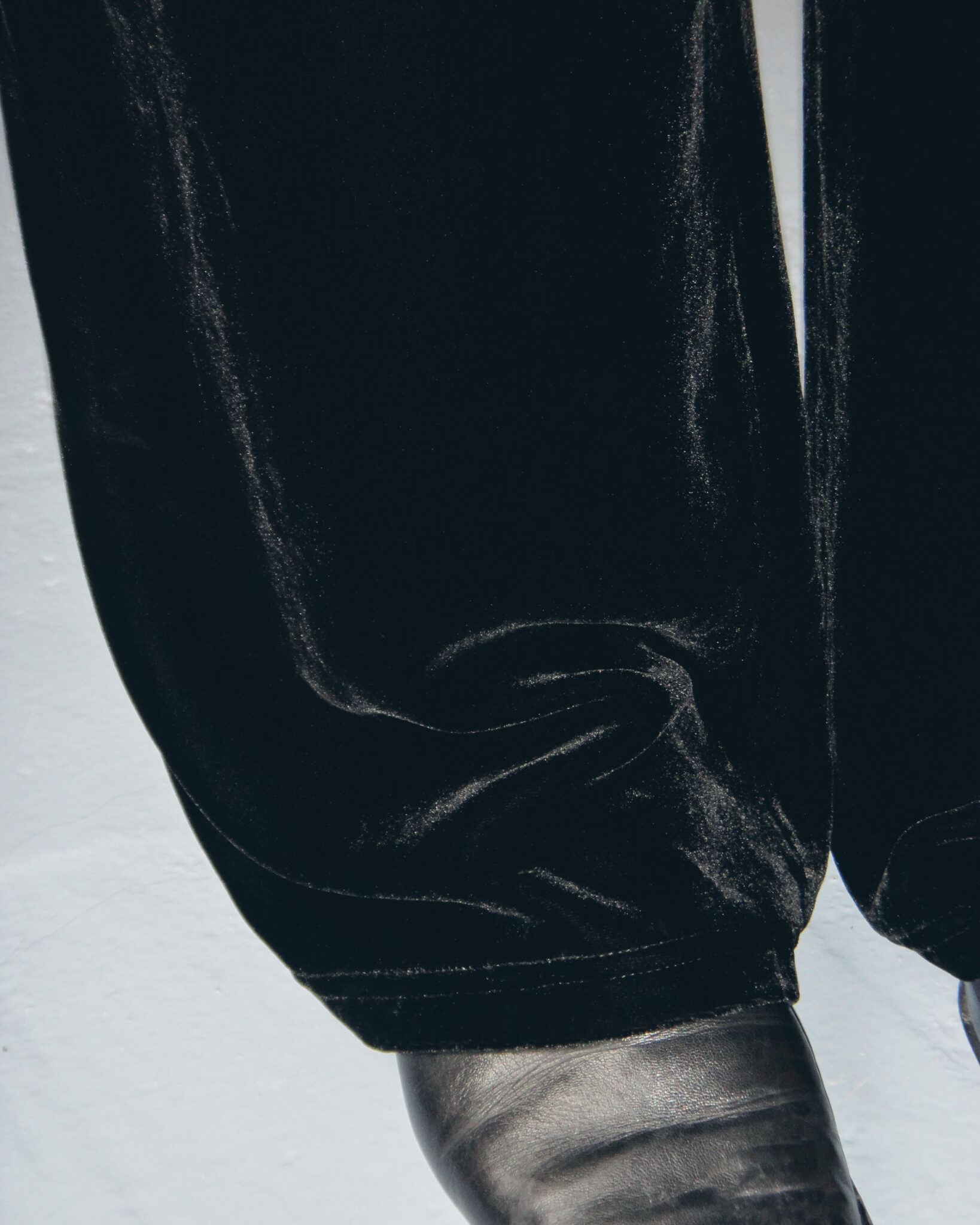 The Ulla trousers in black are made from soft plush velvet and cut for a comfortable fit, with a high waisted elasticated waistband. They fall to a straight leg that holds a relaxed shape.