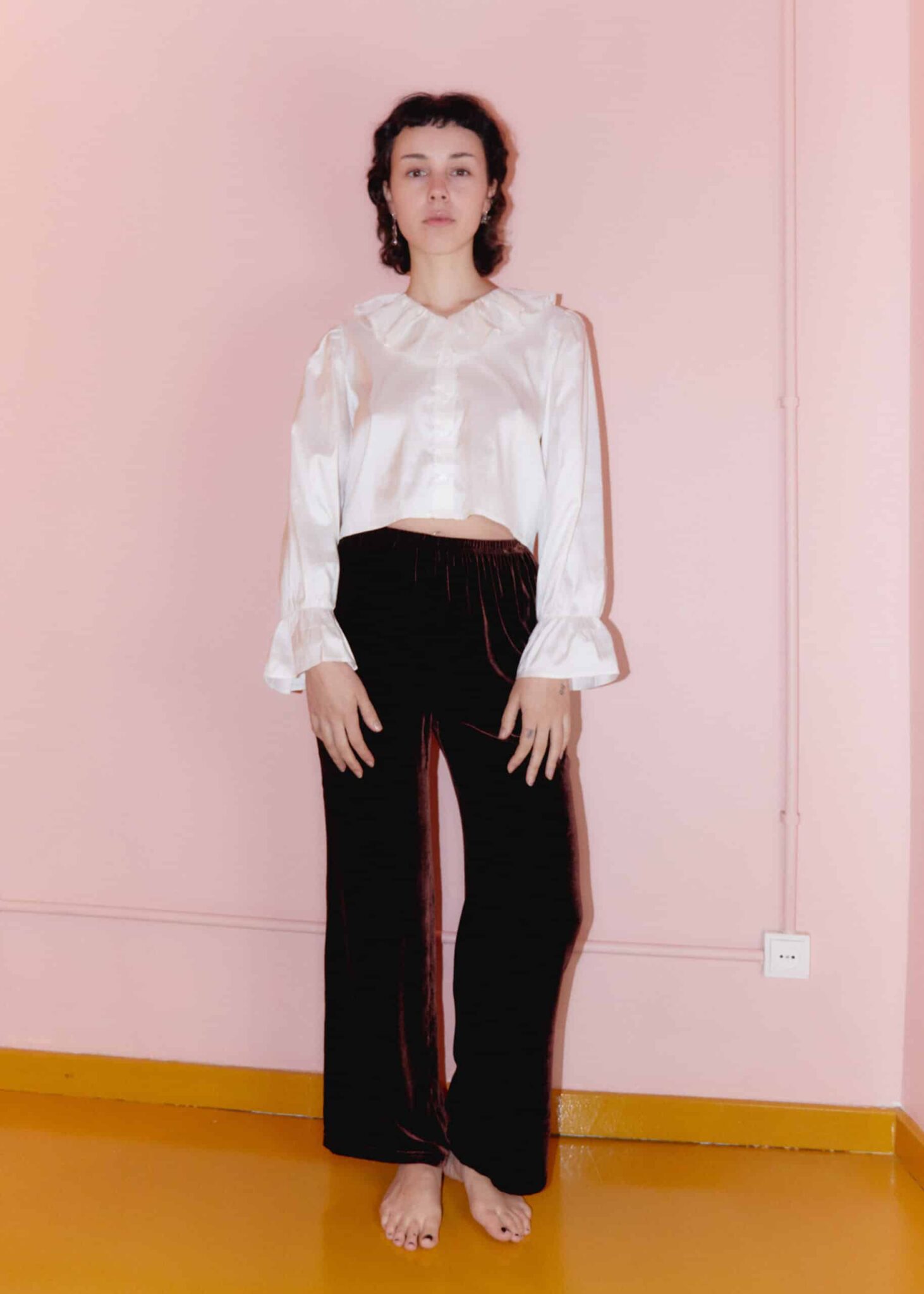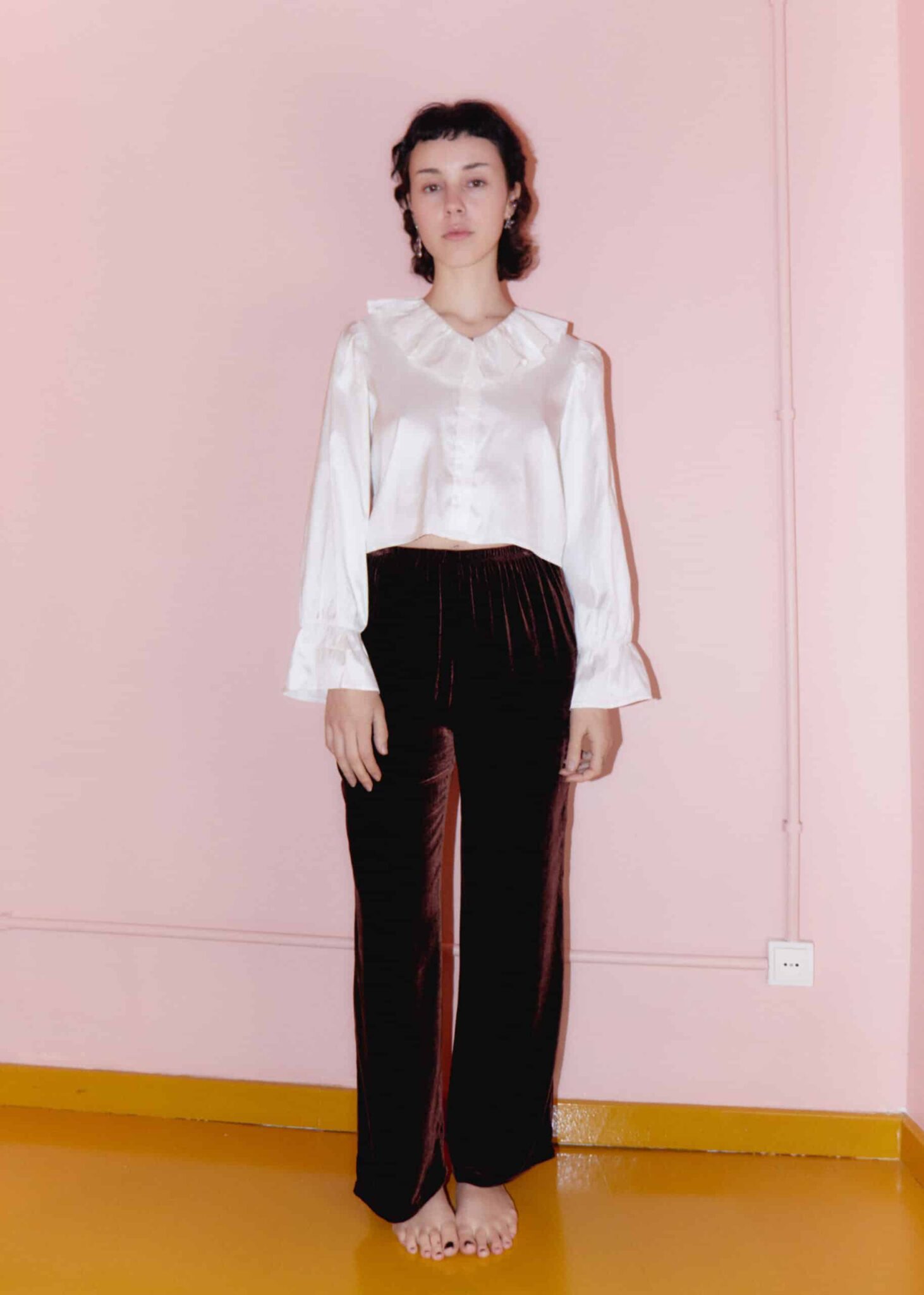 The Ulla trousers in brown are made from soft plush velvet and cut for a comfortable fit, with a high waisted elasticated waistband. They fall to a straight leg that holds a relaxed shape.